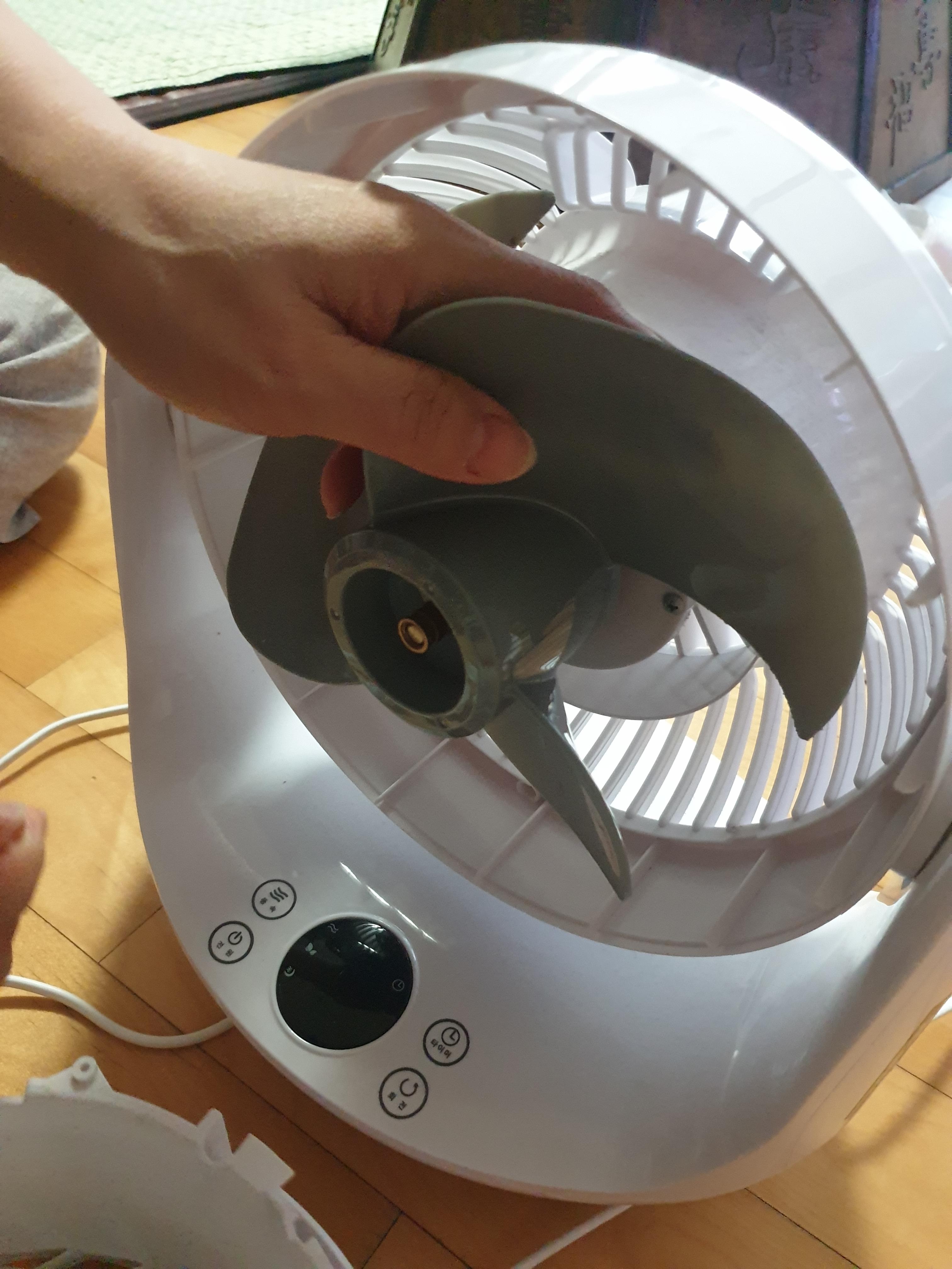 분해된 사진입니다. 이렇게 하면 앞쪽 써큘레이터 틀을 청소할 수 있고, 써큘레이터 날 가운데 나사를 풀면 회전 날도 분리해서 청소할 수 있습니다.