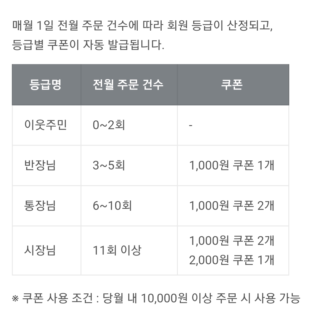 회원등급이 주민, 반장님, 통장님, 시장님이다. 통장님은 오랜만에 들어본다. 뭔가 공공배달앱의 느낌이 난다. 11회 주문하면 시장님이 될 수 있다!!!!