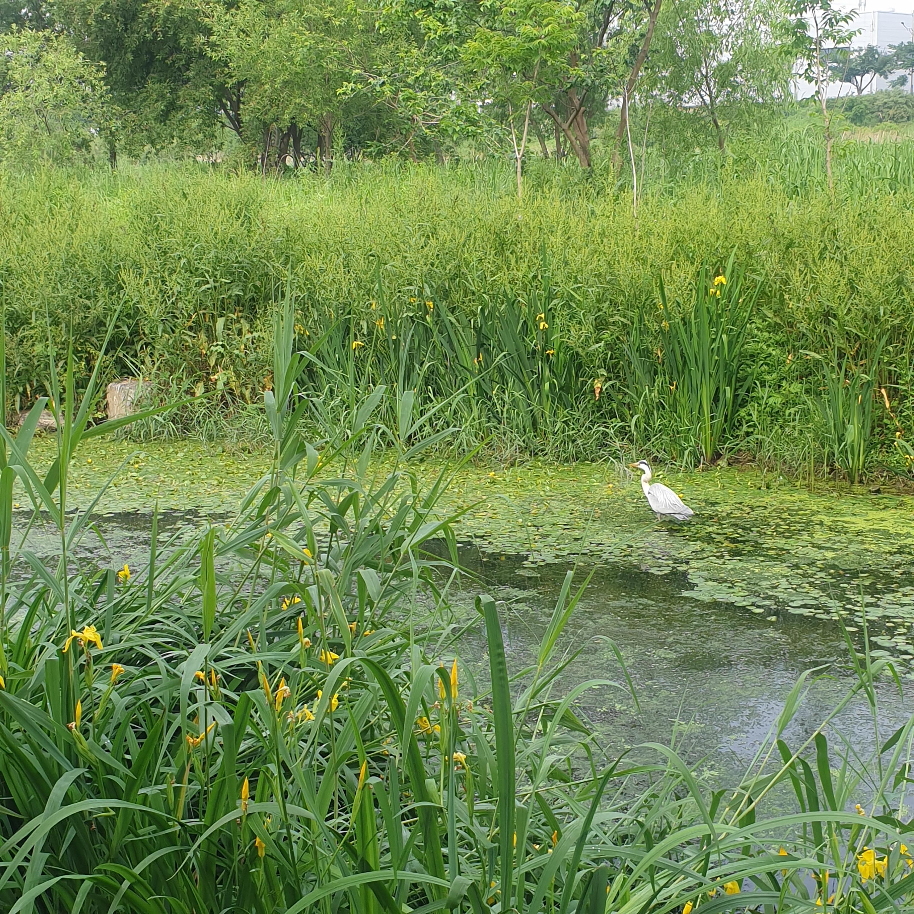 가까운 곳에서 만난 오산천은 생각했던 것보다 훨씬 다양한 모습이었어요. 물 위에 떠있는 건 어리연이고 물가에 노란 꽃은 창포꽃인데 아주 예뻐요. 전에 멀리 연밭에서 어리연을 찍어 왔었는데 오산천에도 있었네요.