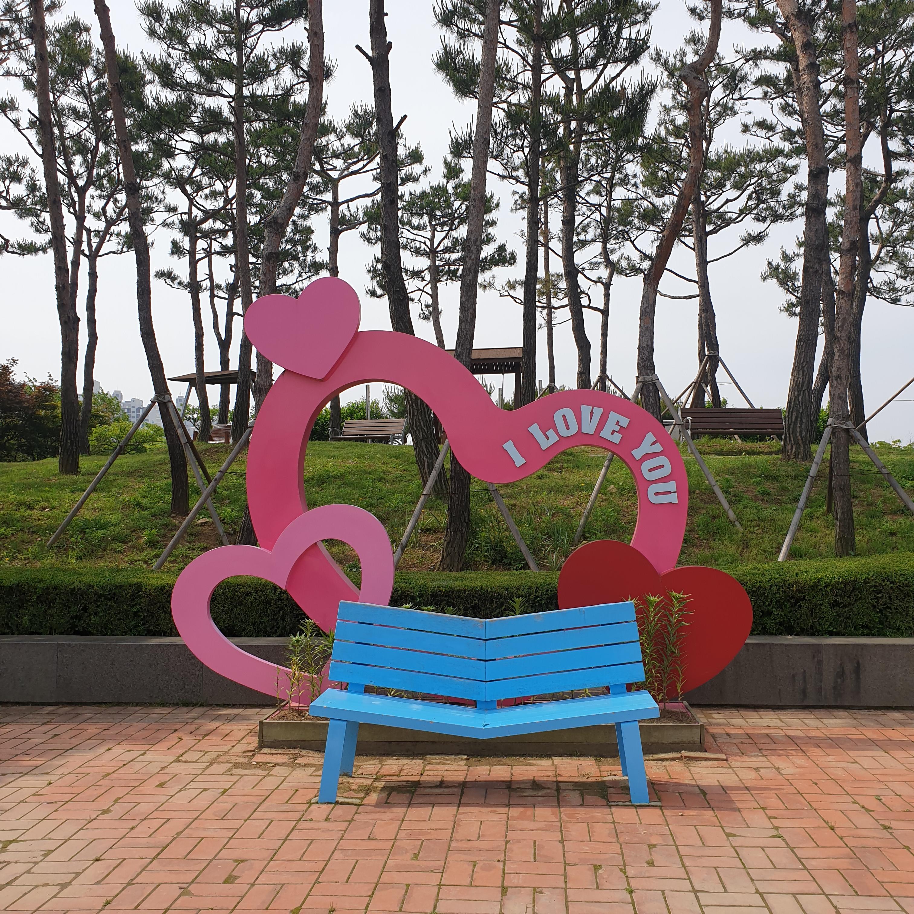 공원에는 쉬어갈 수 있는 벤치나 정자 있고 이렇게 예쁜 포토존도 있어요 의자가 특이하지요 가까이 앉을 수밖에 없는 구조네요^^:)