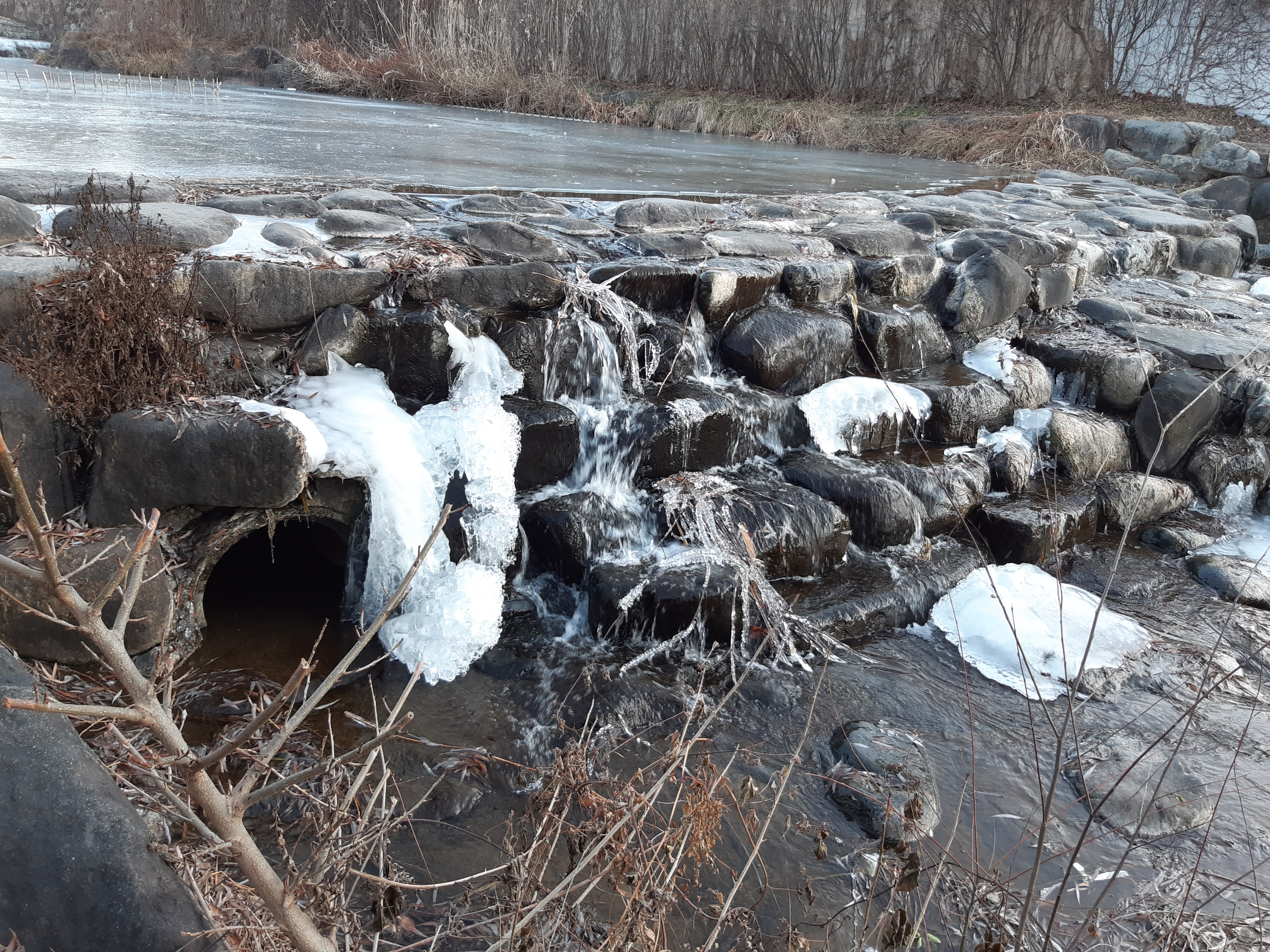 여기도 가까이에서 봐야겠지요. 보를 돌로 쌓은 위로 흐르는 물 그 옆에 얼음 덩어리가 만져보고 싶지만 큰일 나겠지요. 눈으로만 봐도 말할 수 없이 좋아요.