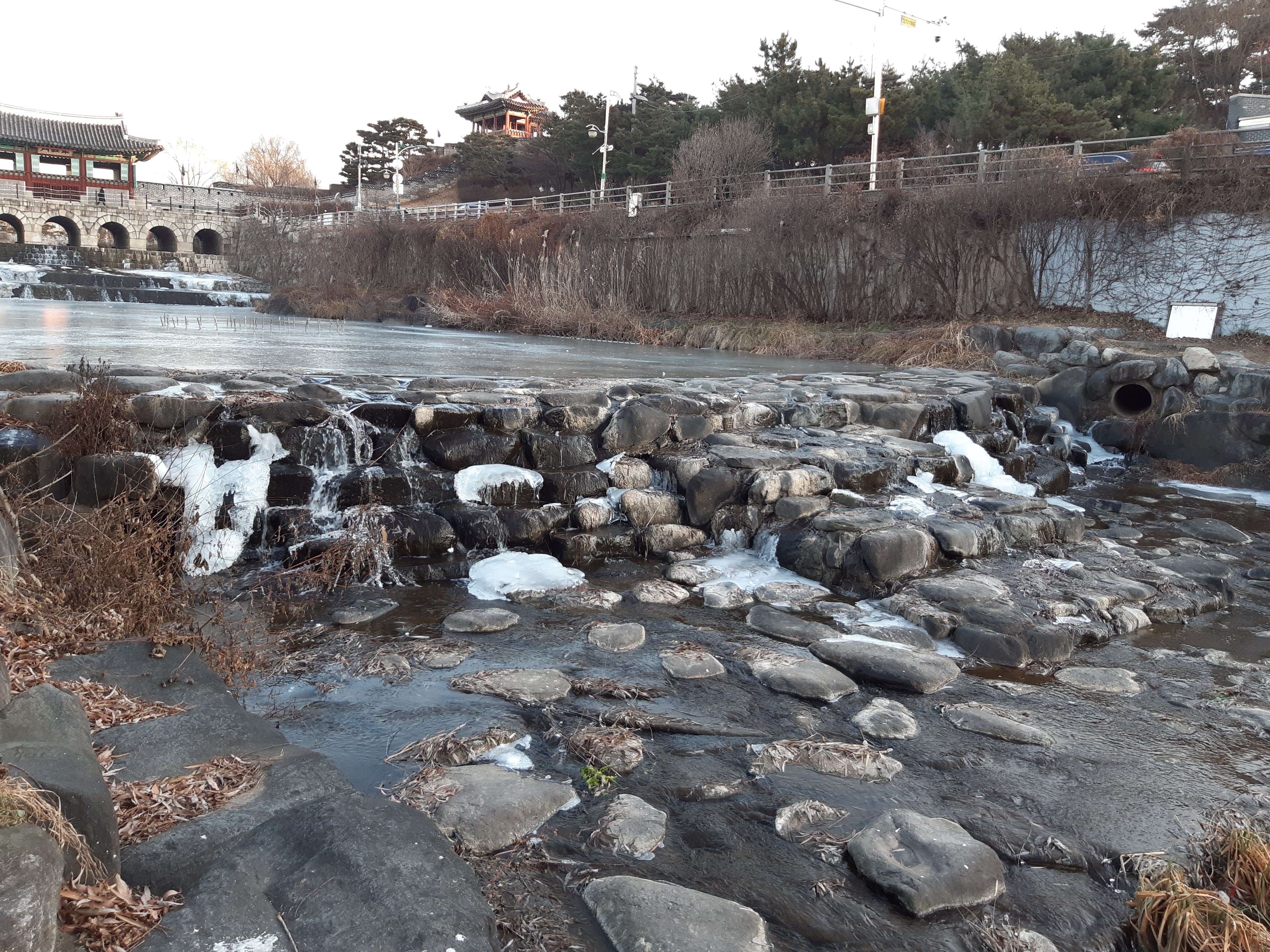 가까이에서 보니 맑은 물이 콸콸 흐르고 그 옆에 꽁꽁 얼은 얼음까지 이런 게 겨울의 멋이겠지요. 춥지만 바람이 불지 않아서 오늘 산책길이 기대되네요.