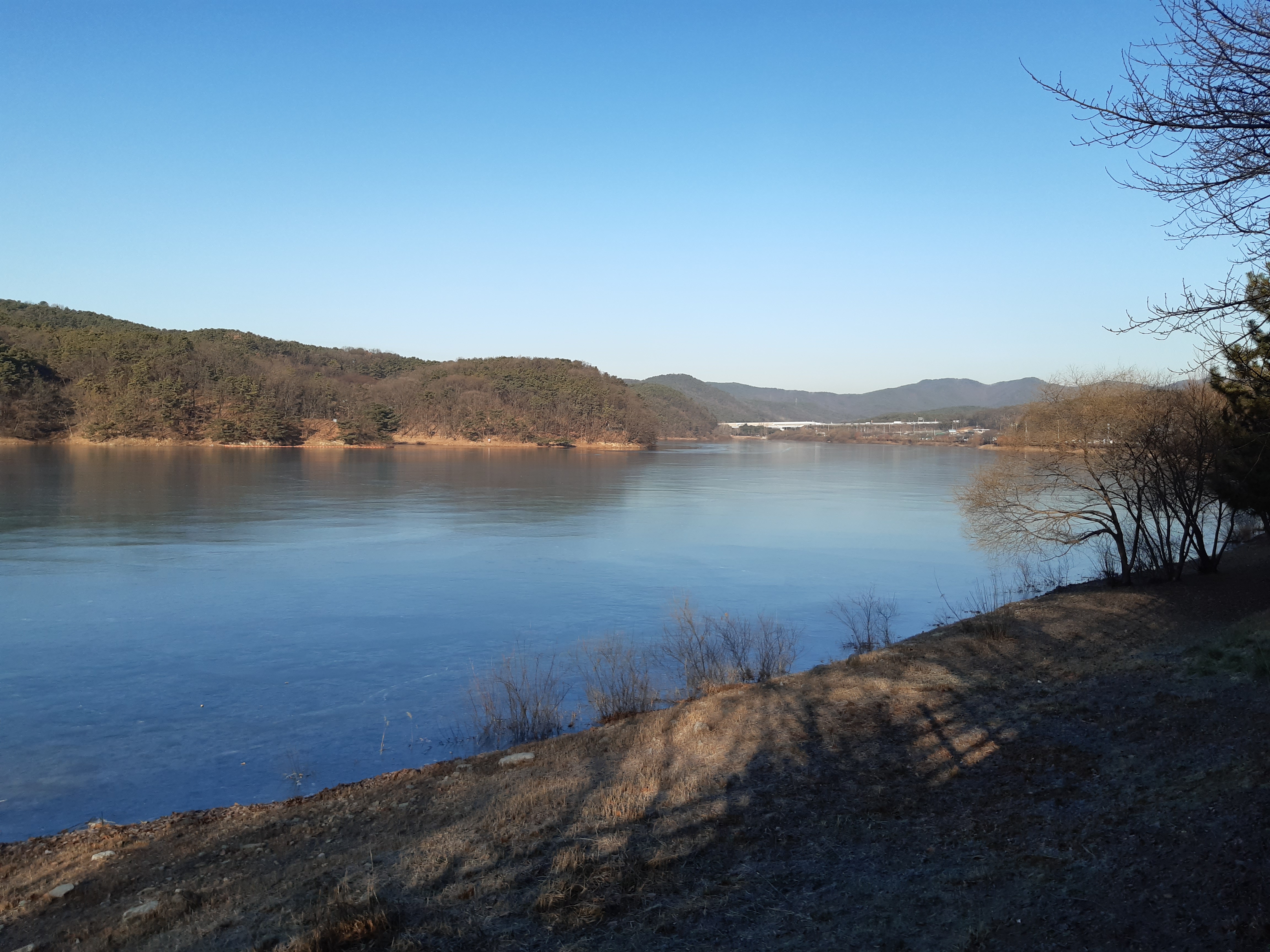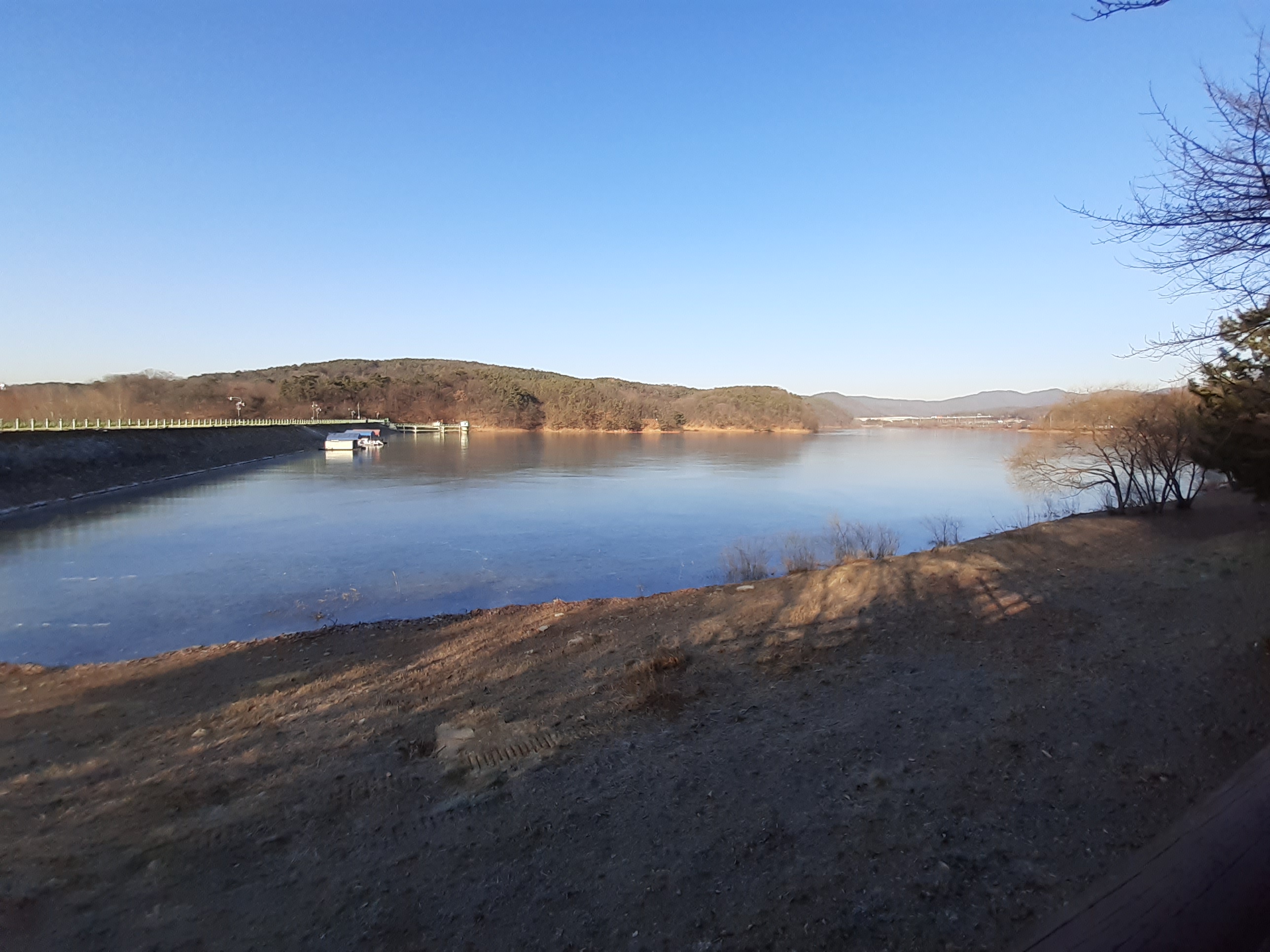 오늘은 날씨가 좋아서 하늘의 색과 저수지의 색이 새파랗네요.