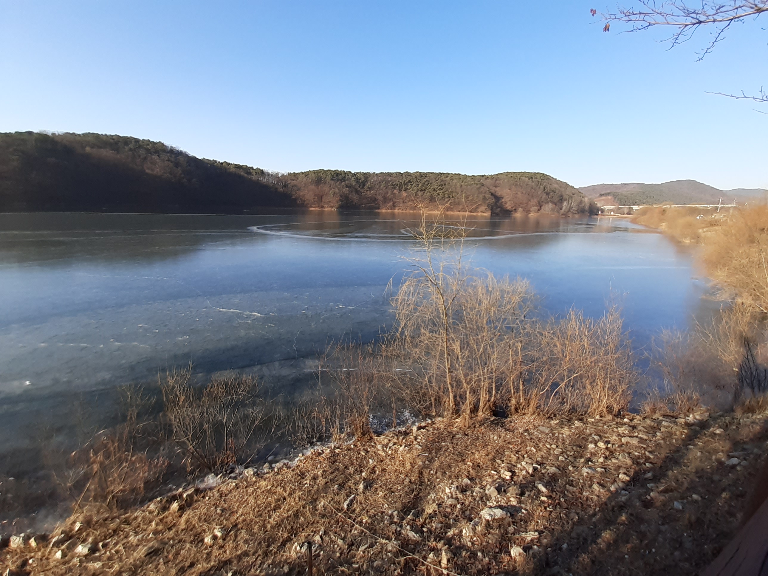 아침햇살에 얼음이 얼어있는 저수지는 더없이 푸르고 눈부셨어요.