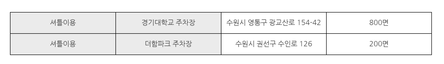 경기대학교 주차장과 더함파크 주자장이예요. 무료셔틀버스를 운행한다고 하니 복잡한 곳에서 주차장을 찾는 것보다는 편할 수도 있을 거 같네요. 그래도 집이 근처라면 멀리 주차하고 셔틀버스를 이용하는 것보다는 대중교통을 이용하는게 훨씬 나을거같아요.