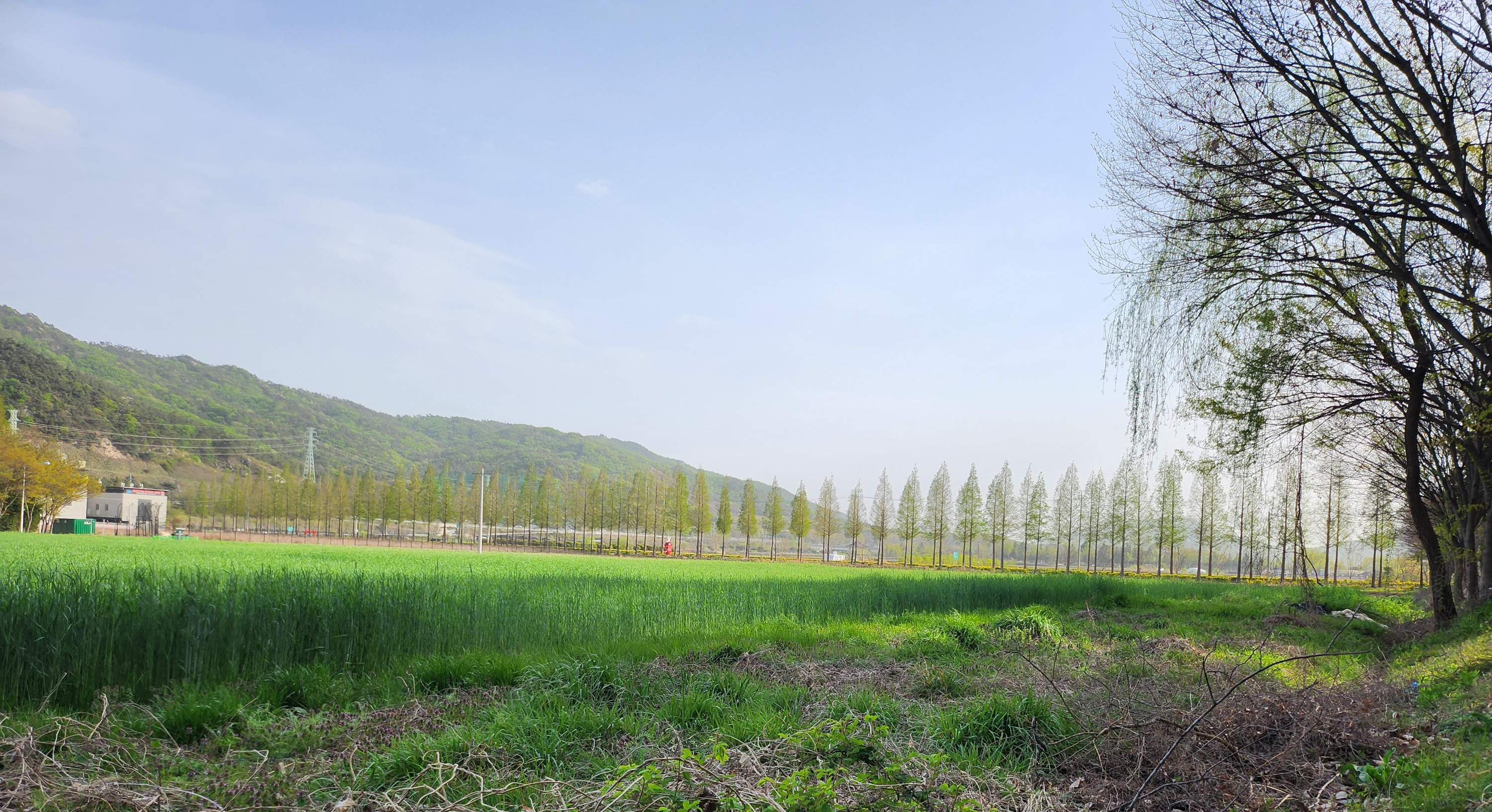 산책길에 보리밭이 싱싱한 초록색으로 펼쳐져 있네요. 보리밭 너머로 우리가 가보고 싶었던 가로수길이 보이는데 너무 잘 어울리네요.