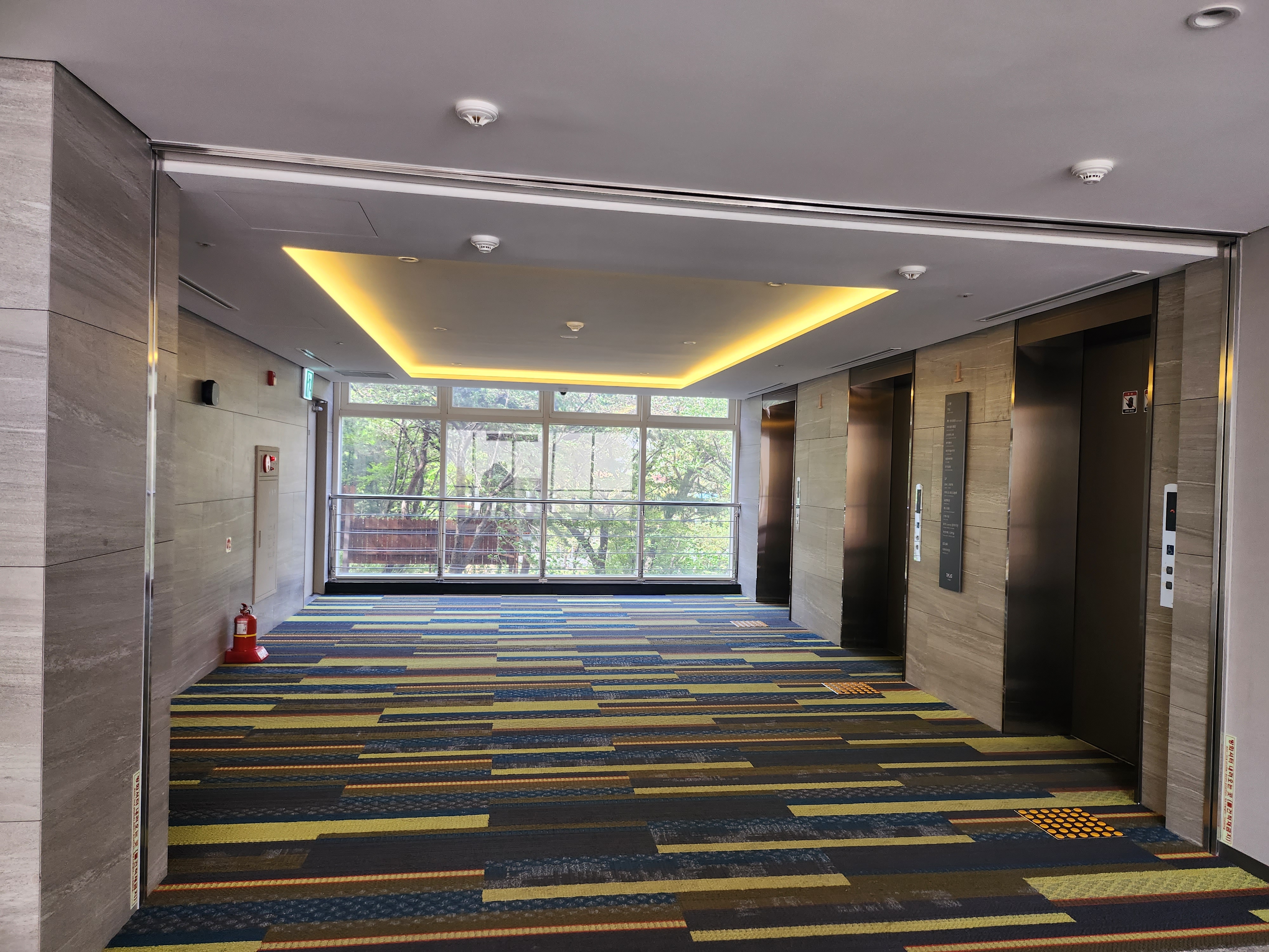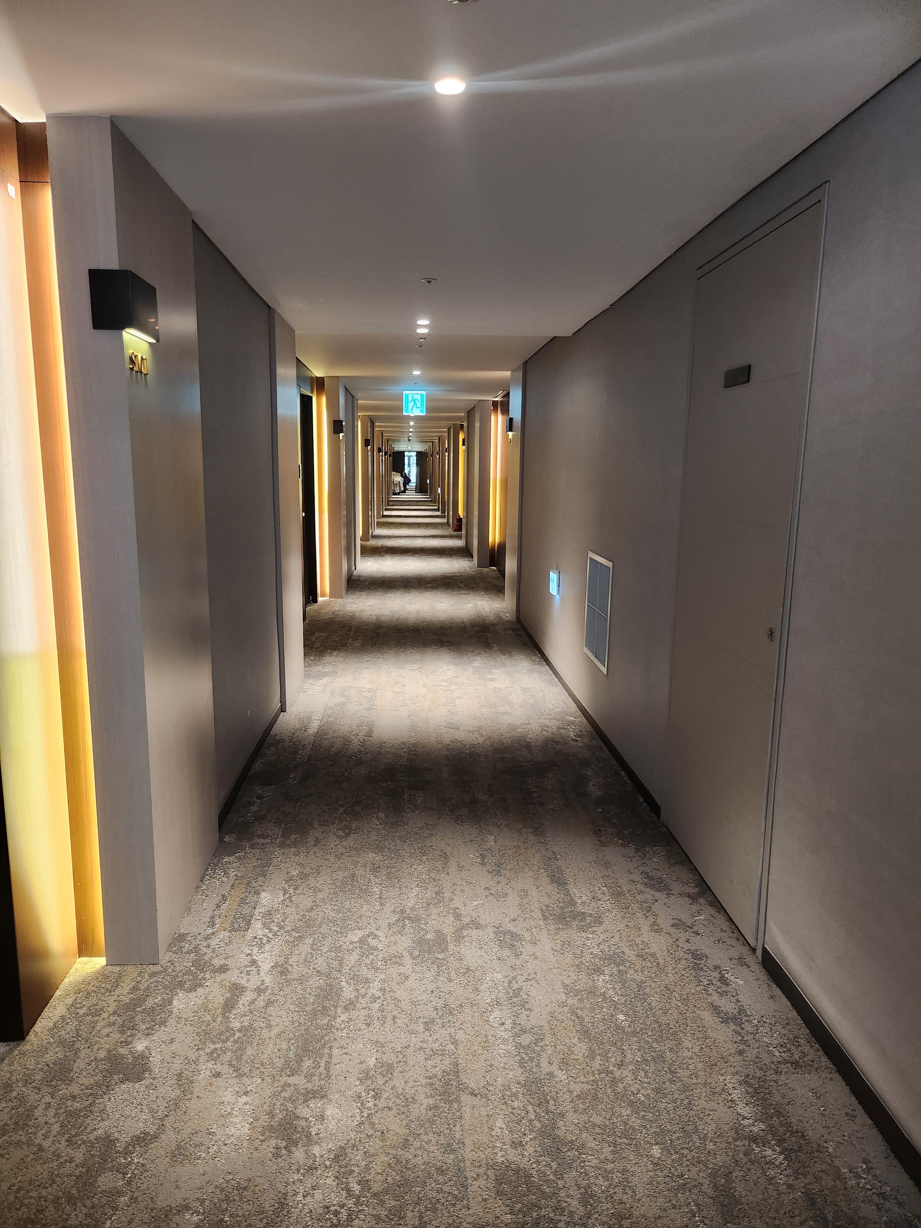 로비에서 숙소는 한층 위에 있어요. 복도에서 찍은 사진입니다. 일단 색감은 마음에 드네요.