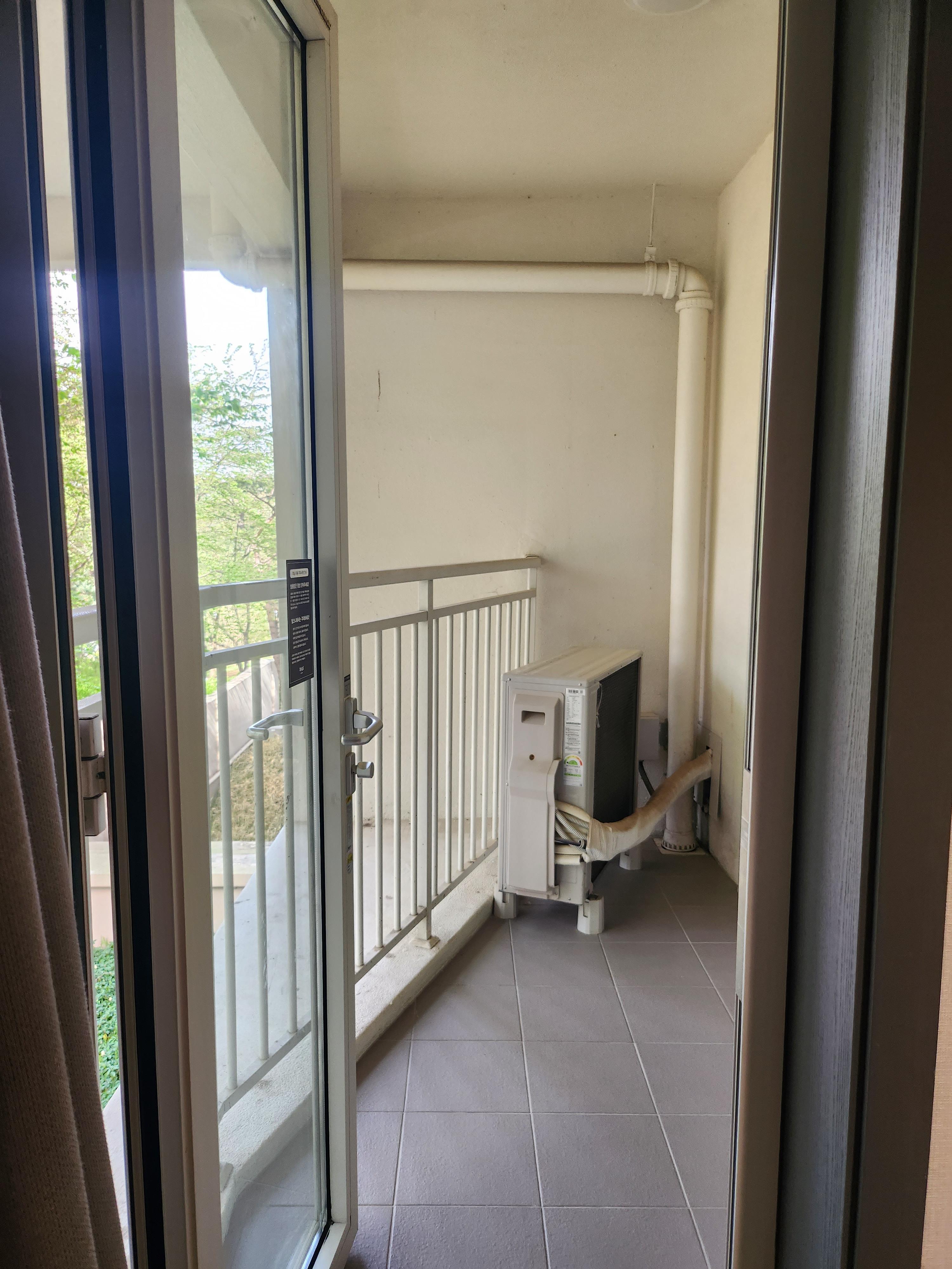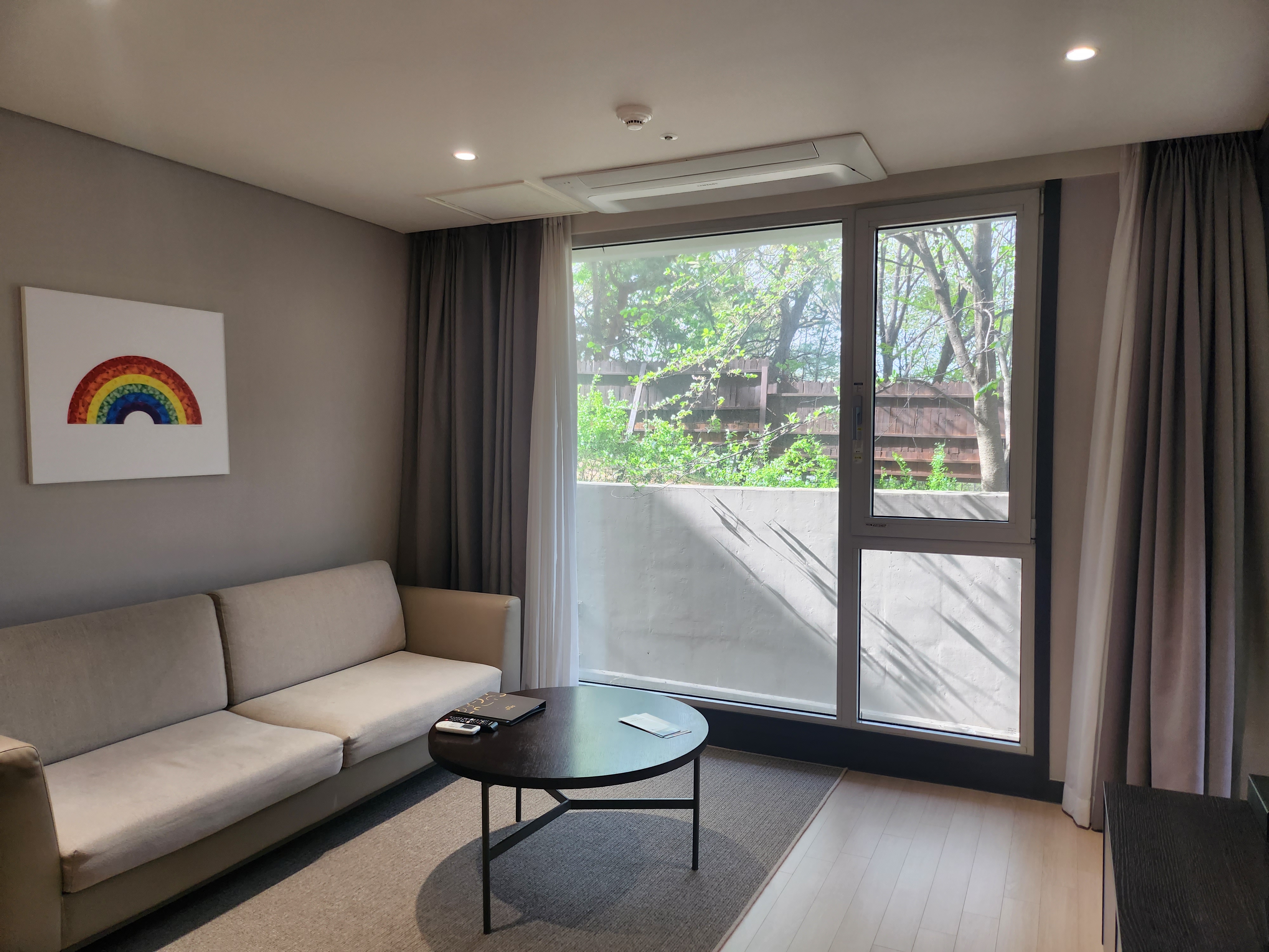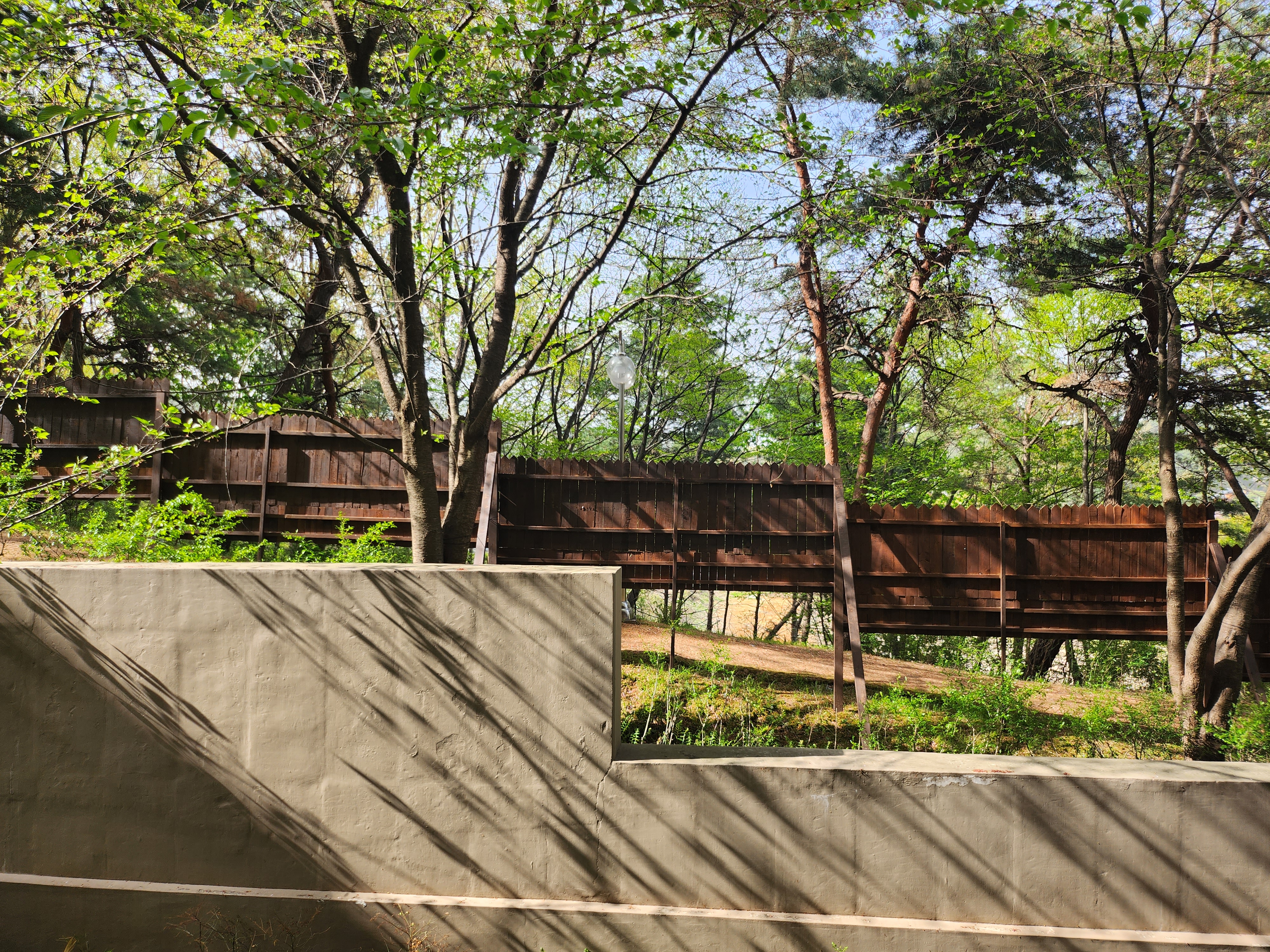 거실과 방 쪽 발코니에서 보이는 창밖은 울타리가 쳐져 있어요. 울타리 너머로는 산책로가 있어요. 가끔 산책하는 사람들의 발이 보이기는 하지만 신경 쓰이지는 않아요. 다음날 아침에 스테이타워 둘레길 산책로를 걸었는데 직접 걸어보니 울타리가 높아서 숙소를 볼 수 없었어요.