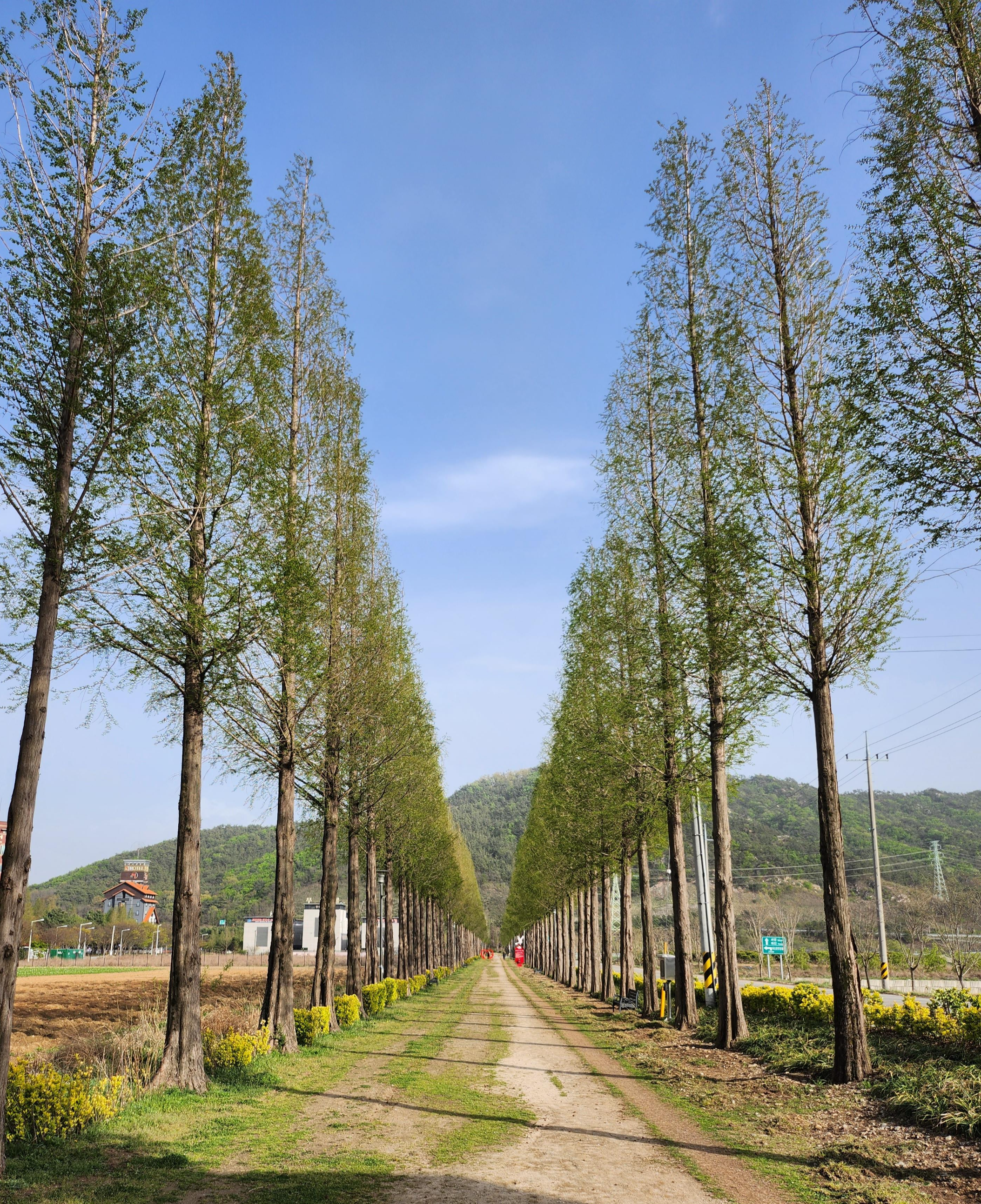 메타세콰이아 가로수길이 정말 멋지네요. 길이도 아주 길어요. 중간에 빨간색 우체통도 보이네요. 엽서를 한 장 넣어도 좋겠네요.