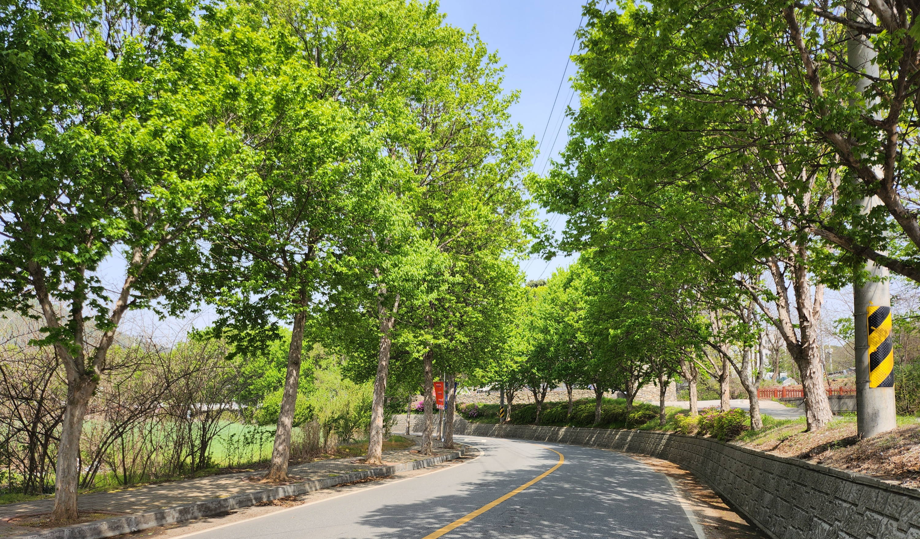 이제 리조트를 떠나는 마지막 길입니다. 옆에 청보리도 시원하게 자라고 있어요. 첫날은 날이 흐리고 소나기도 내렸었는데 둘째 날은 하늘이 파랗고 어제보다는 미세먼지도 덜 심한 거 같아요. 둘째 날도 즐거운 여행 하면서 집으로 돌아갔습니다 :)