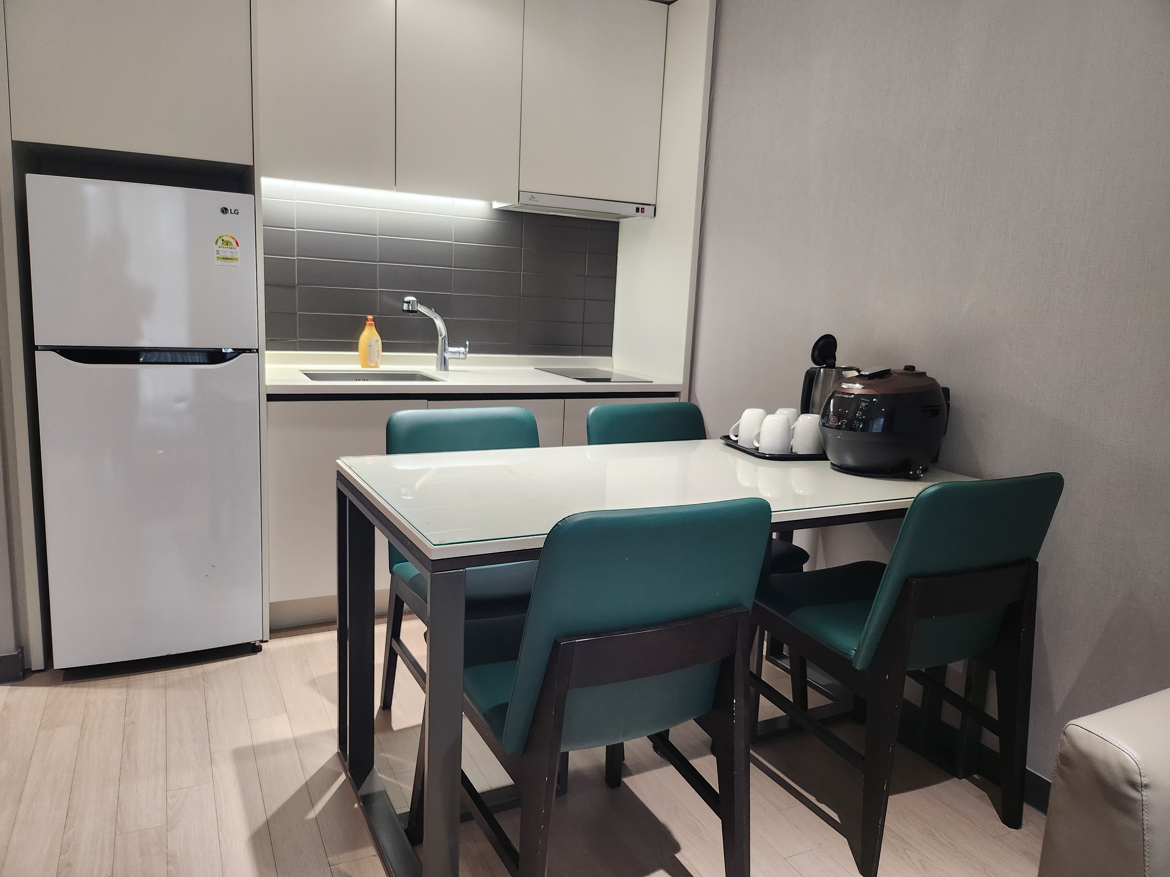 주방에 간단한 주방 용품들이 깔끔하게 정리되어 있네요. 계획은 조리기구 없는 곳을 예약하려고 했는데 딸의 예약에 오류가 있었네요. 저녁을 밖에서 먹어서 숙소에서 요리를 하지는 않았지만 밤에 인덕션에 오징어를 구워 맥주를 마실 수 있어서 좋았어요.