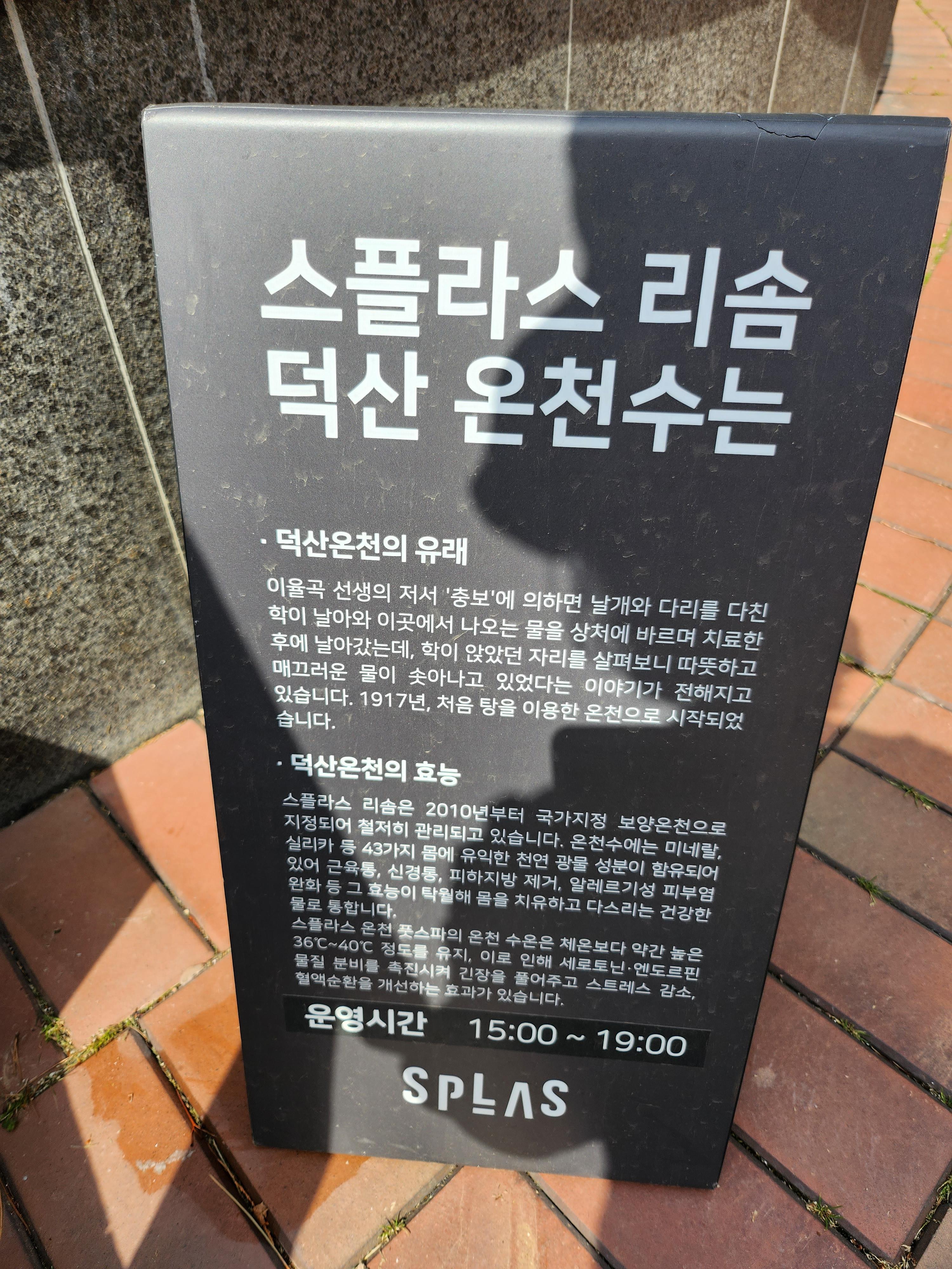 덕산온천의 멋진 글씨가 도착을 알려주네요. 덕산온천에는 설화가 있다고 하네요, "날개와 다리에 상처를 입은 황새가 논의 물을 열심히 상처에 찍어 바르기를 3일간 계속한 후 상처가 나아 날아갔는데 이를 이상하게 여긴 마을 사람들이 황새가 앉았던 자리를 살펴보니 따뜻하고 매끄러운 물이 솟아나고 있어 그 후로 이곳을 약수터로 사용하였는데 피부병, 신경통 등에 신통하게 잘 들어 이 마을을 온천골이라고 부르게 됐고 지금의 덕산온천이 되었다"라고 합니다.