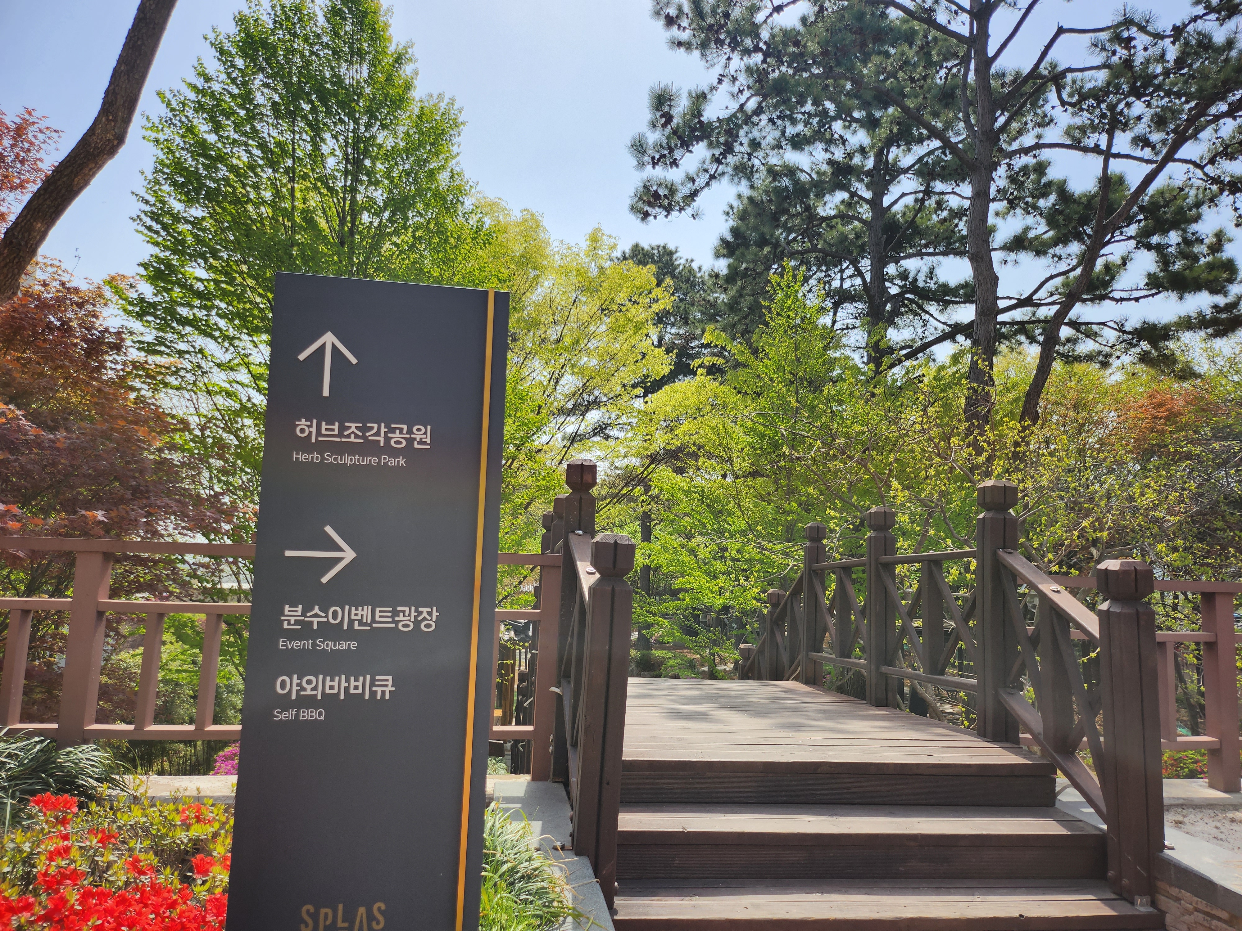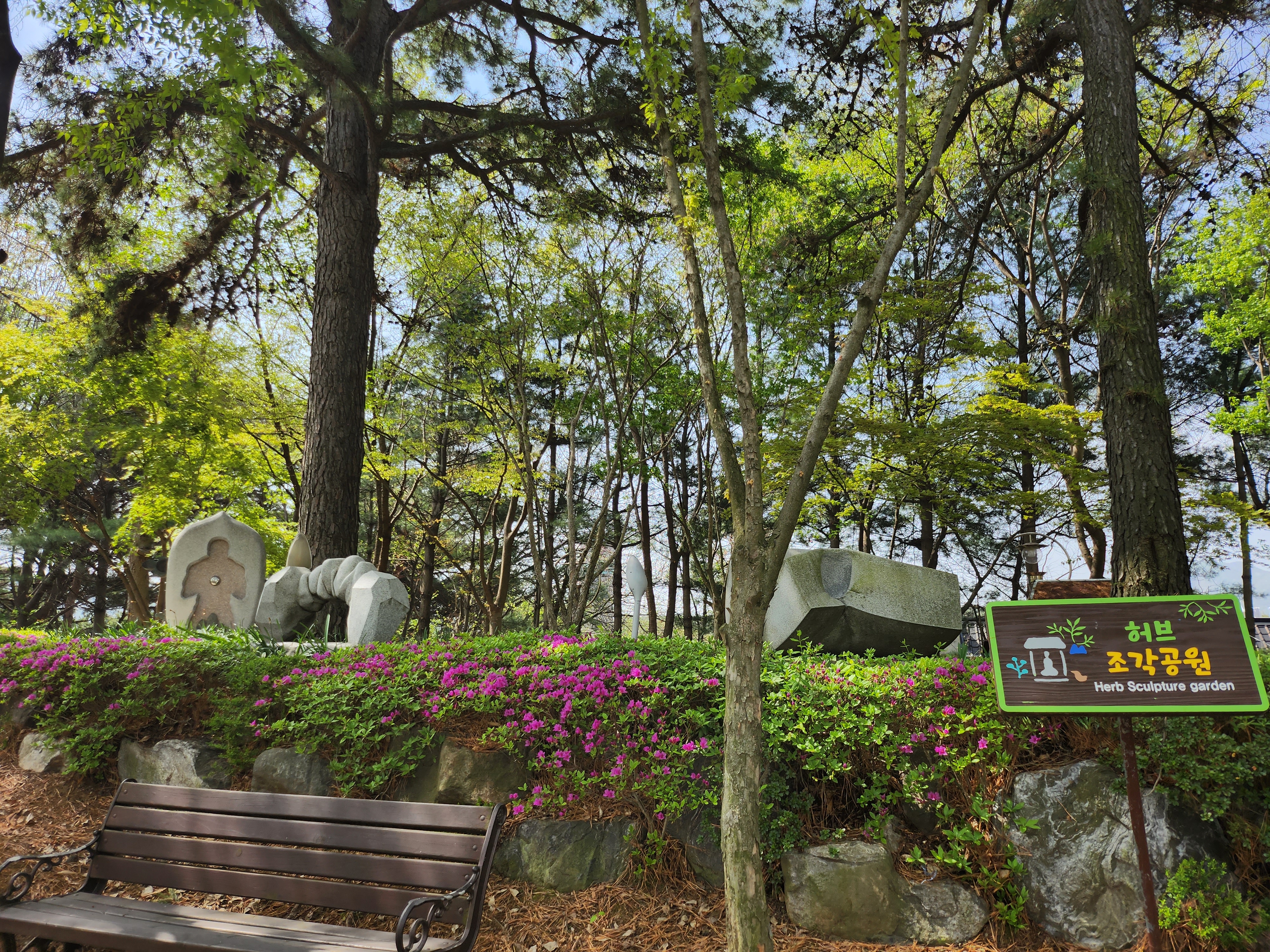 허브조각공원입니다. 셀프뱃살측정기도 있고, 여기저기에 조각도 꽤 많아요. 꽃도 피어있는 아기자기하고 조용한 장소입니다.