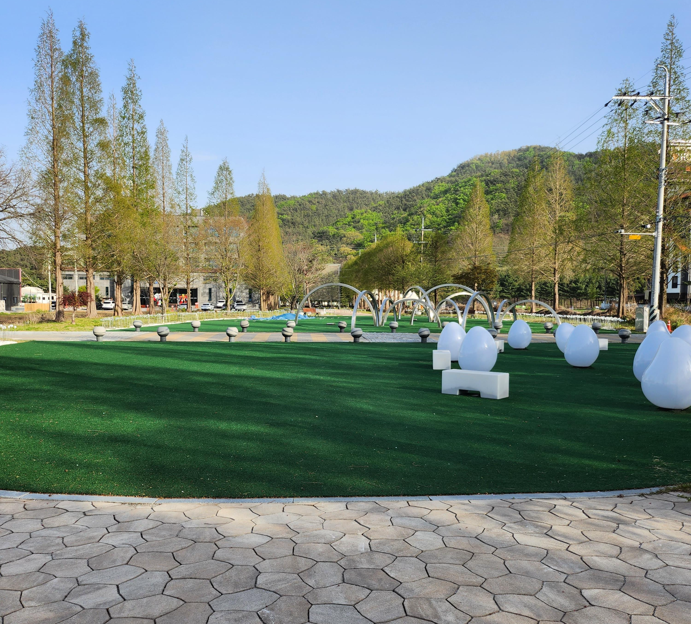 이곳은 환상의 숲이라는 이름을 가지고 있네요. 쉼터와 황새알이 초록색 인조 잔디와 잘 어울려요. 식사 후에 나올 때 보니까 황새알이 조명이었어요.