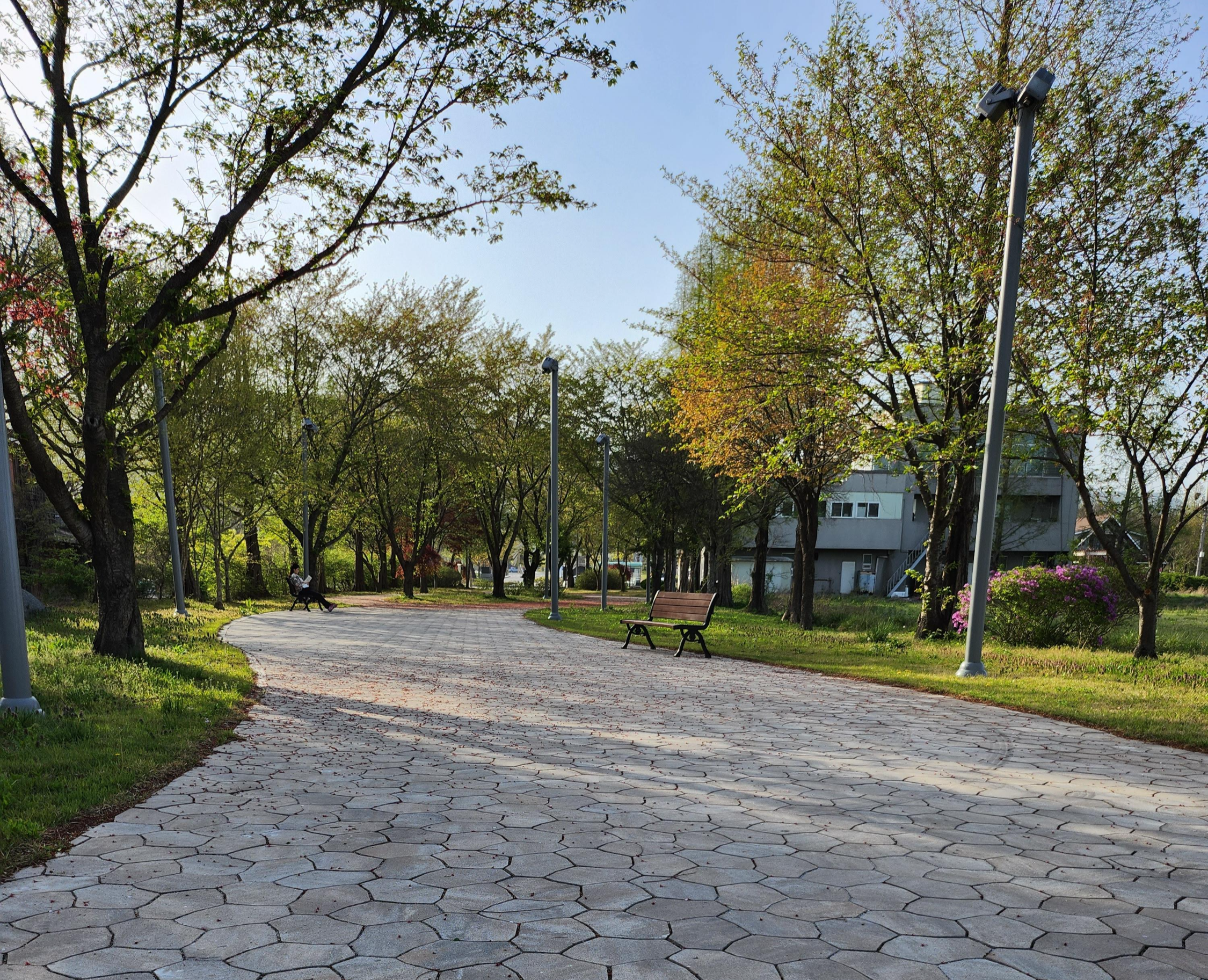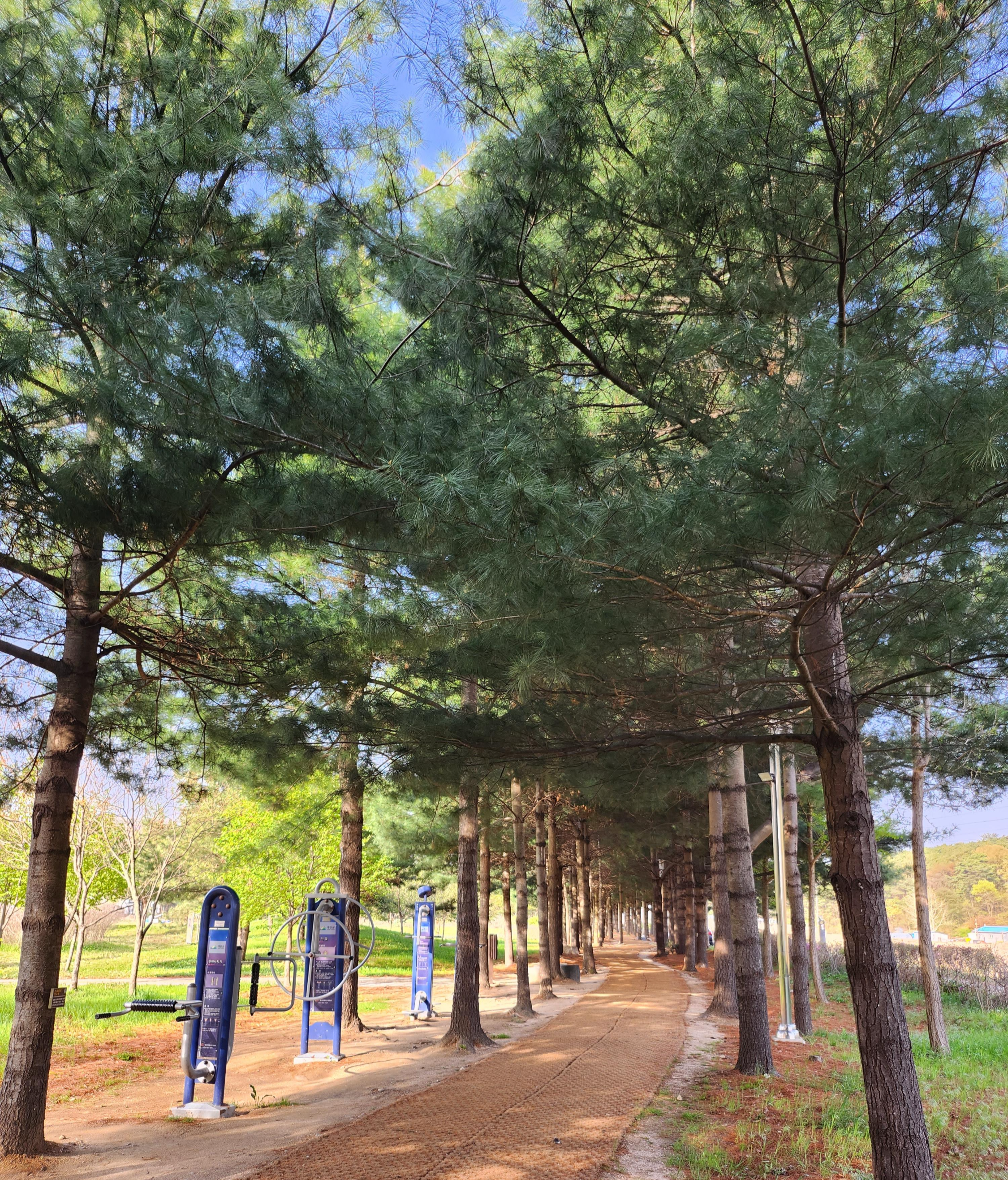 메타스콰이어 숲이 끝나면 또 다른 가로수 길이 이어지는데 여기는 다양한 운동기구들도 있어요. 여행 중에는 아무리 신경을 써도 맛있는 먹거리를 지나칠 수 없어요. 그래서인지 저녁을 먹으러 가면서 저절로 운동기구 위로 올라가며 마주 보고 웃었어요.