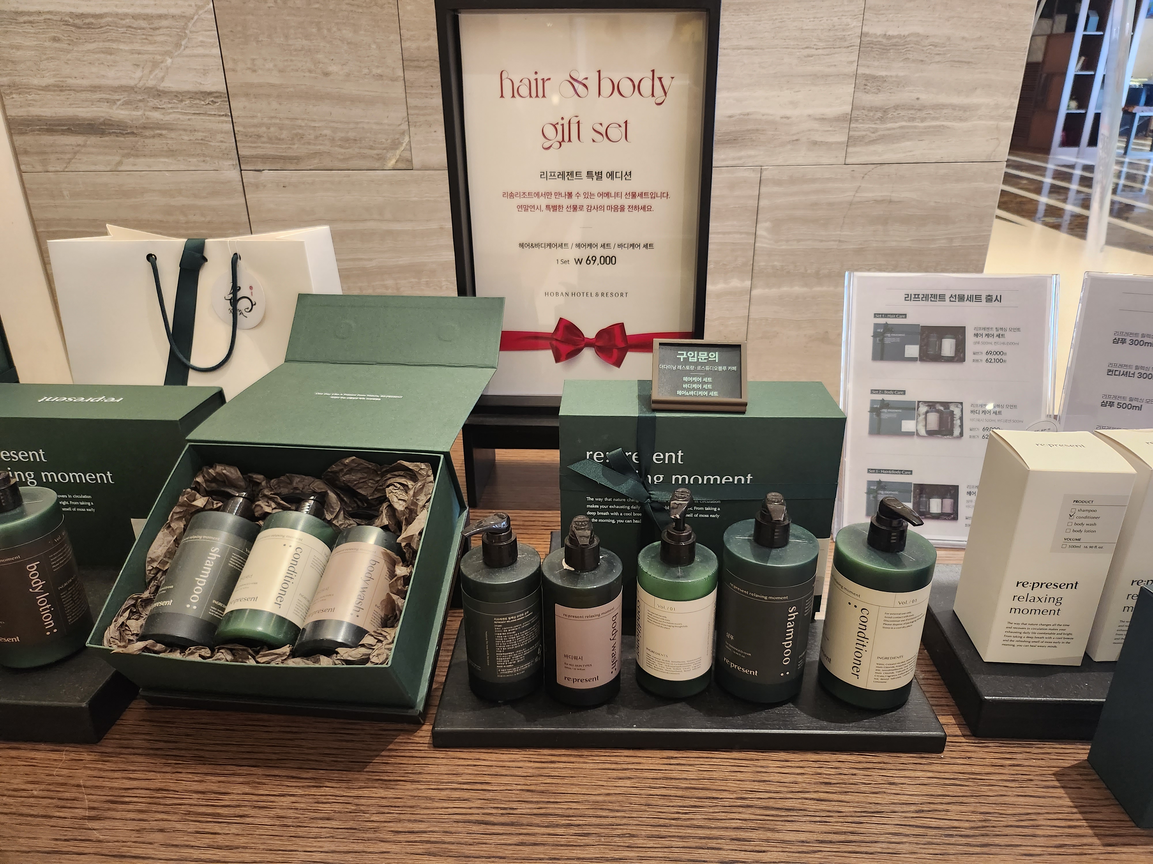 산책 겸 저녁을 먹으러 나가면서 로비를 찍은 모습입니다. 객실과 사우나에 비치되어 있는 어메니티도 판매 중이네요. 숙소에서 어메니티를 사용했는데 향이 참 좋았어요.