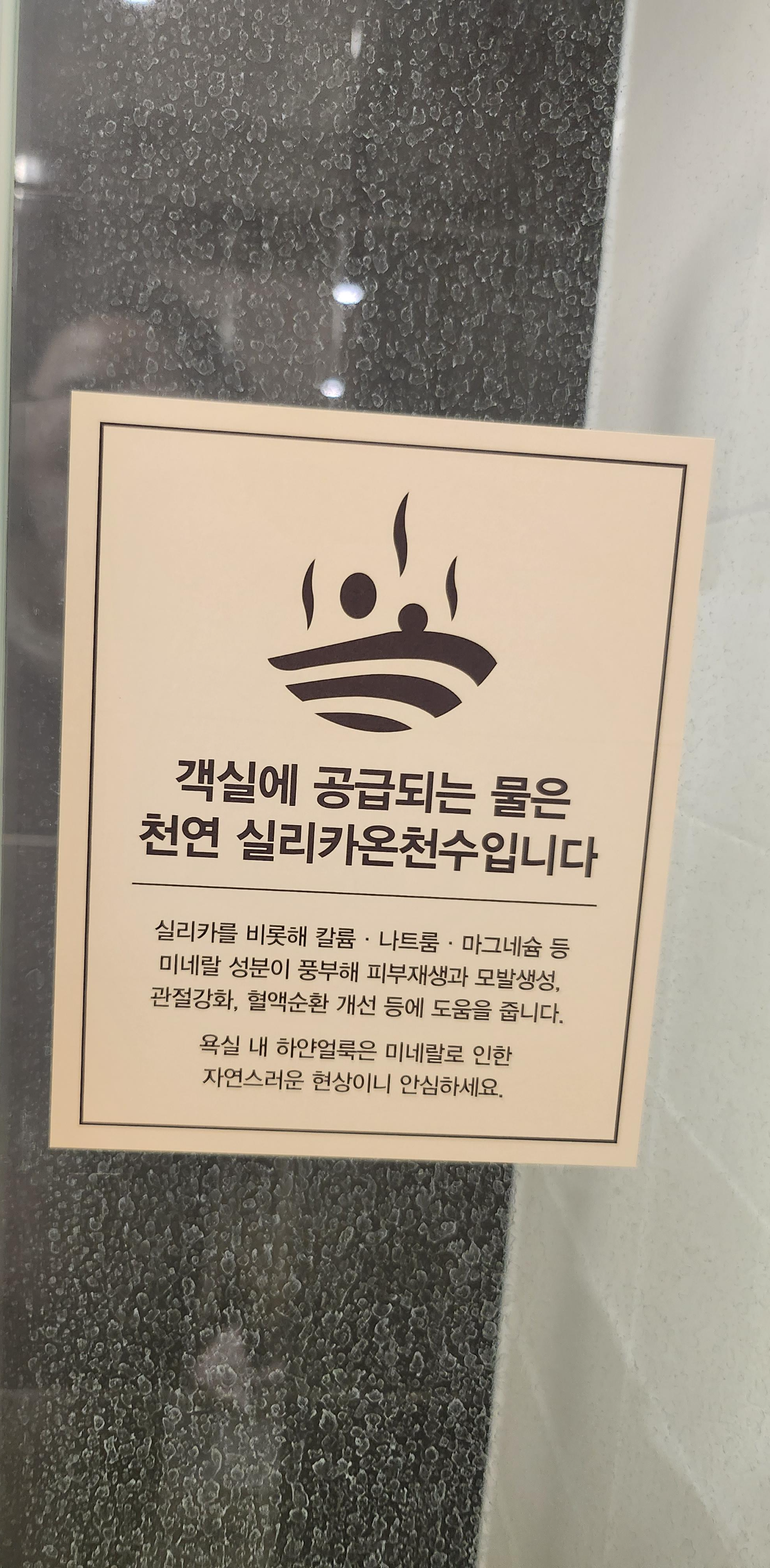 스플라스 리솜 객실에 공급되는 물은 천연 실리카온천수라고 하네요. 물의 대한 안내가 욕실 샤워 부스 문에 잘 소개되어 있어요. 물이 진짜 좋아요.
