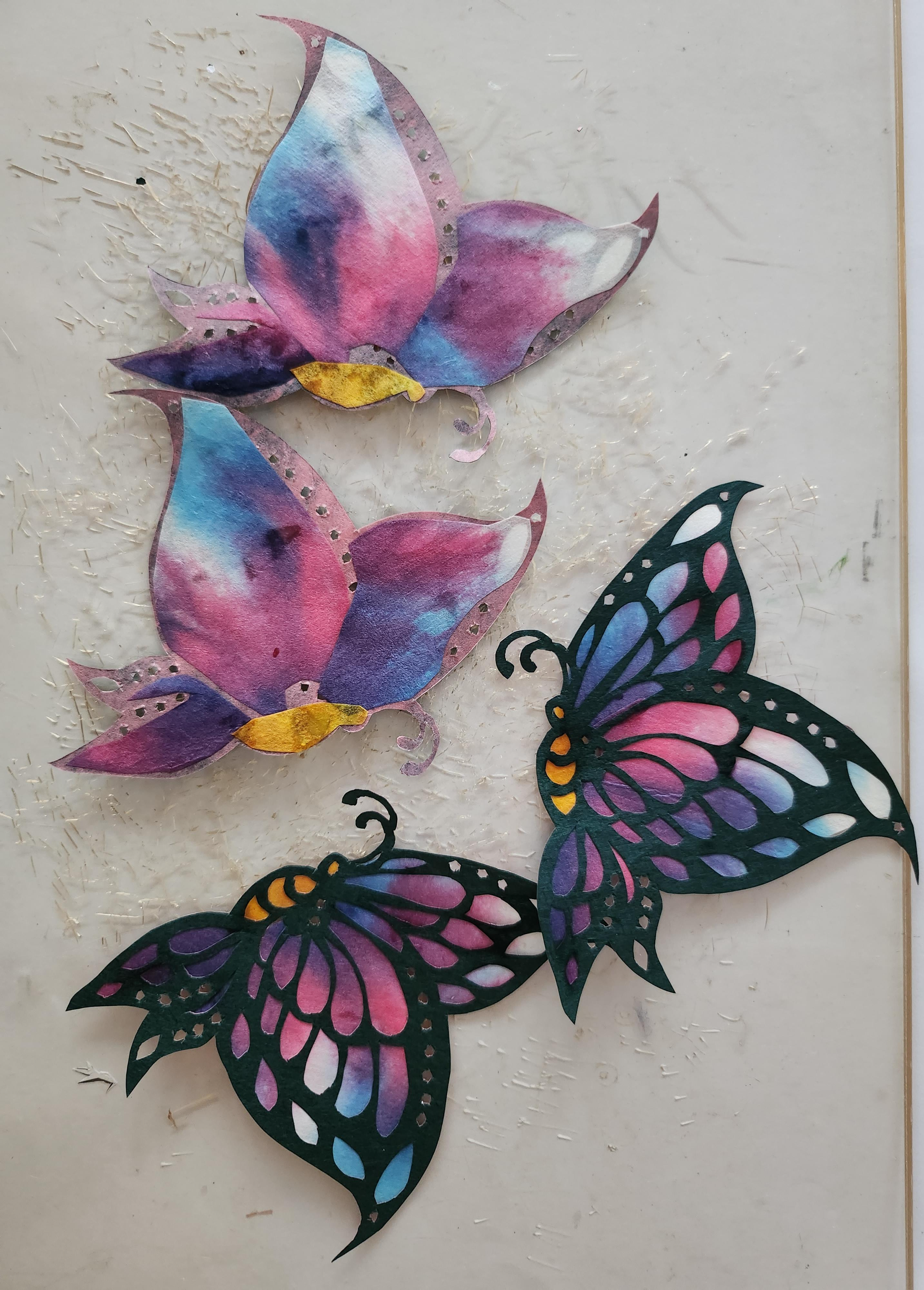 나비는 크기가 커서 호랑나비 느낌으로 화려하게 염색지 배접을 했어요. 국화 주변에서 한결 생동감이 들겠지요^^