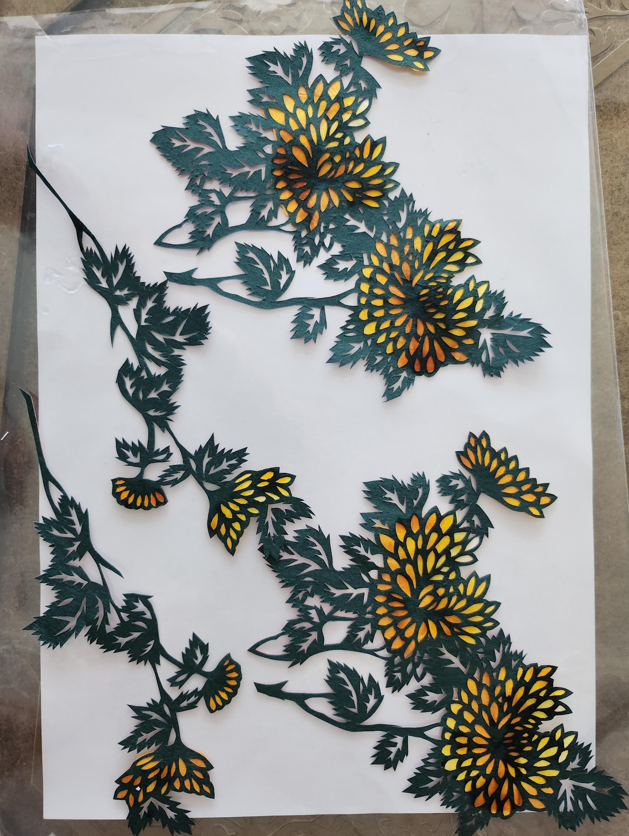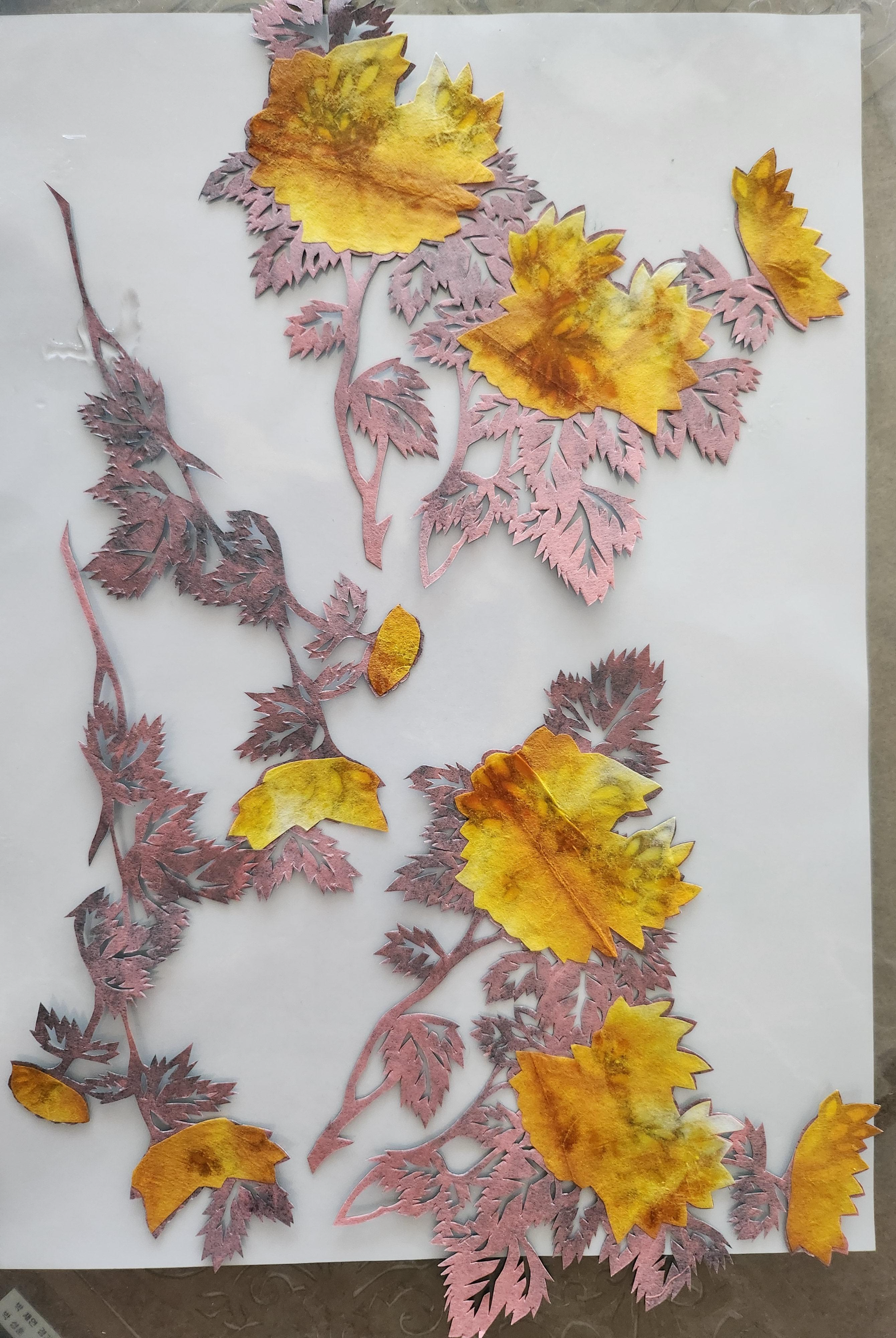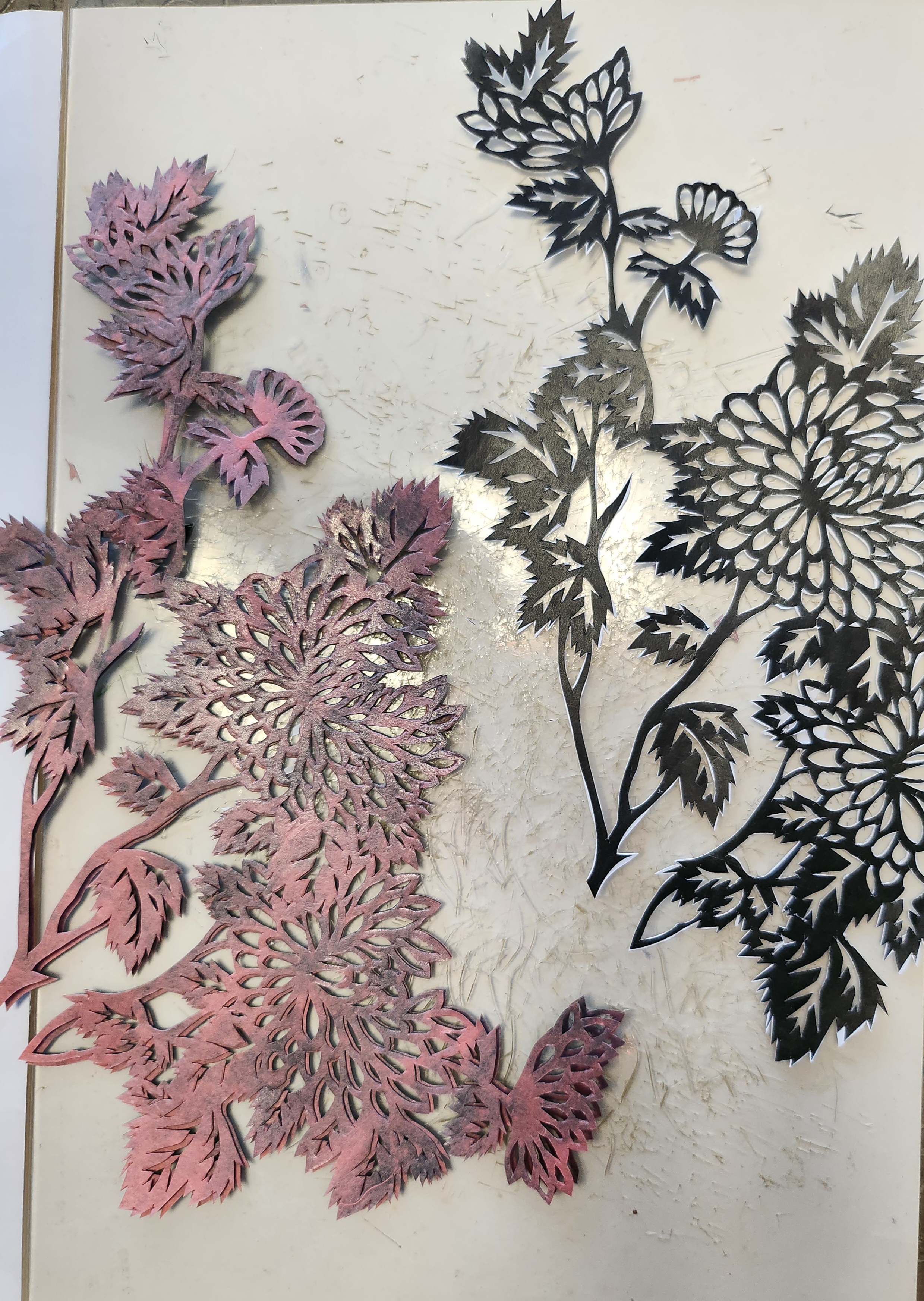 국화문양 파는게 끝났어요. 문양이 4장 필요했지만 배접지를 2장씩 겹쳐놓고 파내는 덕분에 두 번에 다 팠네요. 분홍은 뒷면이에요 꽃잎에만 국화색을 한번 더 배접을 해줄 거예요.