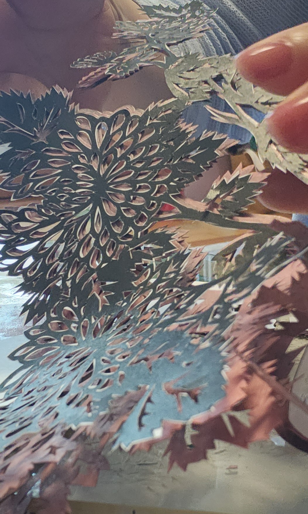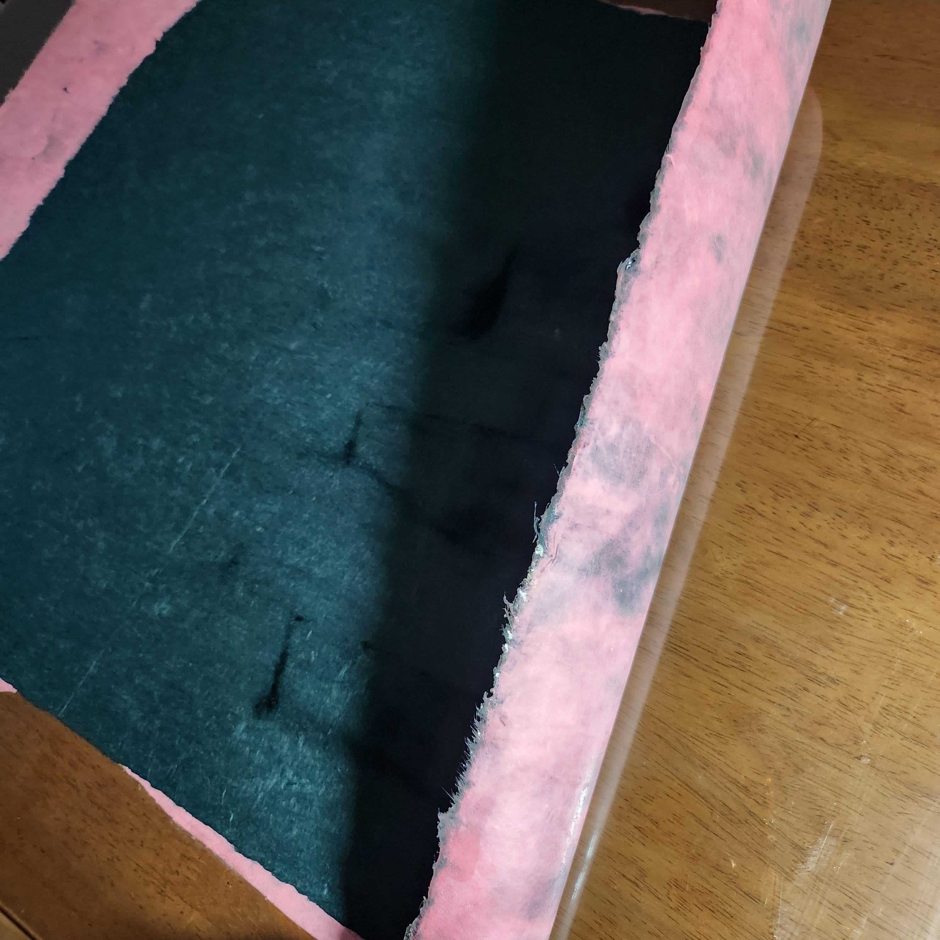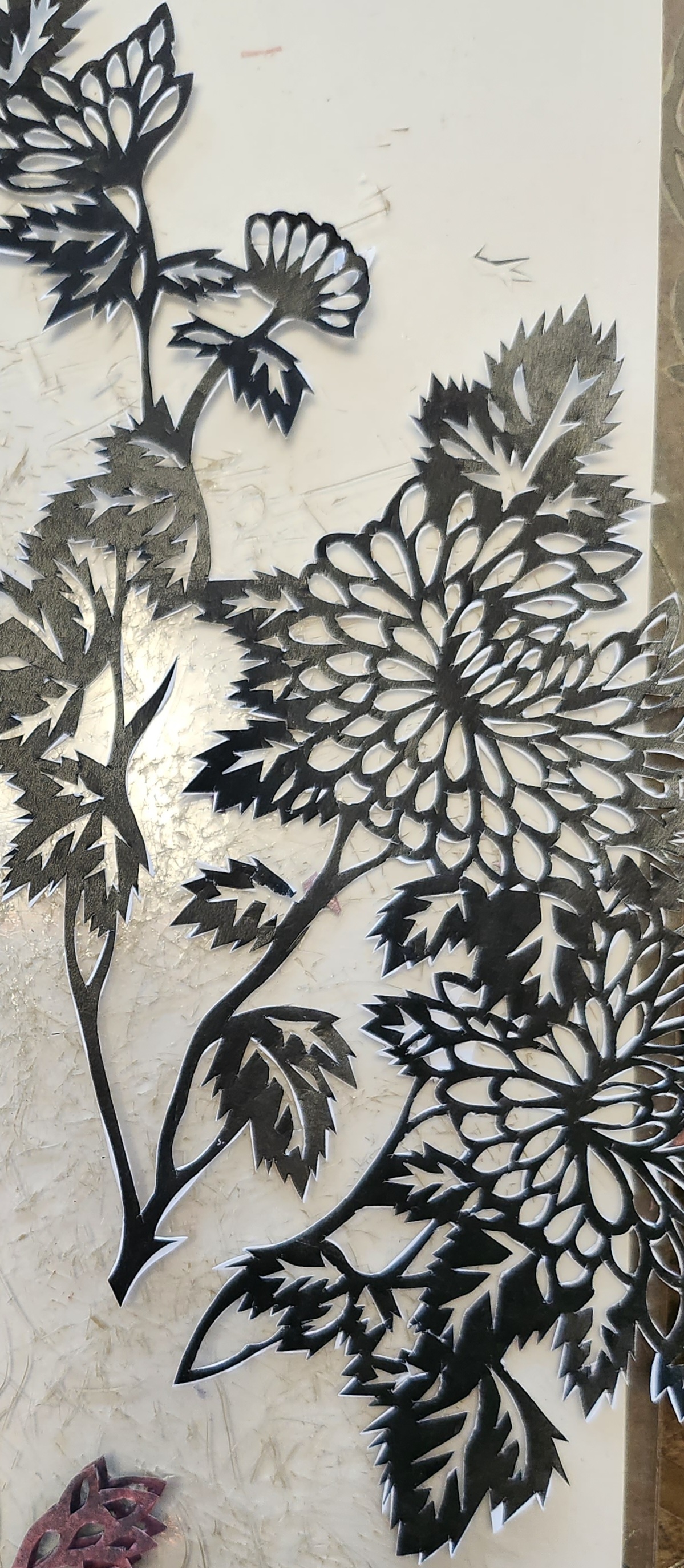 국화문양 파는게 끝났어요. 문양이 4장 필요했지만 배접지를 2장씩 겹쳐놓고 파내는 덕분에 두 번에 다 팠네요. 분홍은 뒷면이에요 꽃잎에만 국화색을 한번 더 배접을 해줄 거예요.