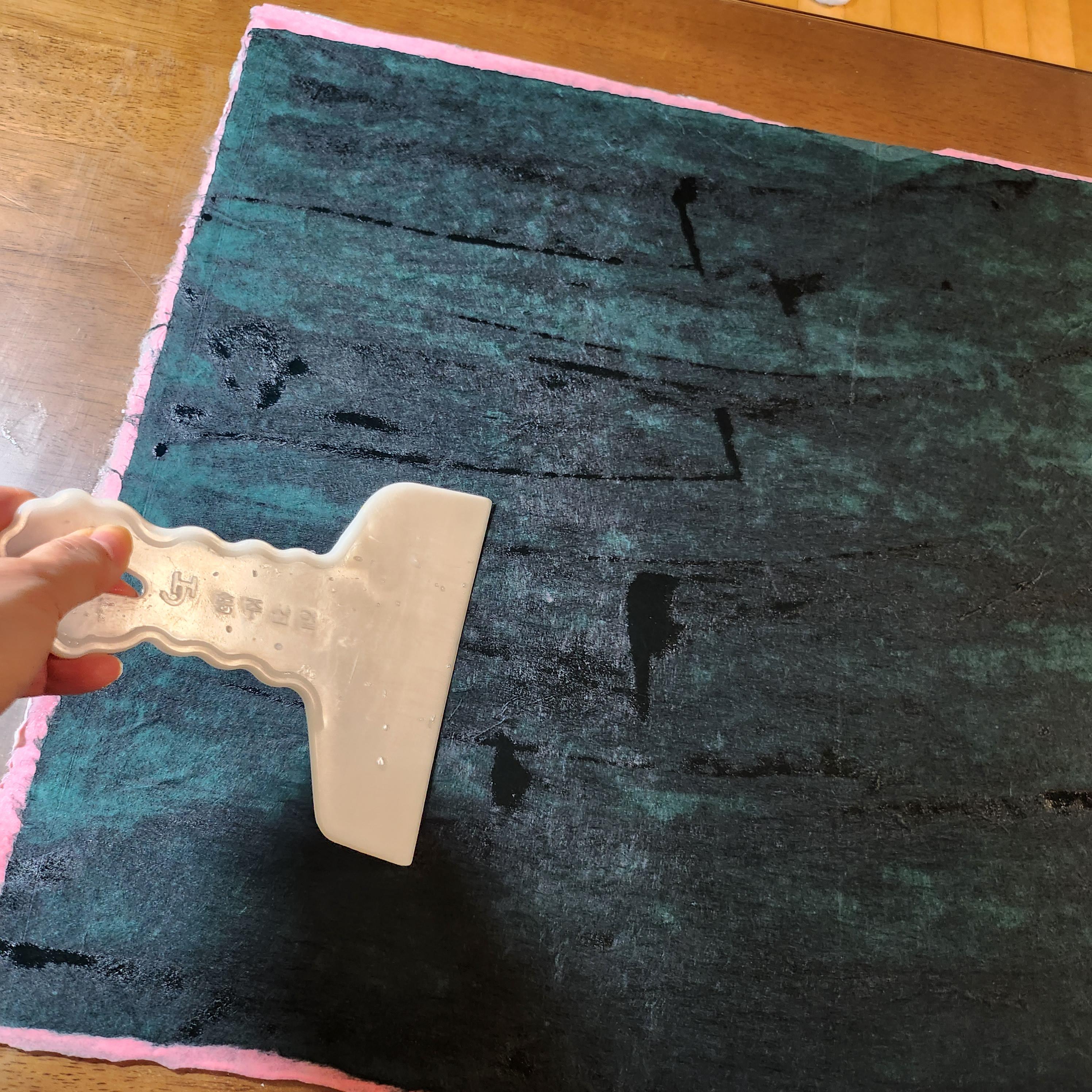 배접 할 때는 풀로 붙이고 해라로 뜨지 않게 잘 밀어서 공기를 빼야 매끈한 배접지가 만들어져요 바닥에도 풀을 발라야 돼서 유리 위에서 만들어야 말랐을 때 잘 떨어집니다.