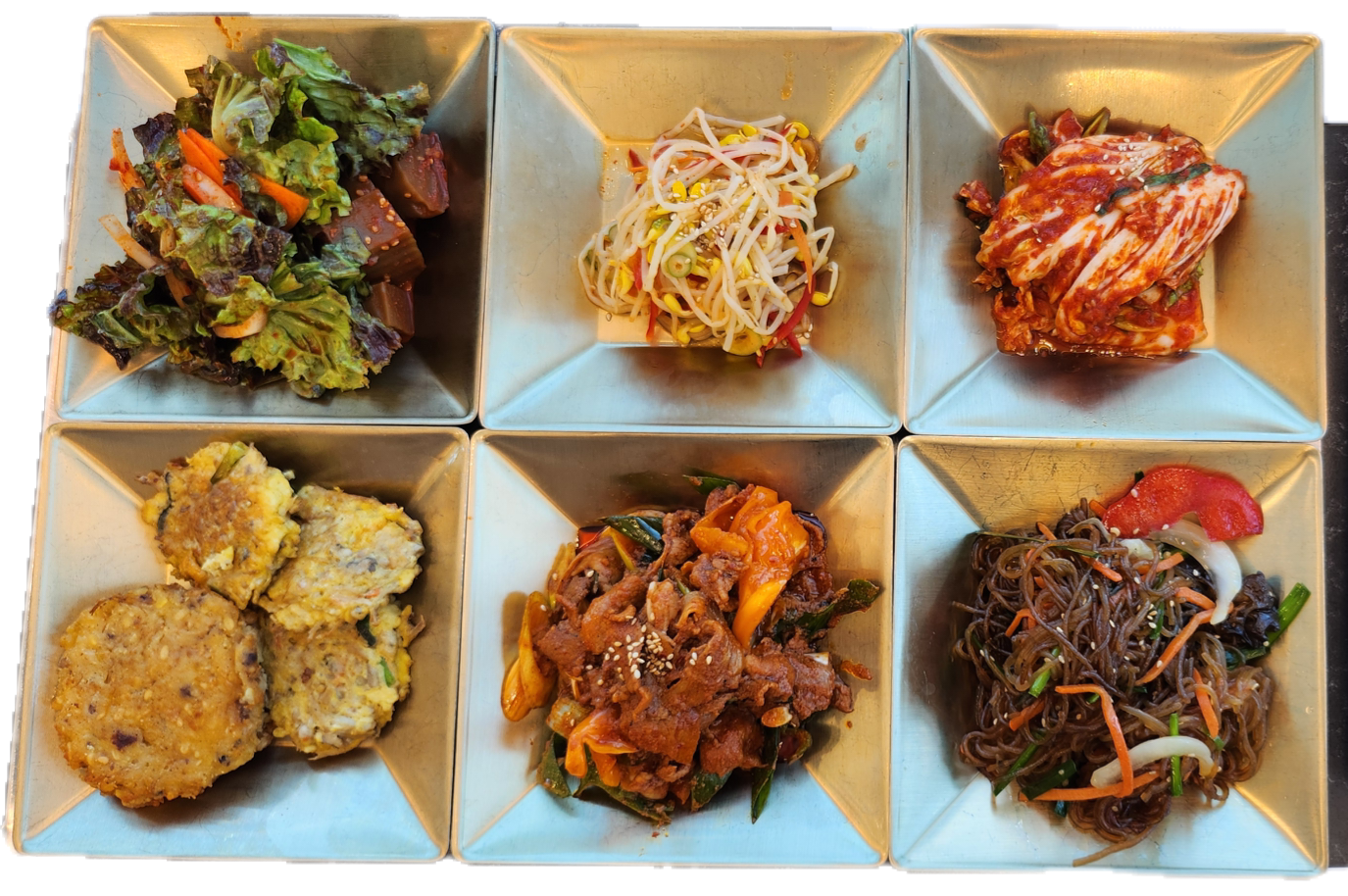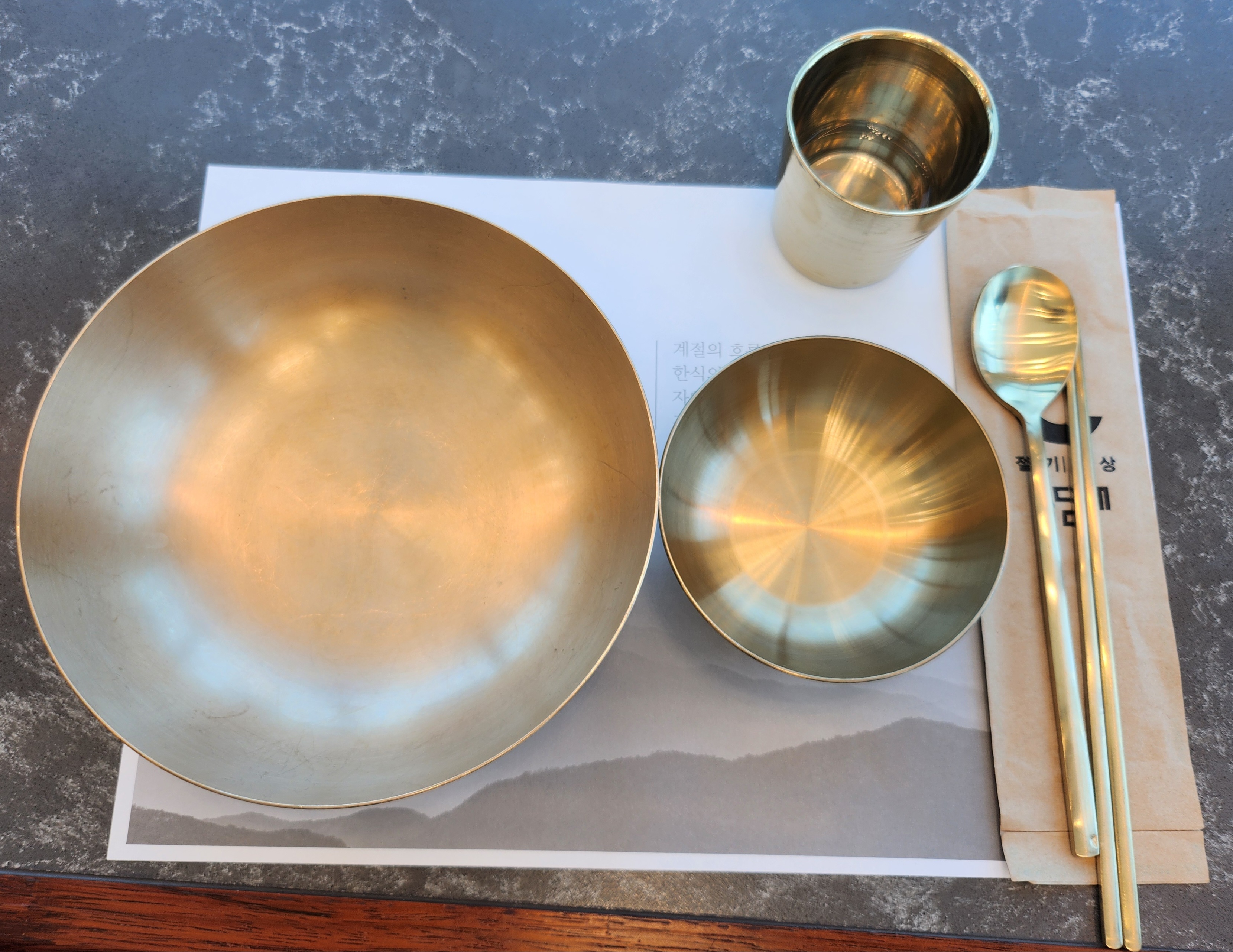 여기는 유기그릇에 무쇠솥을 쓰는지 솥이 무거웠어요. 유기그릇은 대접받는 기분이라 좋다고 같이 오신 분 좋아하네요. 요즘은 그래도 로봇카 덕분에 직원분들이 옮기는 수고를 덜어주는 게 다행이지요. 나오다 보니 깨끗한 유기그릇이 모여 있는데 멋있네요.