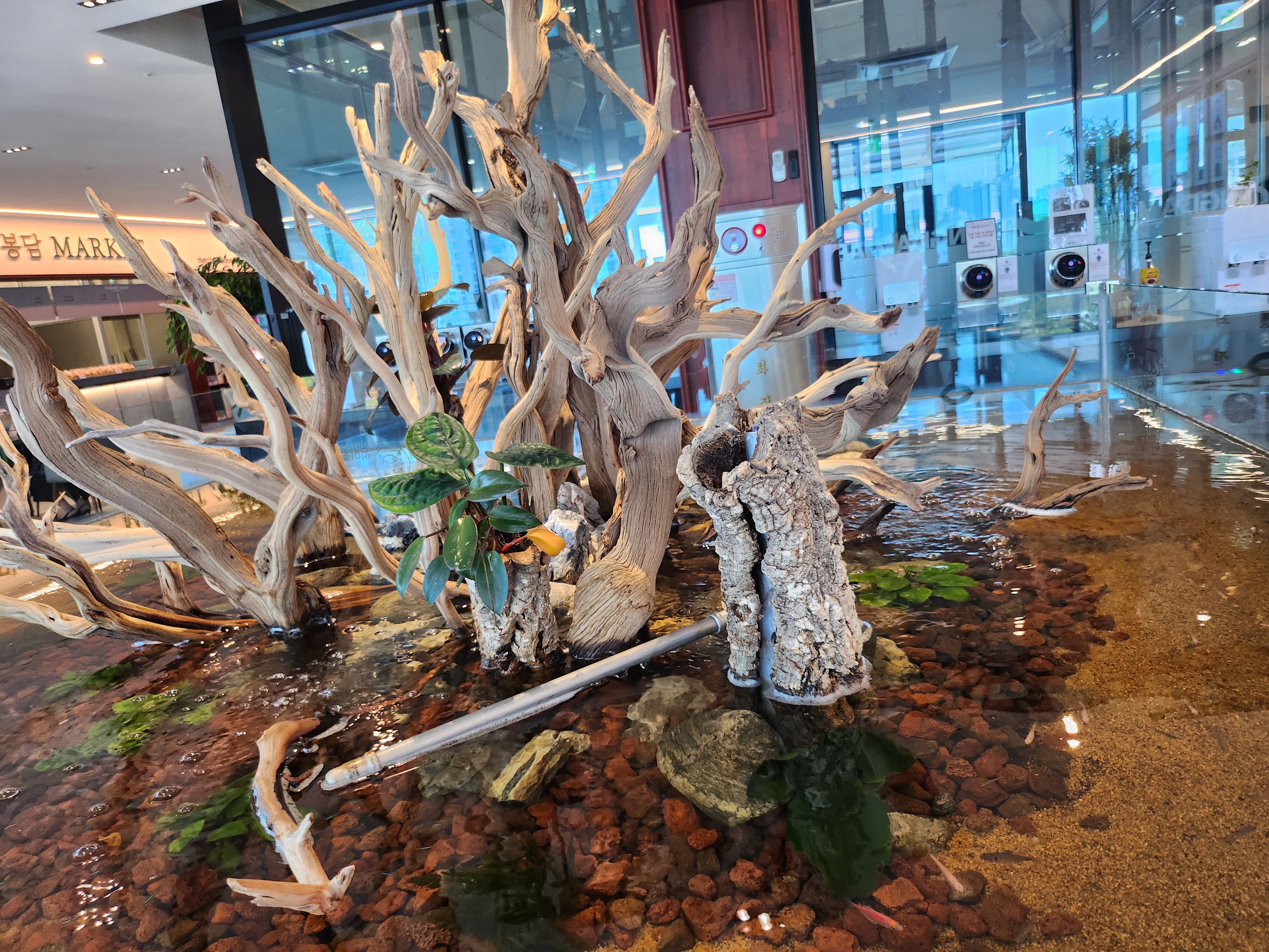 1층은 대기실 겸 카페입니다. 앞에 보이는 주차장에 주차하고 올라왔어요. 주차장이 넓어서 주차하기 좋아요. 넓은 수조 안에는 괴목이라고 하나요? 멋진 나무아래 물속에는 작은 물고기들이 아주 많은데 멋있네요.