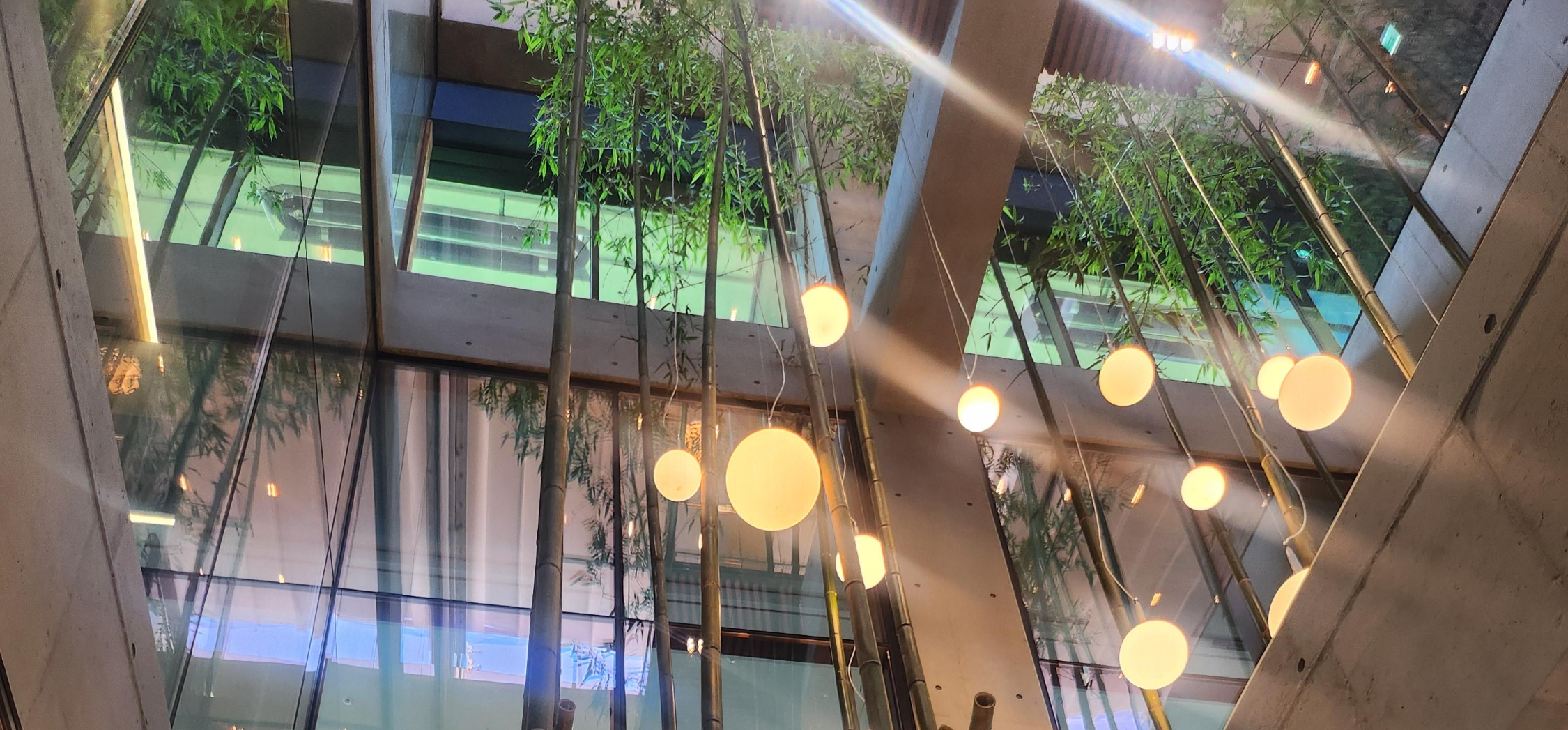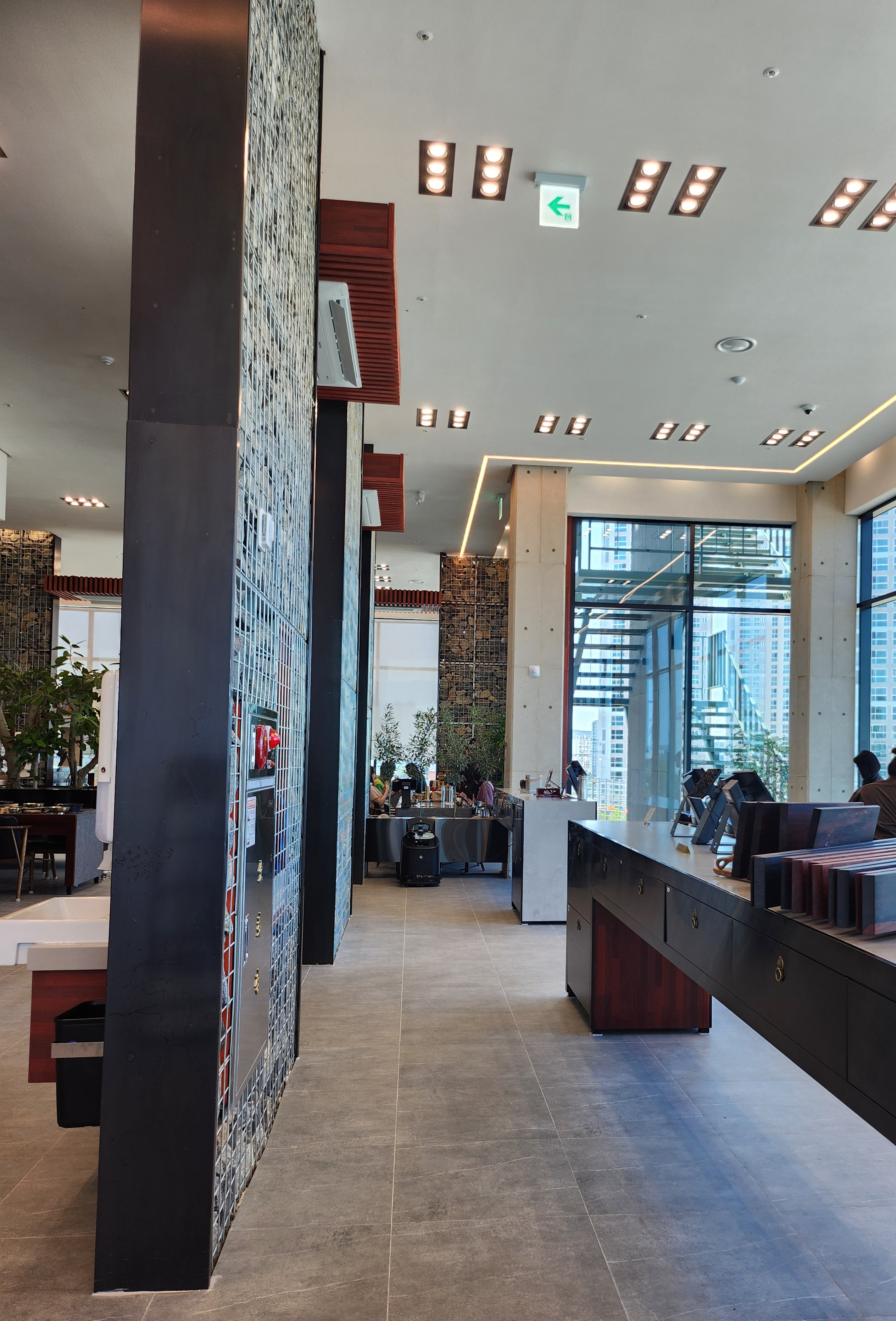 주차장에서 계단을 통해 올라가면 1층으로 들어가요. 그곳에서 주문을 하고 대기실이 있어서 예약하고 기다리면 2층으로 올라가서 식사를 하실 수 있어요. 주문 카운터 잎에 천정 위로 솟아있는 대나무가 멋있어요.