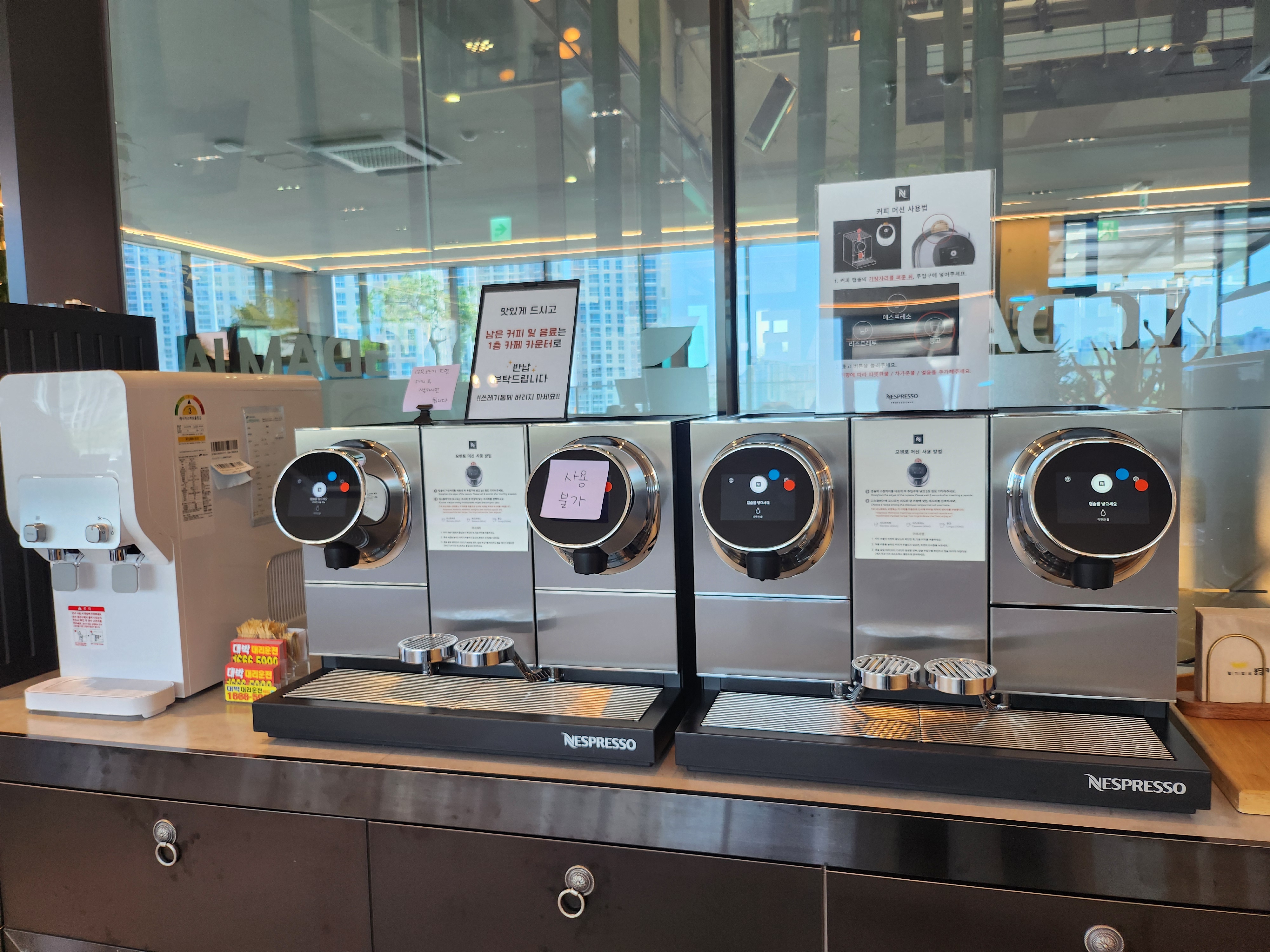 여기는 캡슐 커피를 내려서 먹을 수 있어요. 식사 후에 1층에서 캡슐을 받아오면 맛있는 커피를 마실 수 있어요. 냉커피도 가능해요.