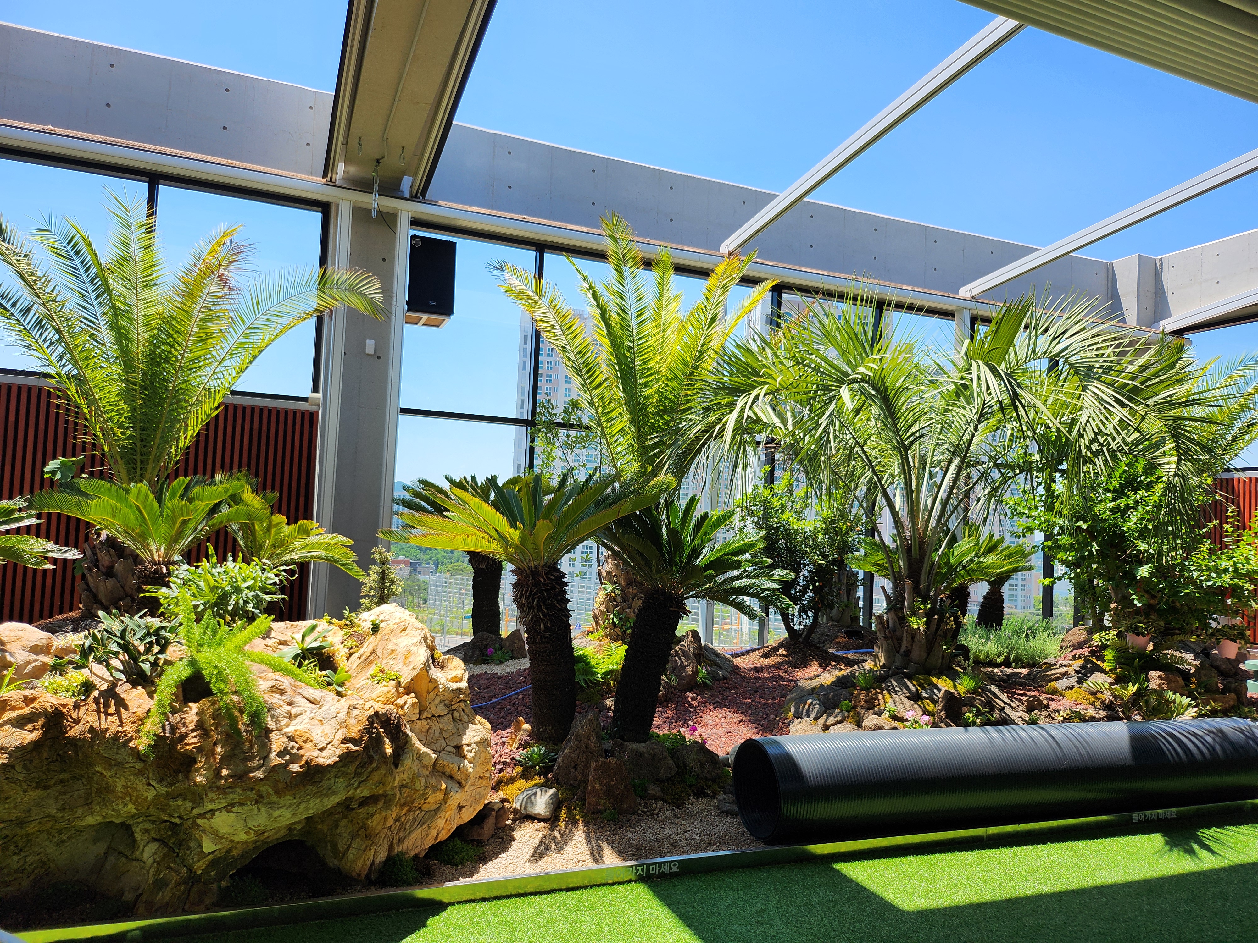 하늘정원은 온실 느낌이 나네요. 탁 트인 느낌도 좋고 파란 하늘 아래 좋았는데 따듯한 커피는 마시기에 더워서 1층으로 가요. 1층의 주문하고 대기하던 곳이 차를 마시면서 쉬어 갈 수도 있는 공간입니다.
