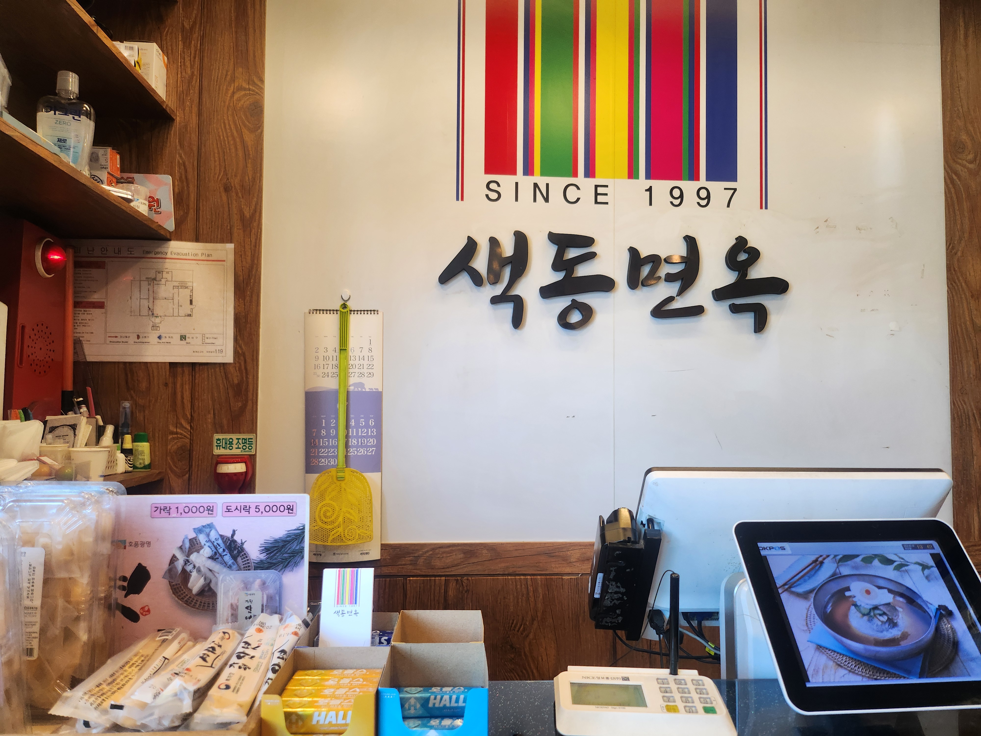 색동면옥의 외관입니다 건물 앞에 주차장이 넓어요 그래도 주차를 할 때는 늘 녹녹지 않아요. 식사하러 오는 사람들로 늘 붐비더라고요. 그래도 주차를 못하지는 않아요 ㅎㅎㅎ. 카운터 모습입니다. 다양한 군것질을 팔고 있네요.