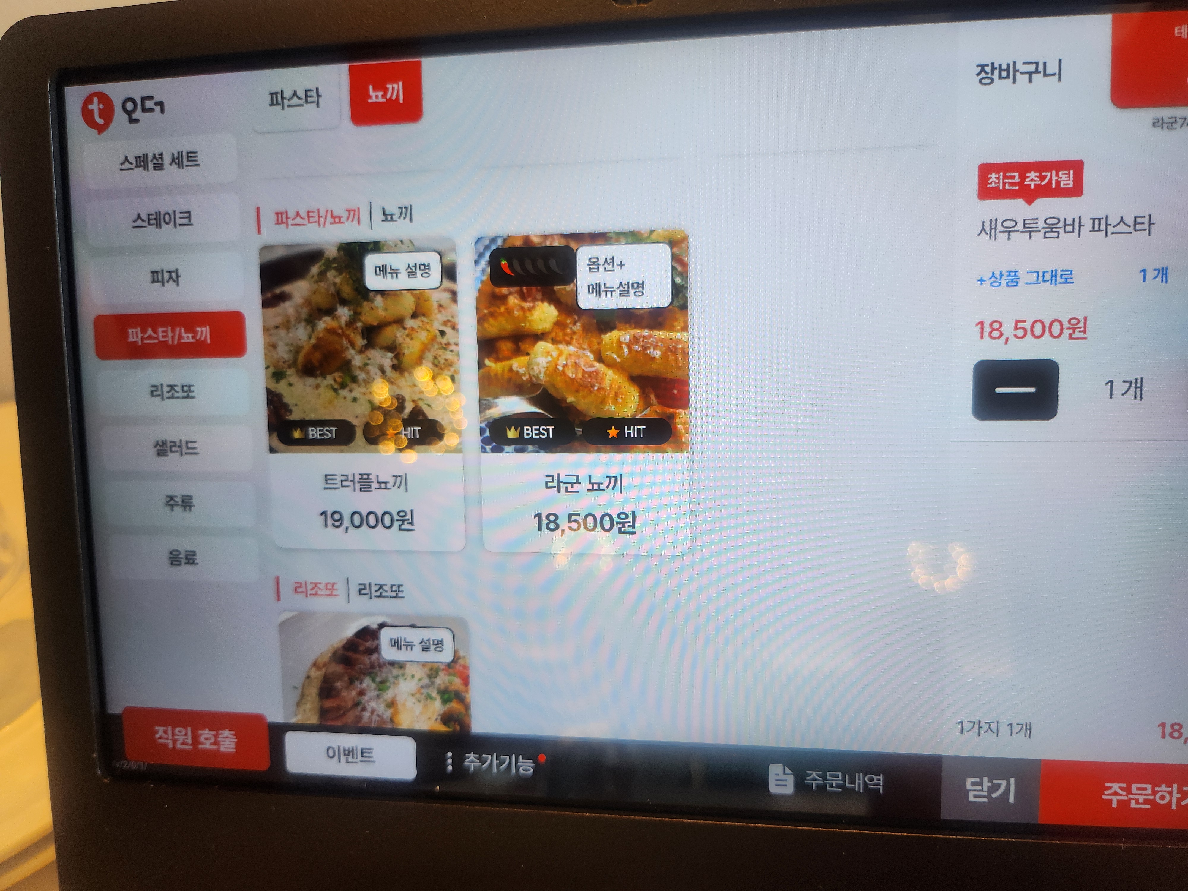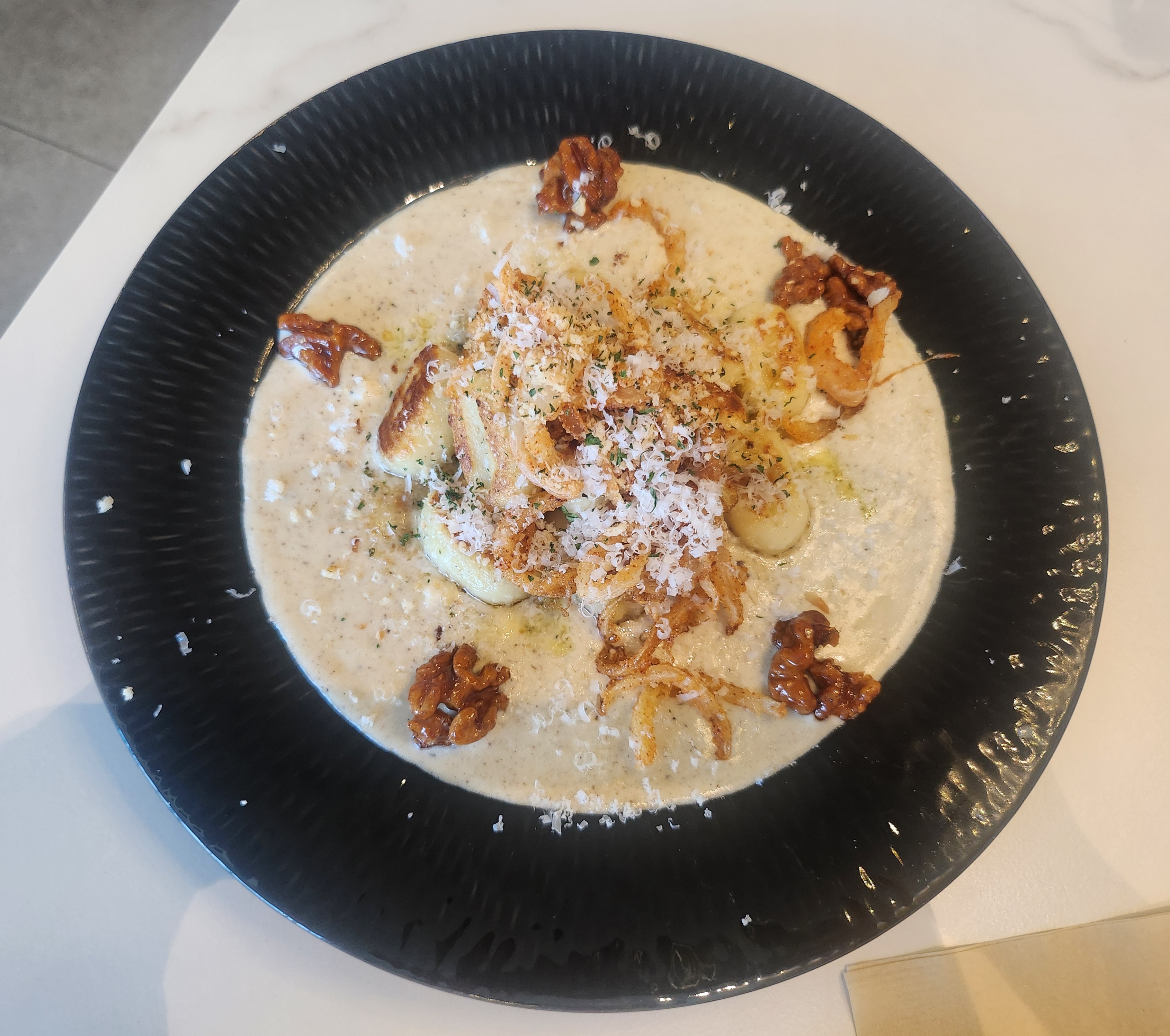 드디어 트러플 치즈 뇨끼가 나왔어요. 뇨끼가 어떤 재료의 음식인지 찾아보고 그 맛을 느껴보니 옹심의 쫄깃함이 아니라 감자의 맛이 있지만 정말 부드러운 크림치즈에 트러플향이 소스를 열심히 자꾸 떠먹게 되더라고요^^.