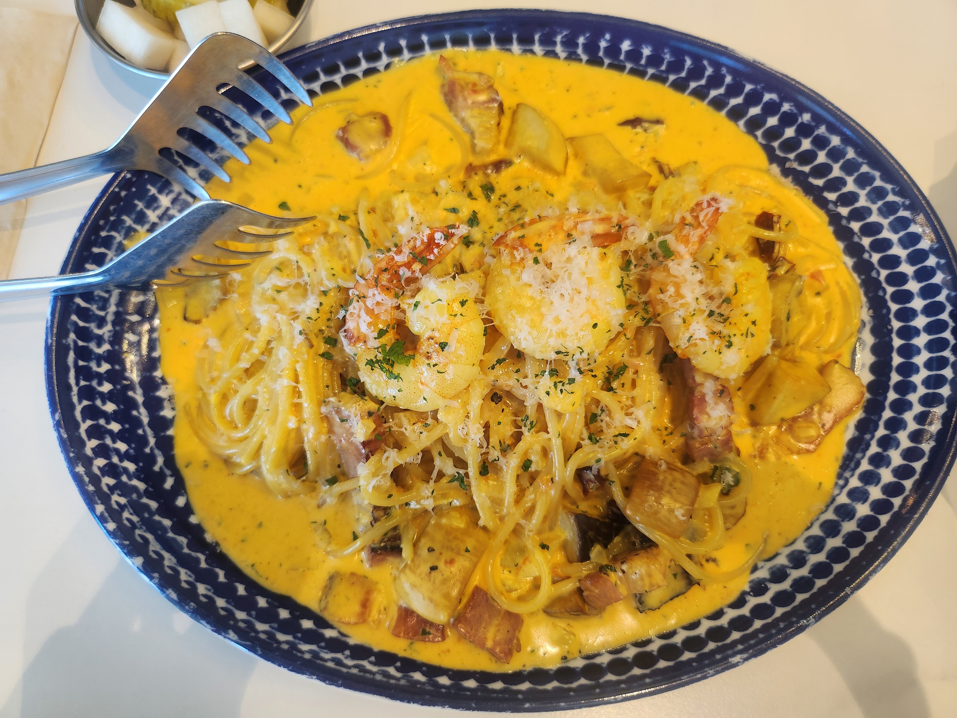 새우 투움바 파스타입니다. 직접 만든 수제 베이컨과 새우, 양송이가 올라간 라군 특제 크림파스타입니다. 저는 평소에 크림파스타를 잘 안 먹었었는데 오늘 크림파스타는 부드러운 맛에 살짝 매콤한 게 입맛을 돋우네요^^.