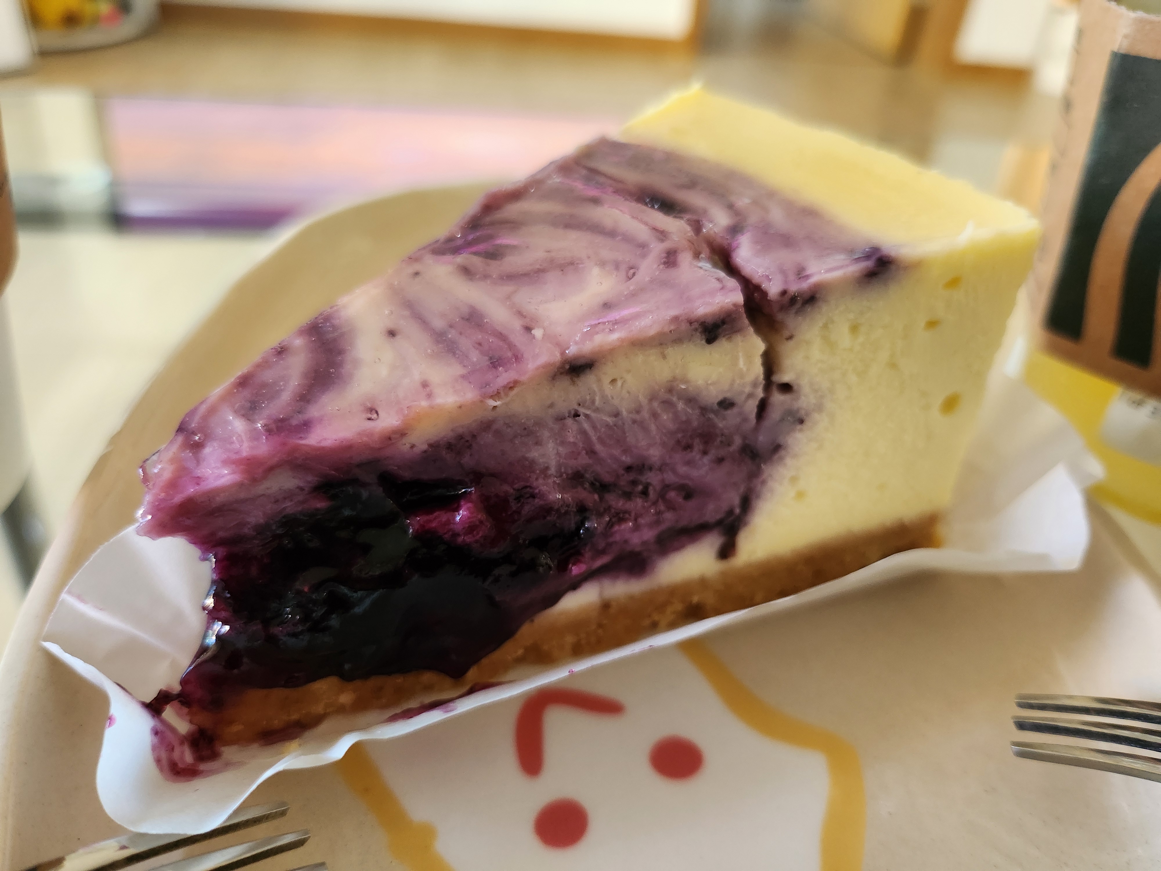 케이크는 블루베리 마블 치즈 케이크인데 많이 달지 않고 맛있어요. 케이크 아래 쿠키도 맛있네요. 다음에 매장에 가면 기억해 두었다가 한번 더 먹고 싶네요.