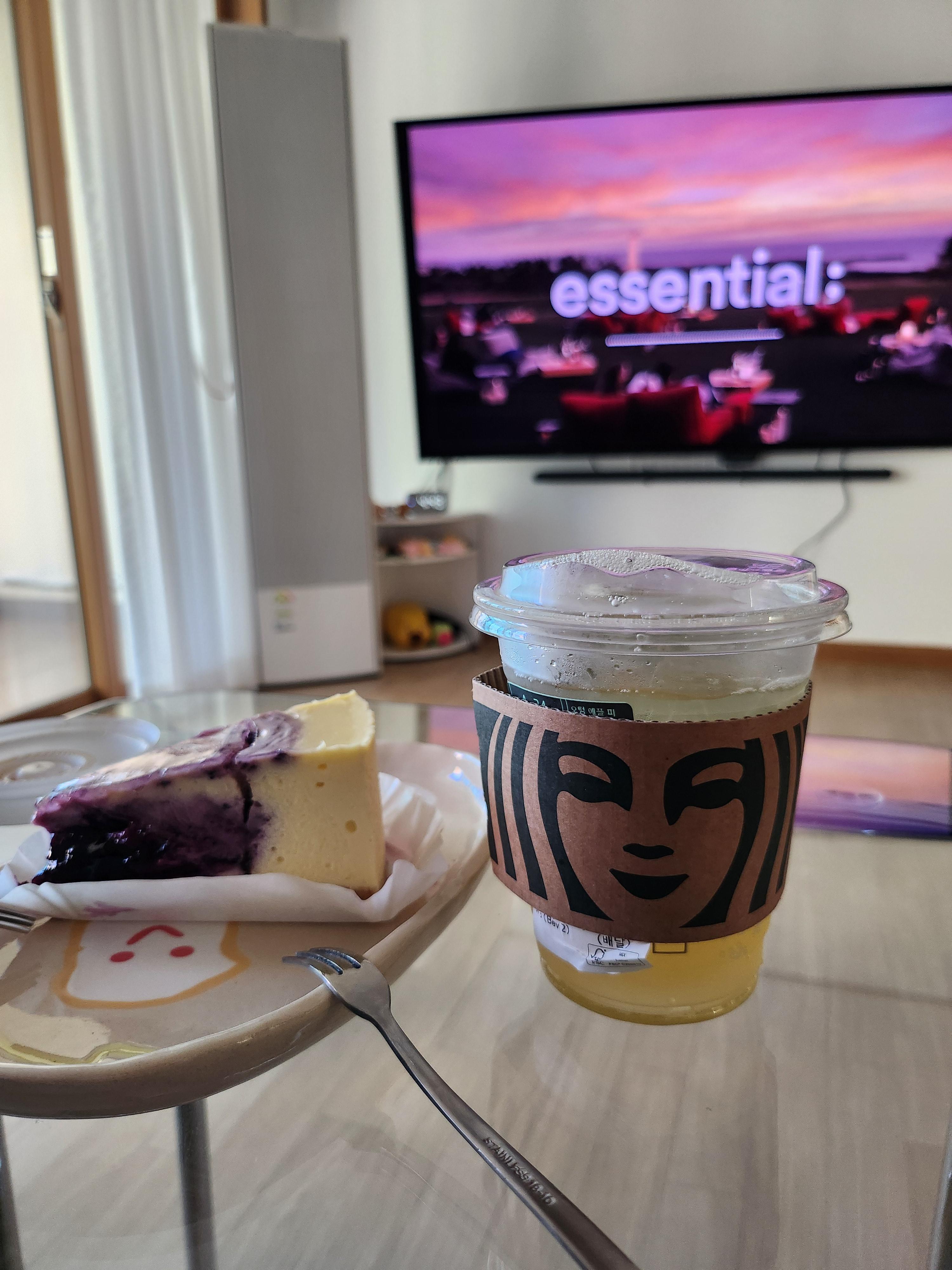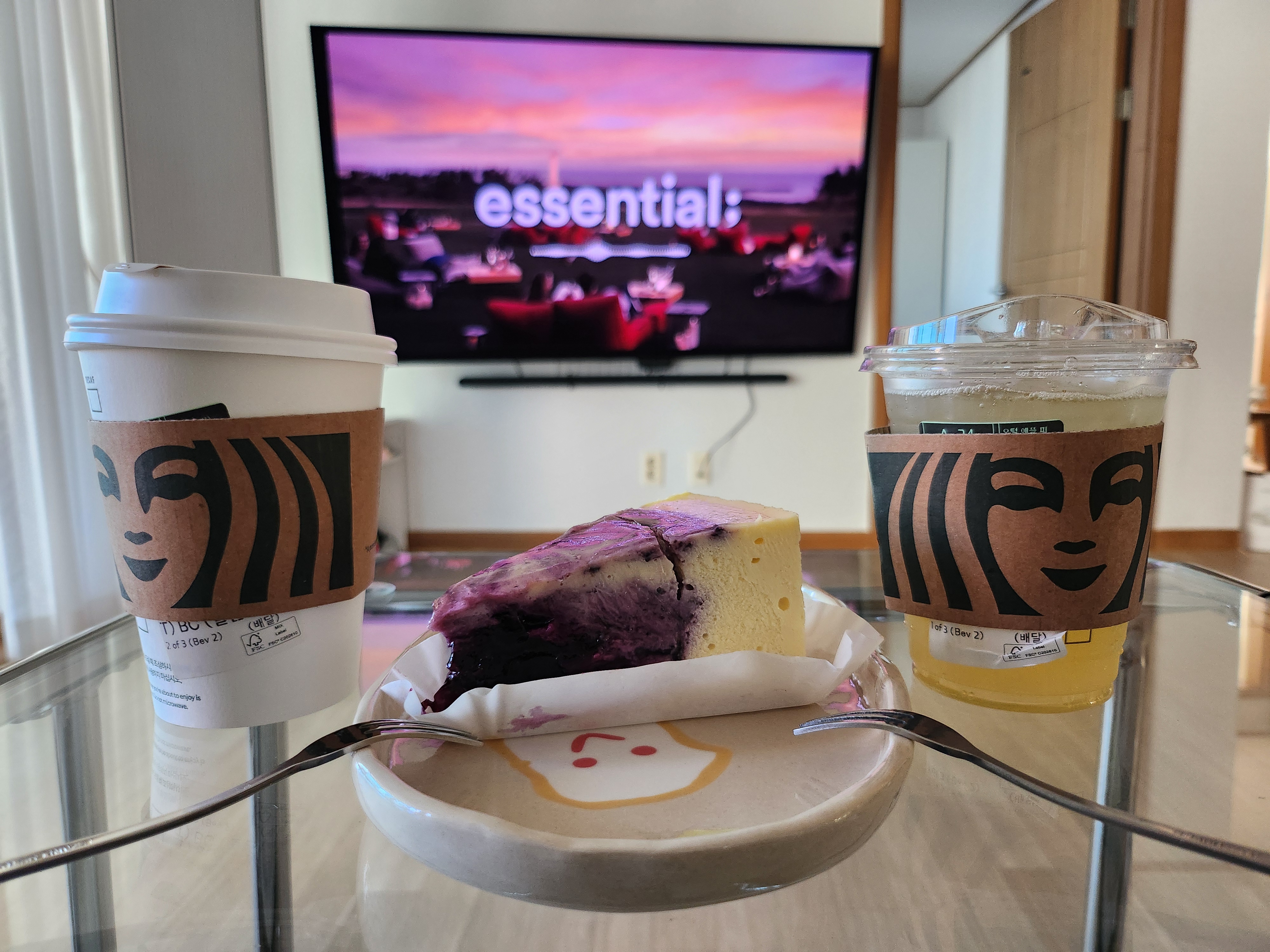 스타벅스에서 배달되어 온 음료와 케이크를 너무 편안한 자세로 즐길 수 있네요. 아이들이 모두 독립하고 둘만 남은 우리 부부는 배달 음식을 거의 먹지 않고 있다 보니 커피까지 배달을 시킨다는 건 생각지도 않았으니 즐겁네요 그래도 저는 커피 정도는 집에서 내려 먹을 거 같지만 ㅎㅎㅎ.