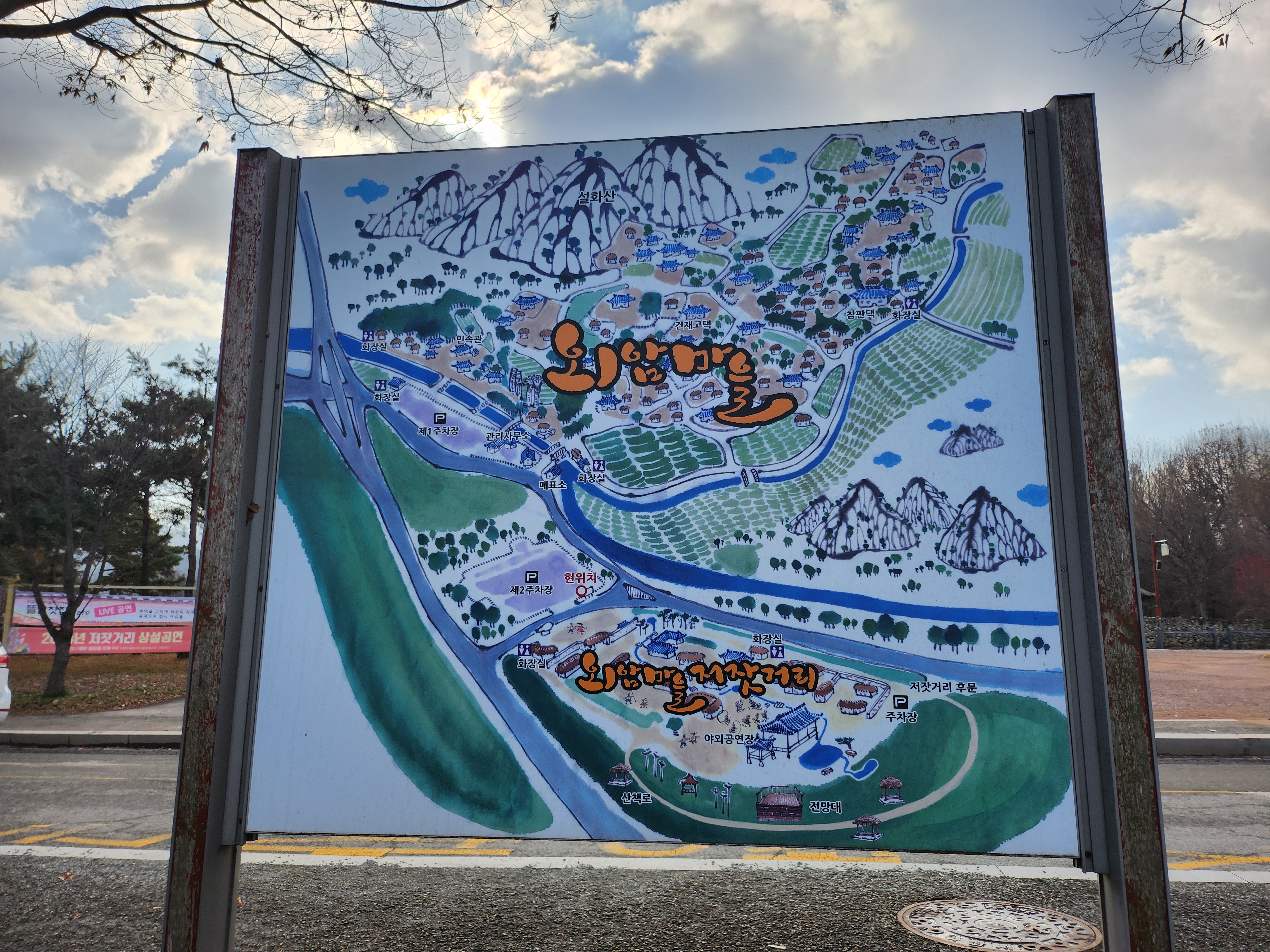 외암마을은 점심을 먹기위해 잠깐 들렀는데 차에서 내리니 날씨가 아주 쌀쌀하네요. 외암마을 제2 주차장에 주차를 하고 외암마을 저잣거리로 들어갔어요. 안내 지도를 보니 외암마을 민속마을도 꽤나 넓은 거 같아요. 오늘은 저잣거리에서 점심만 먹기로 했어요.