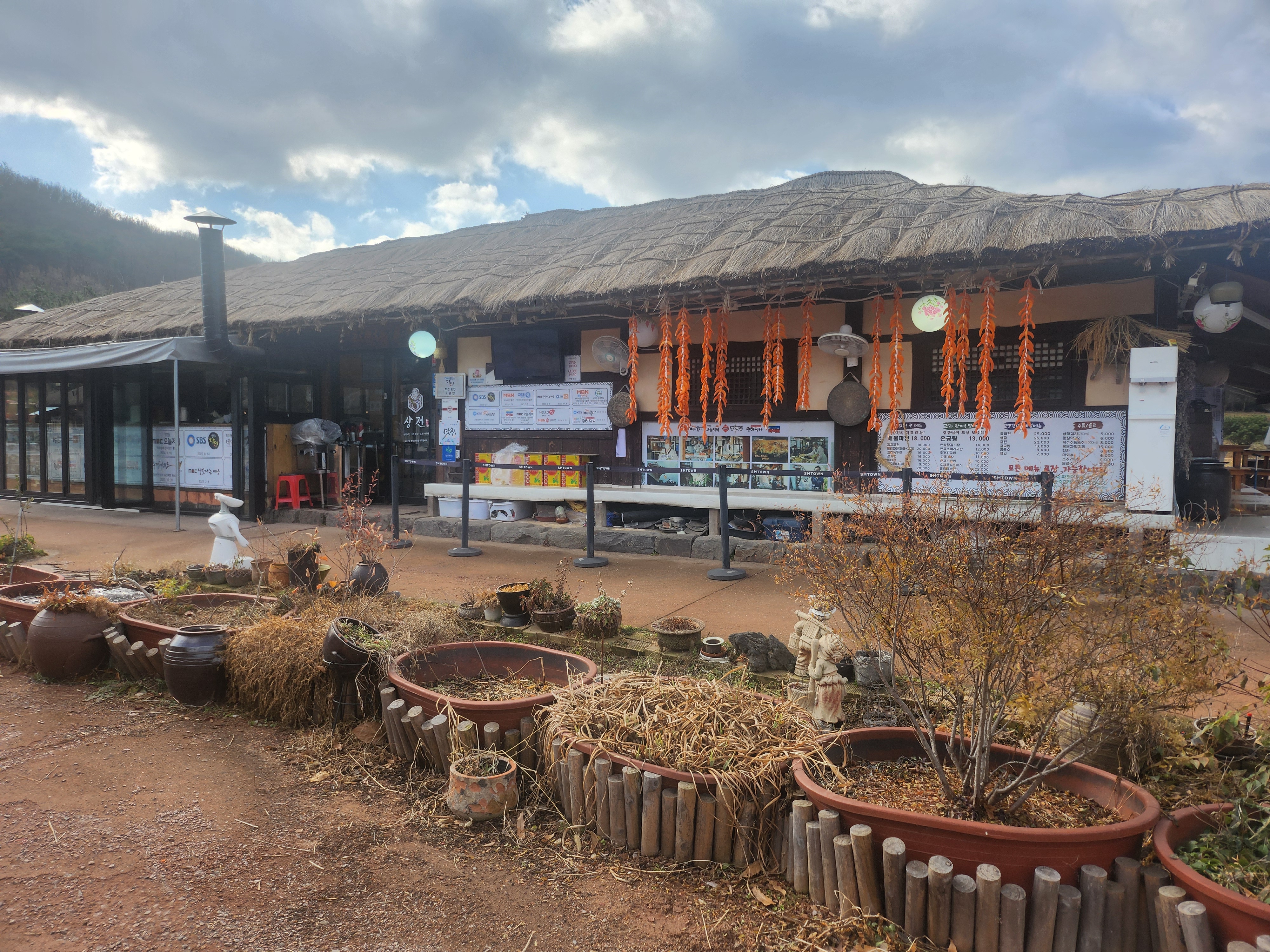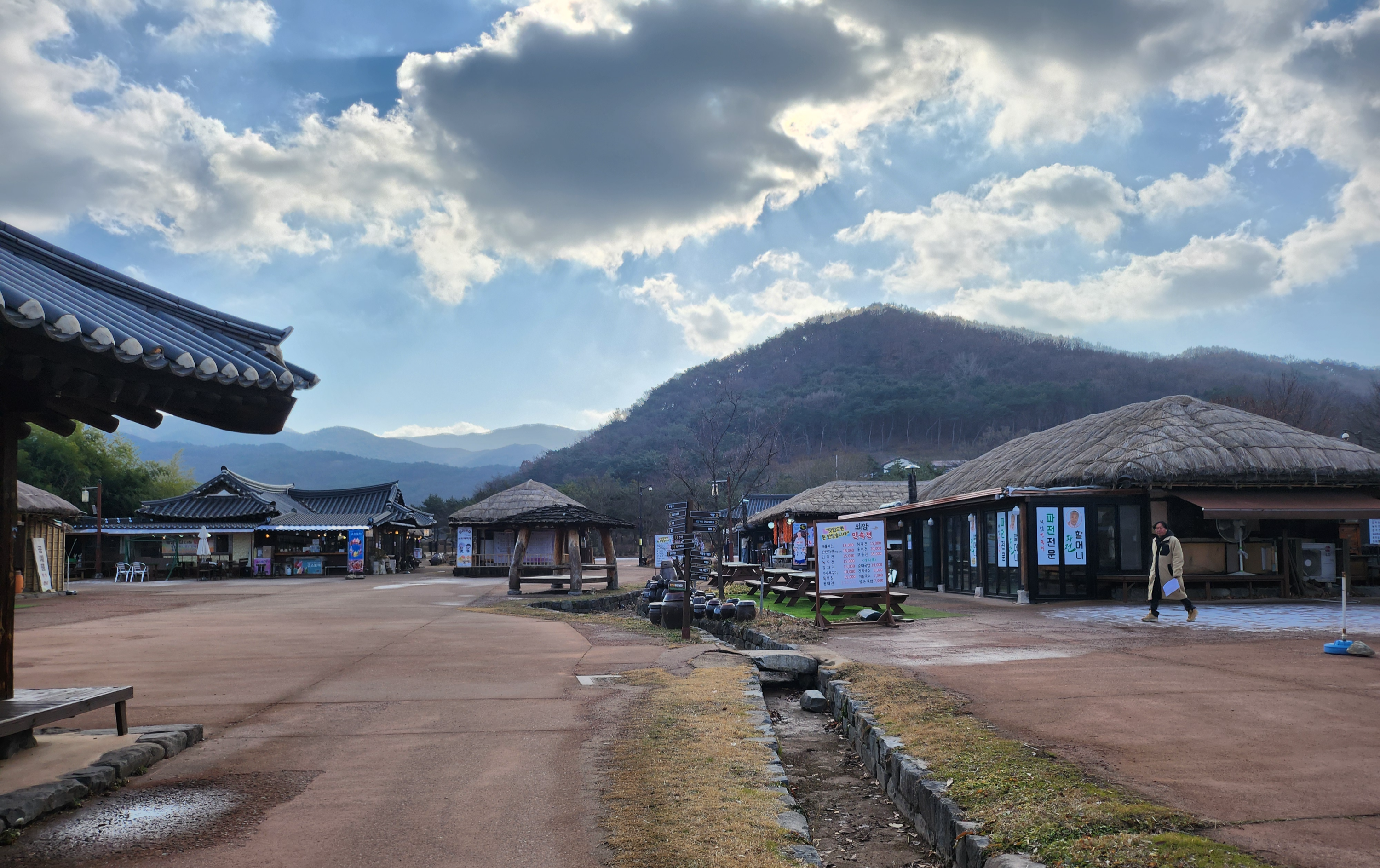 요즘은 보기드문 풍경이지요. 초가지붕이 겨울날 낮은 구름아래 너무 멋지지 않나요. 오늘의 목적지인 외암마을 저잣거리 입구입니다.
