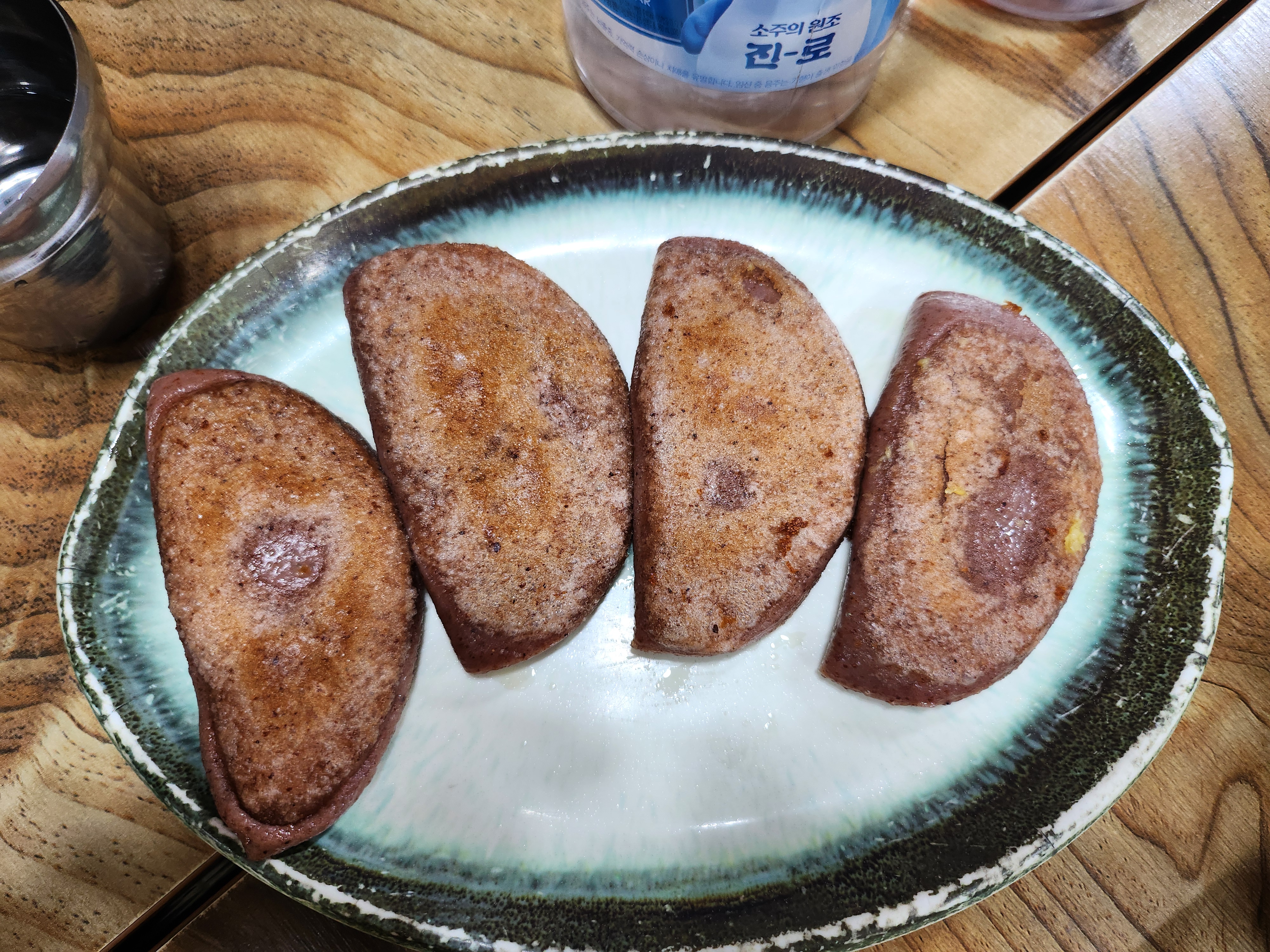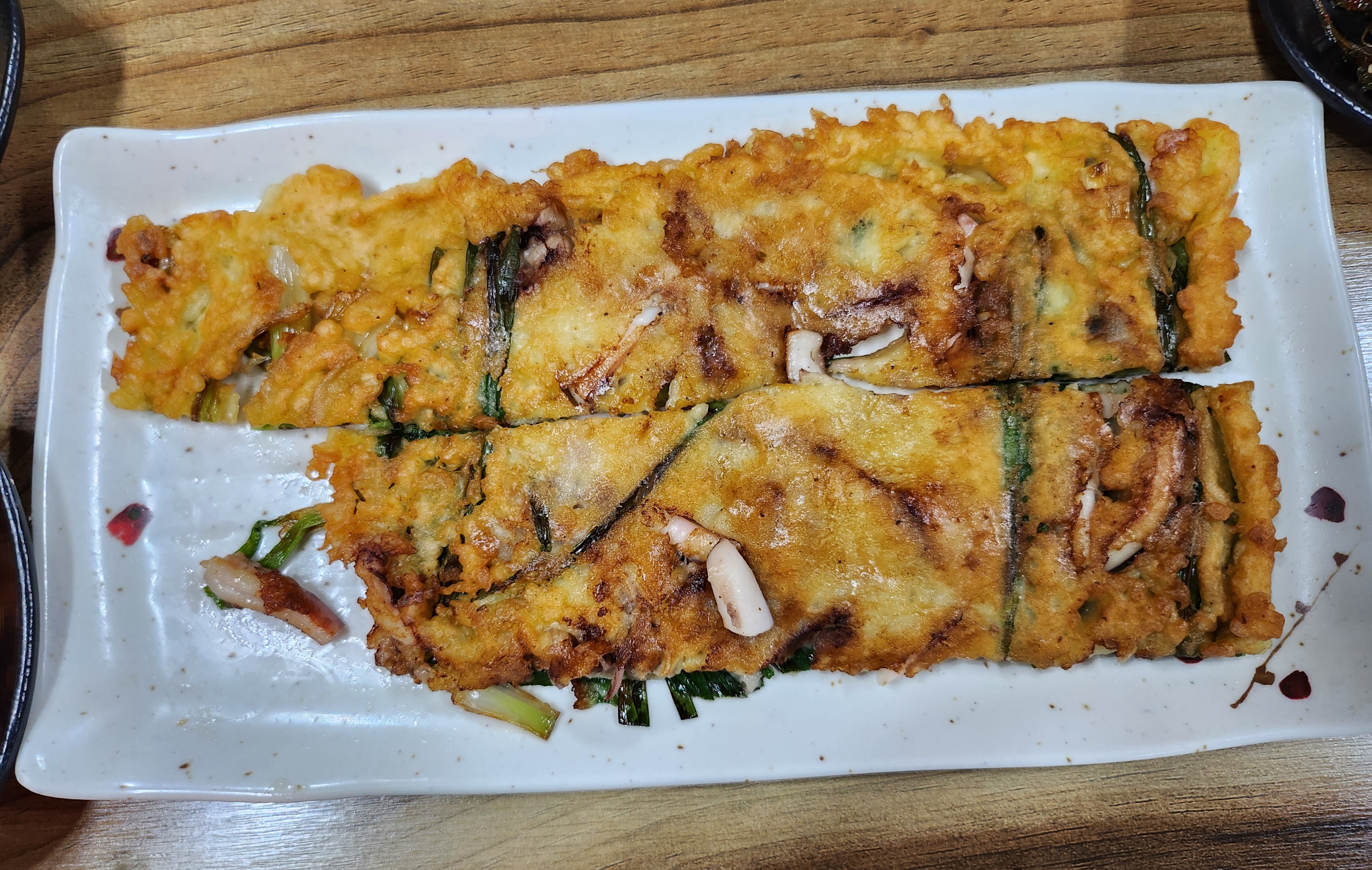 드디어 해물 파전 수수부꾸미가 나왔어요. 저희가 테이블을 둘로 나눠 앉아서 해물파전을 샌스만점 주인 할머니가 두접시로 나눠 주셨어요. 전의 크기가 엄청 크더라고요. 그리고 상전은 밀가루 반죽이 아니고 "11가지 곡물가루를 혼합한 특제반죽프리미엄파전"이라고 자랑을 하시는데 정말 고소하고 맛있었어요.
