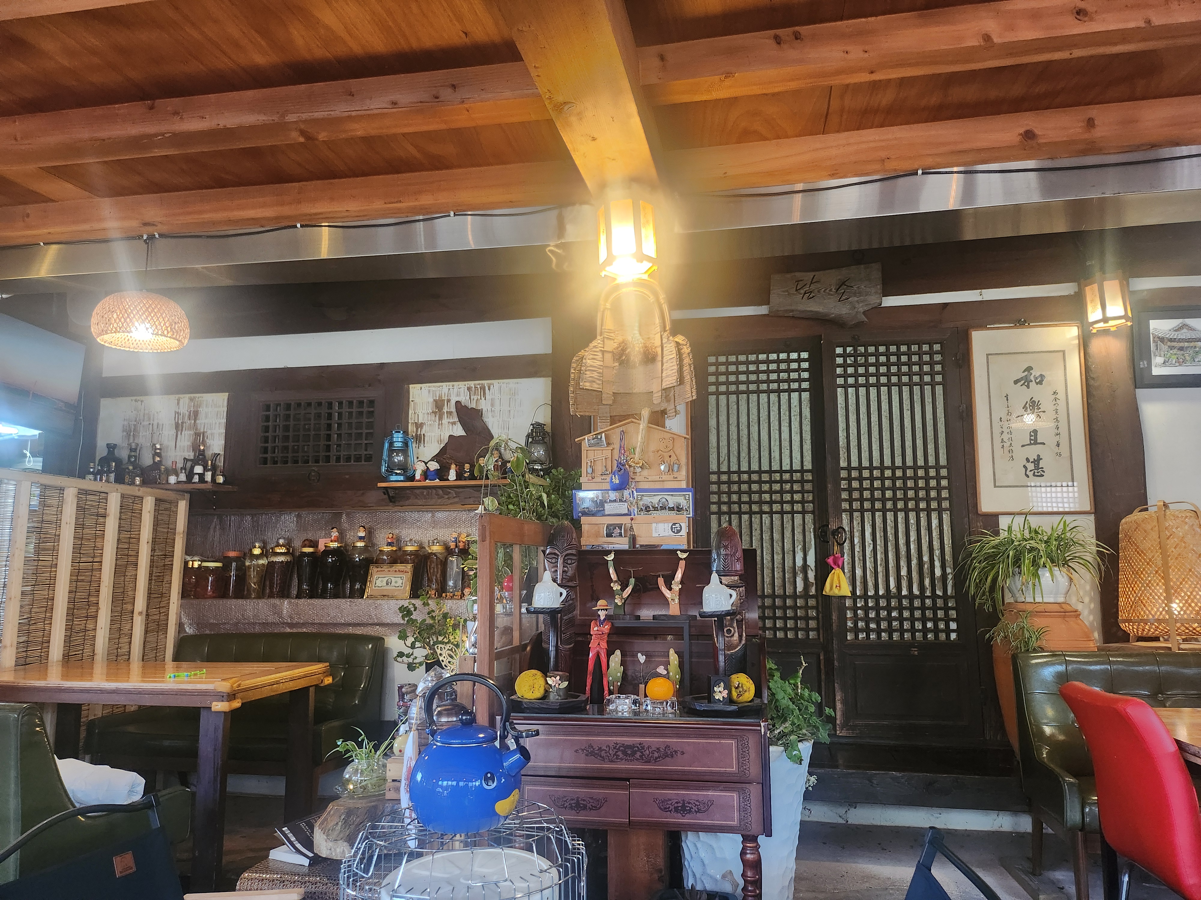 들어가면서 여기저기 둘러보는데 범상치 않은 포스가 느껴지는 집이지요 우리는 자리에 앉으면서 쌍화차와 대추차를 주문했어요. 문 앞에 라이브를 하는 곳이라고 쓰여있더니 멋진 무대가 있네요. 주말과 공휴일에만 라이브 연주를 한다고 하네요.