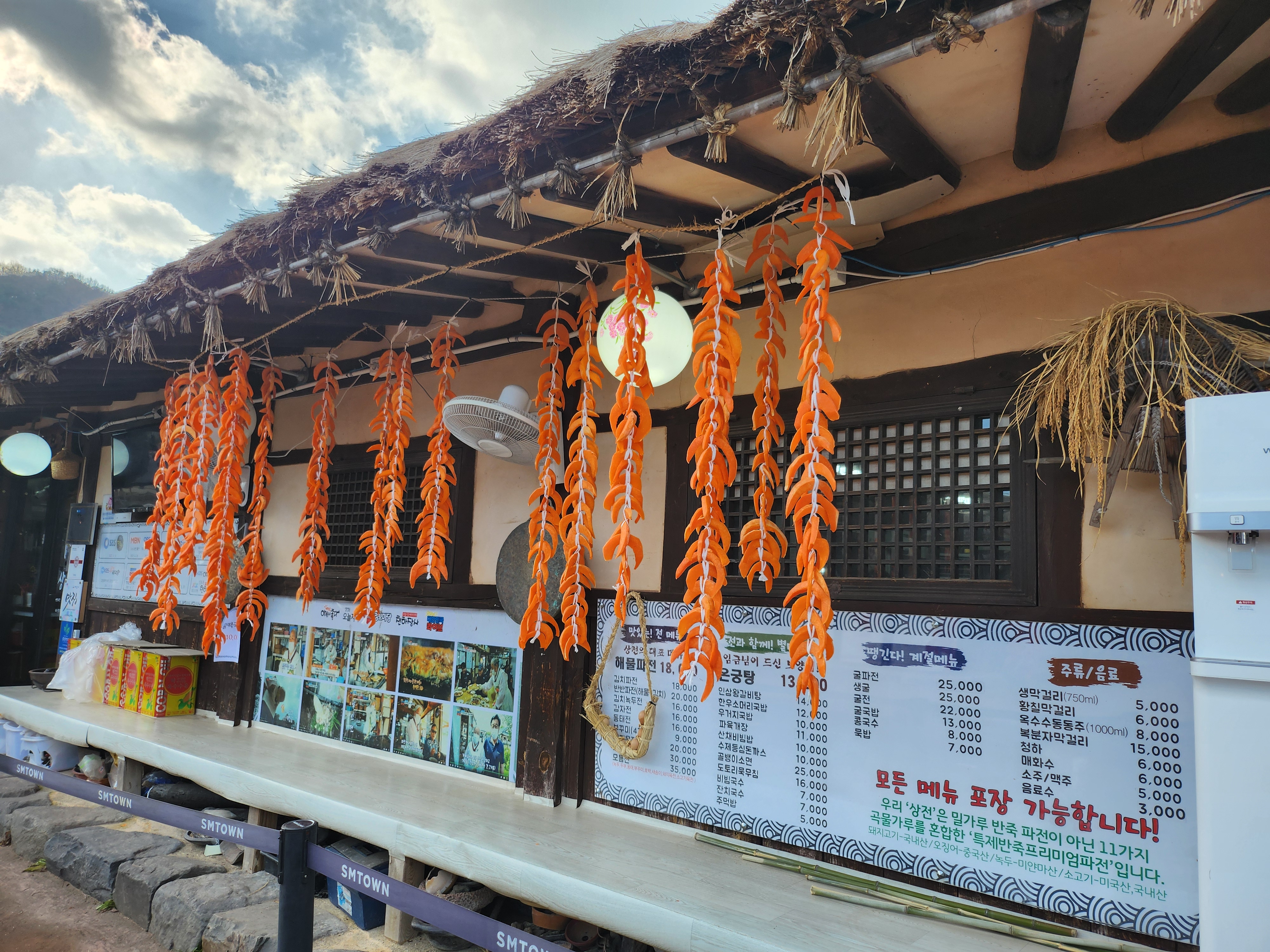 오늘의 목적지인 전집에 왔는데 처마끝에 매달린 호박꼬자리에 다들 감탄을 하네요. 저걸로 만드는 요리들도 모두 아는 우리는 행복한 옛 추억을 이야기하네요 재잘재잘 해물파전을 먹기로 하고 들어가 보려고 합니다.