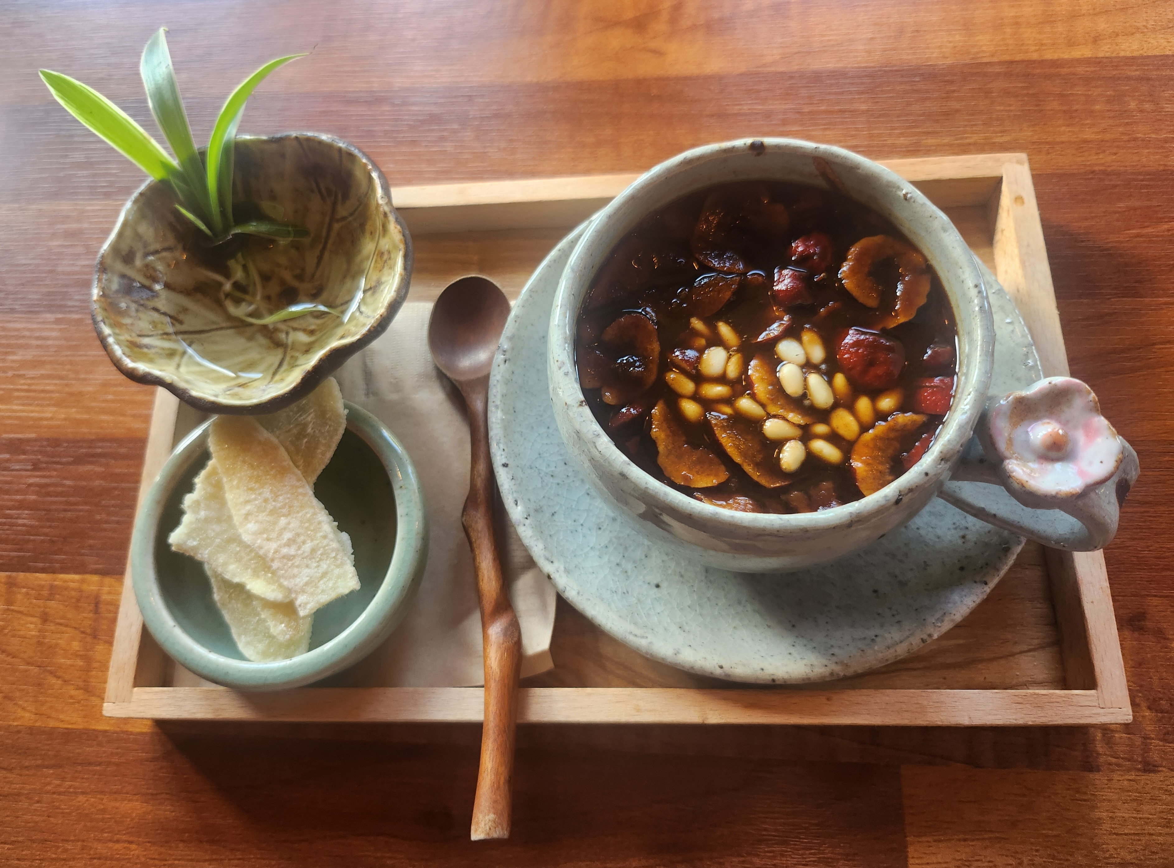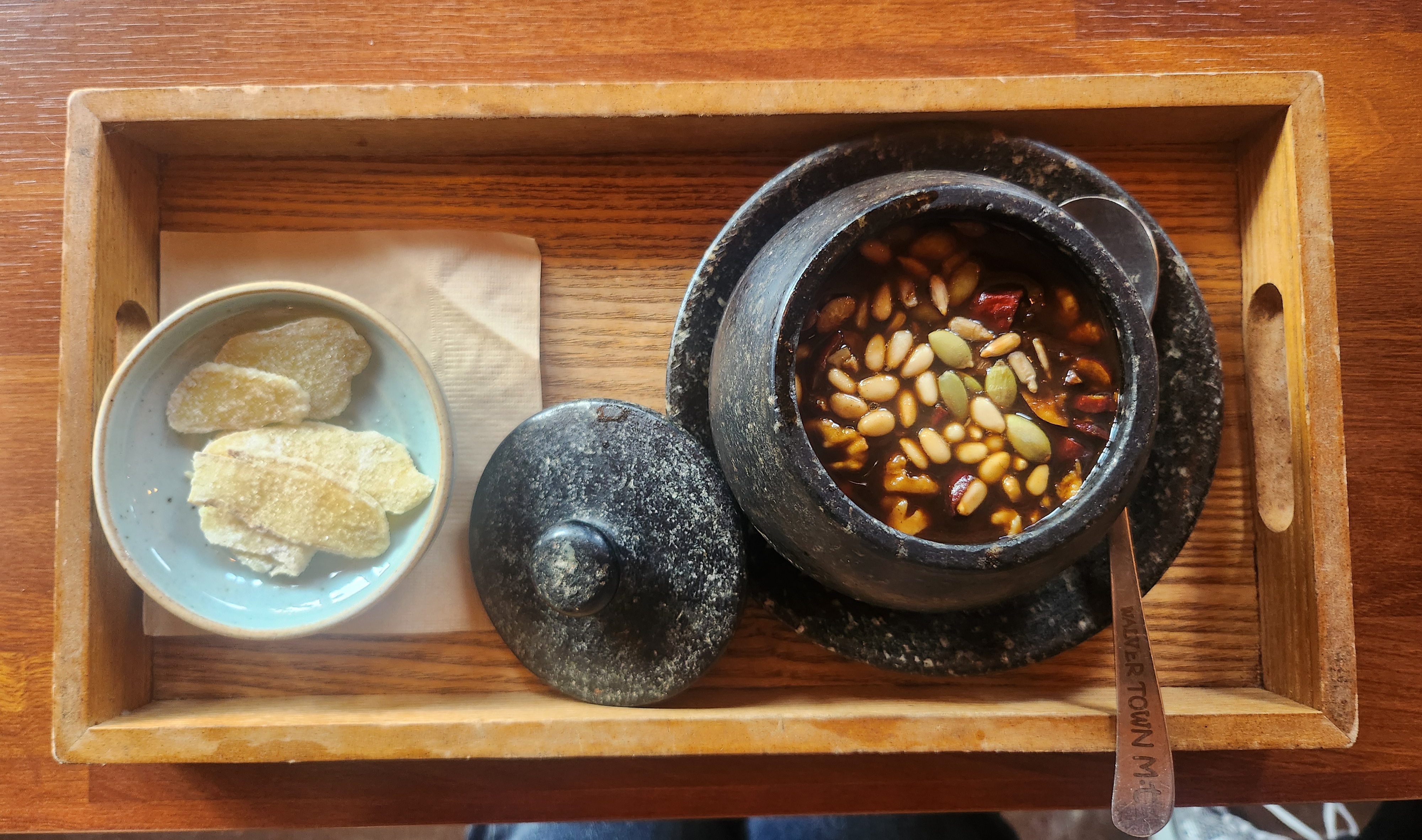 직접 달여서 만들어 주시는 대추차와 쌍화차는 정성 가득한 모습으로 가져다주시네요. 진한 차 맛은 온몸을 덥혀주는 게 살짝 있던 감기기운이 사라지는 듯했어요. 쌍화차 잔은 들 수가 없게 무겁고 뜨거워요. 한참을 숟가락으로 떠먹은 후에 마실 수 있었어요.