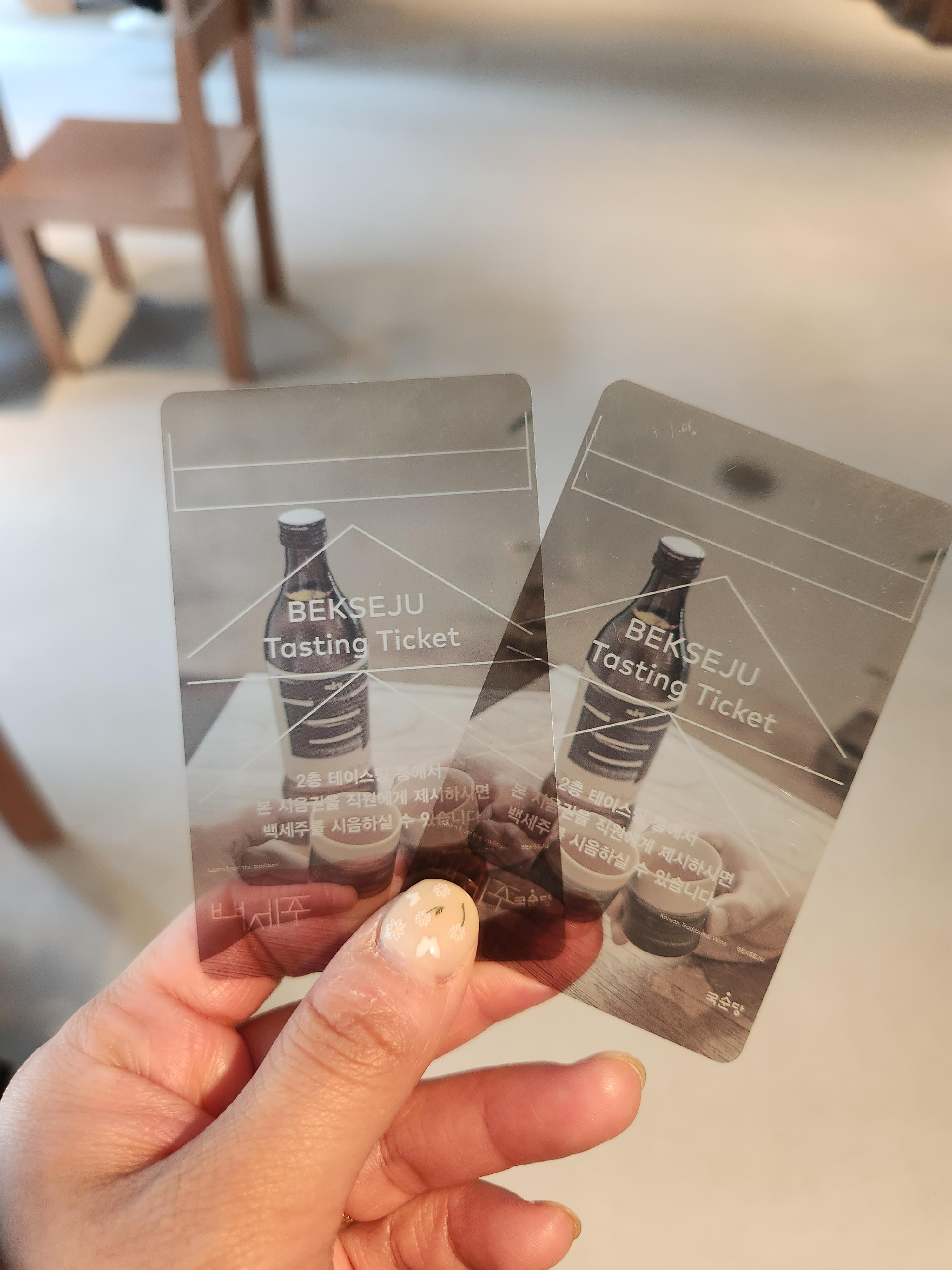 드디어 딸이 진동벨을 가지고 왔어요 박봉담이 귀엽네요. 아 그리고 주문을 하고 나면 시음할 수 있는 카드를 받을 수 있어요 2층 한편에 백세주를 시음할 수 있어서 자리는 합석하신 분들께 부탁하고 시음하러 갔어요 백세주랑 안주로 준비되어 있는 양갱은 맛있네요 백세주는 전에 먹었던 거랑은 좀 다르더라고요 먹기 좋은 맛이었어요 시음 하나로 대접받는 기분이네요 ㅎㅎㅎ