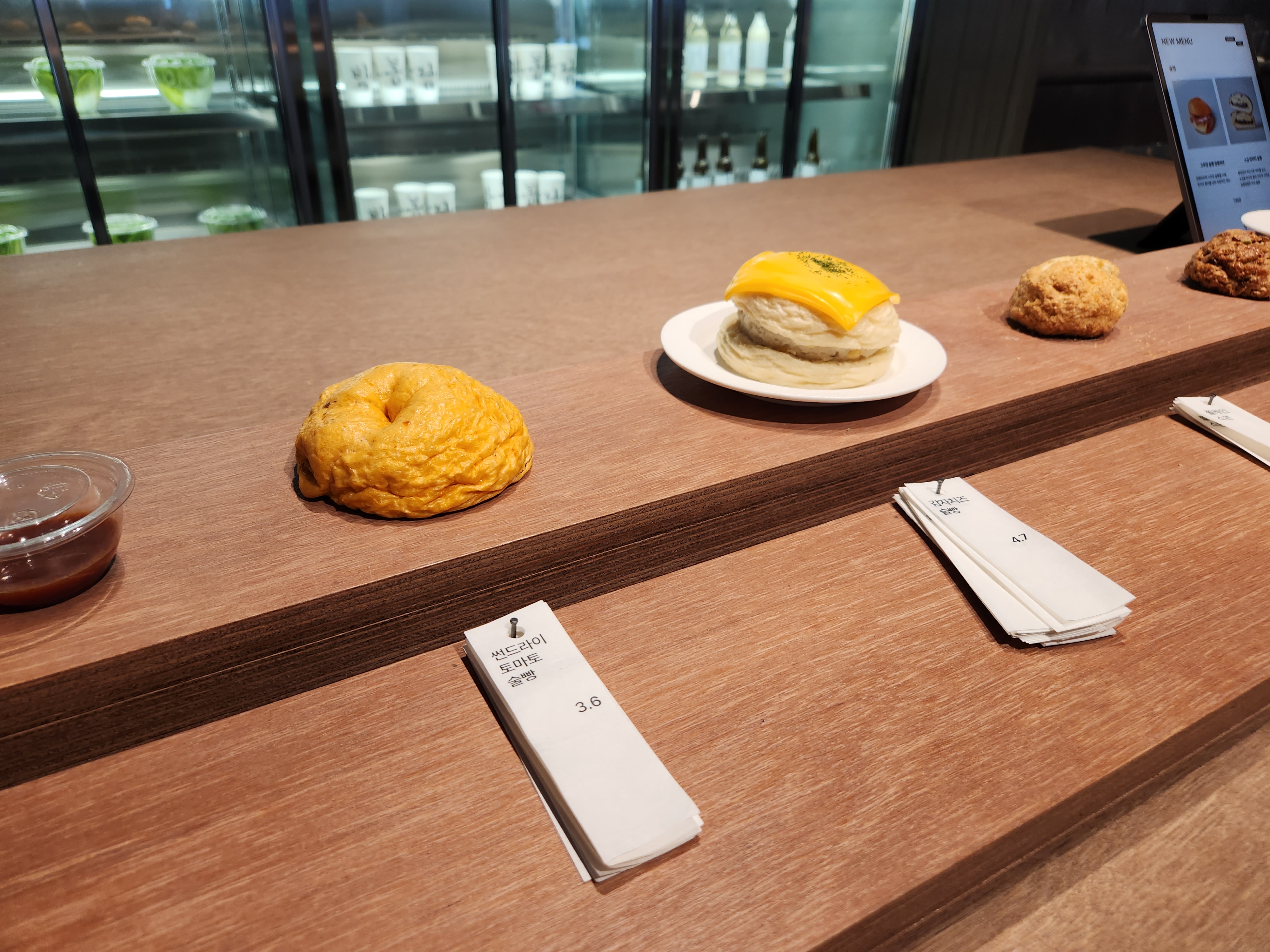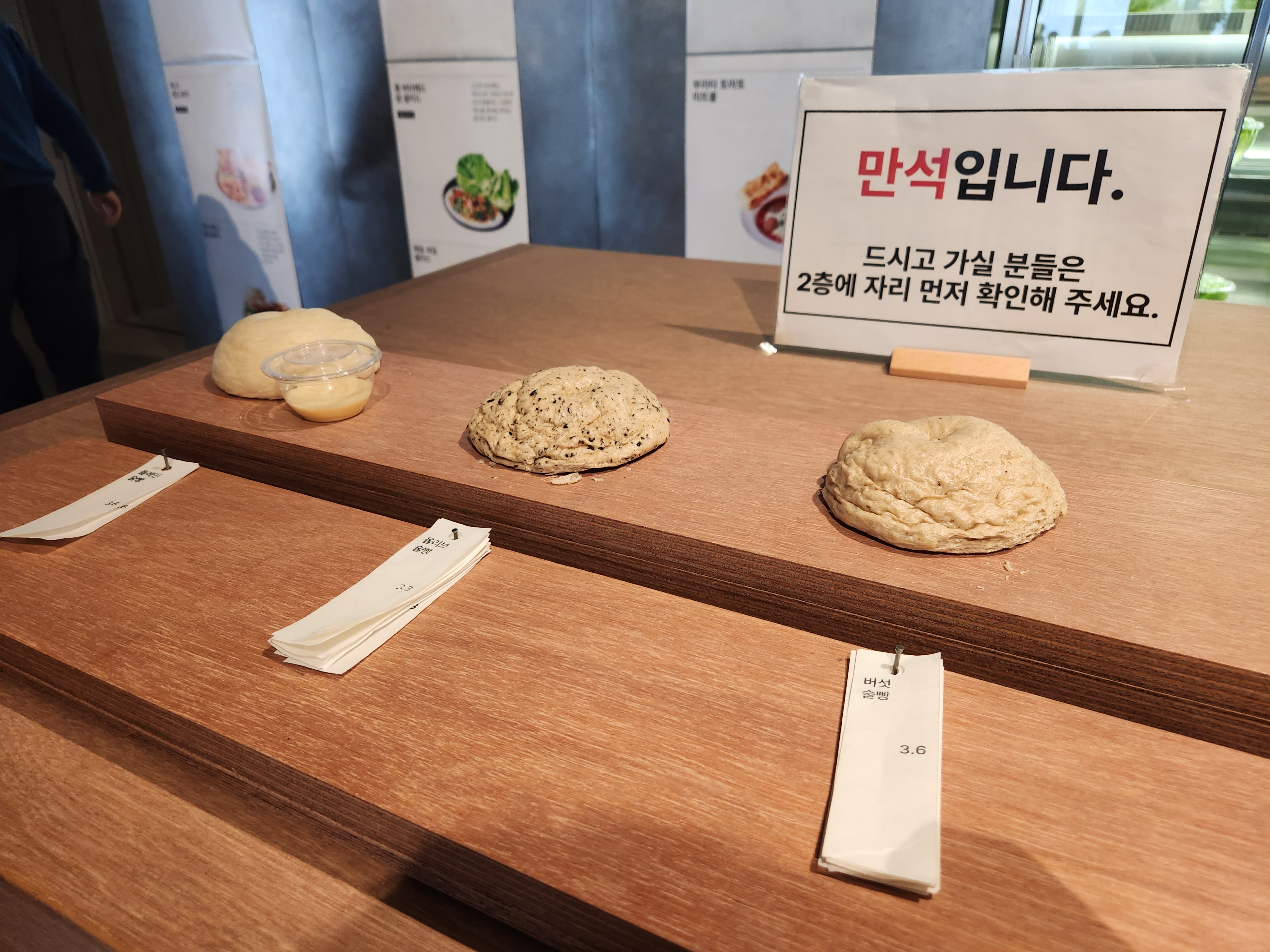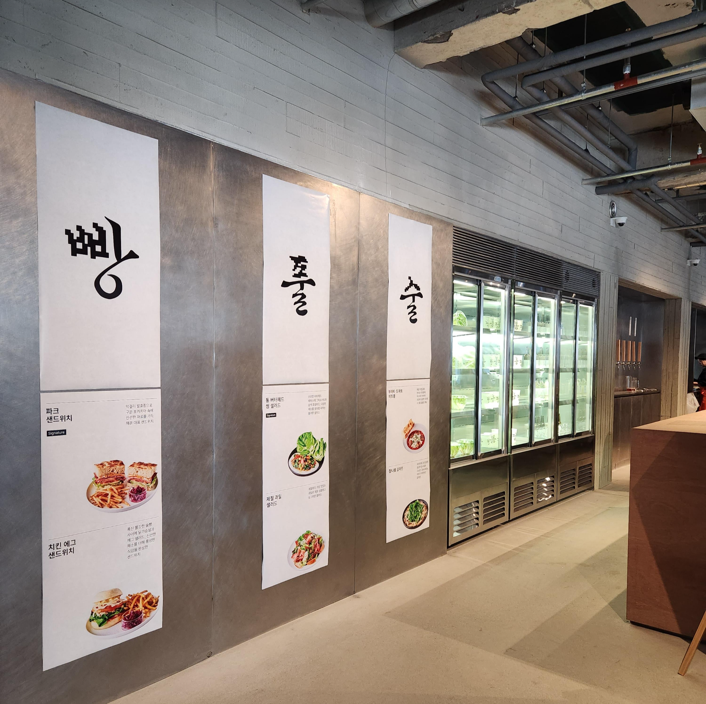 줄을 서서 벽에 글씨를 읽으면서 큰 글씨만 읽으니 빵, 풀, 술이라고 자세히 보면서 살짝 미소 짓게 하네요. 저희는 빵이랑 커피를 주문하기로 했어요.