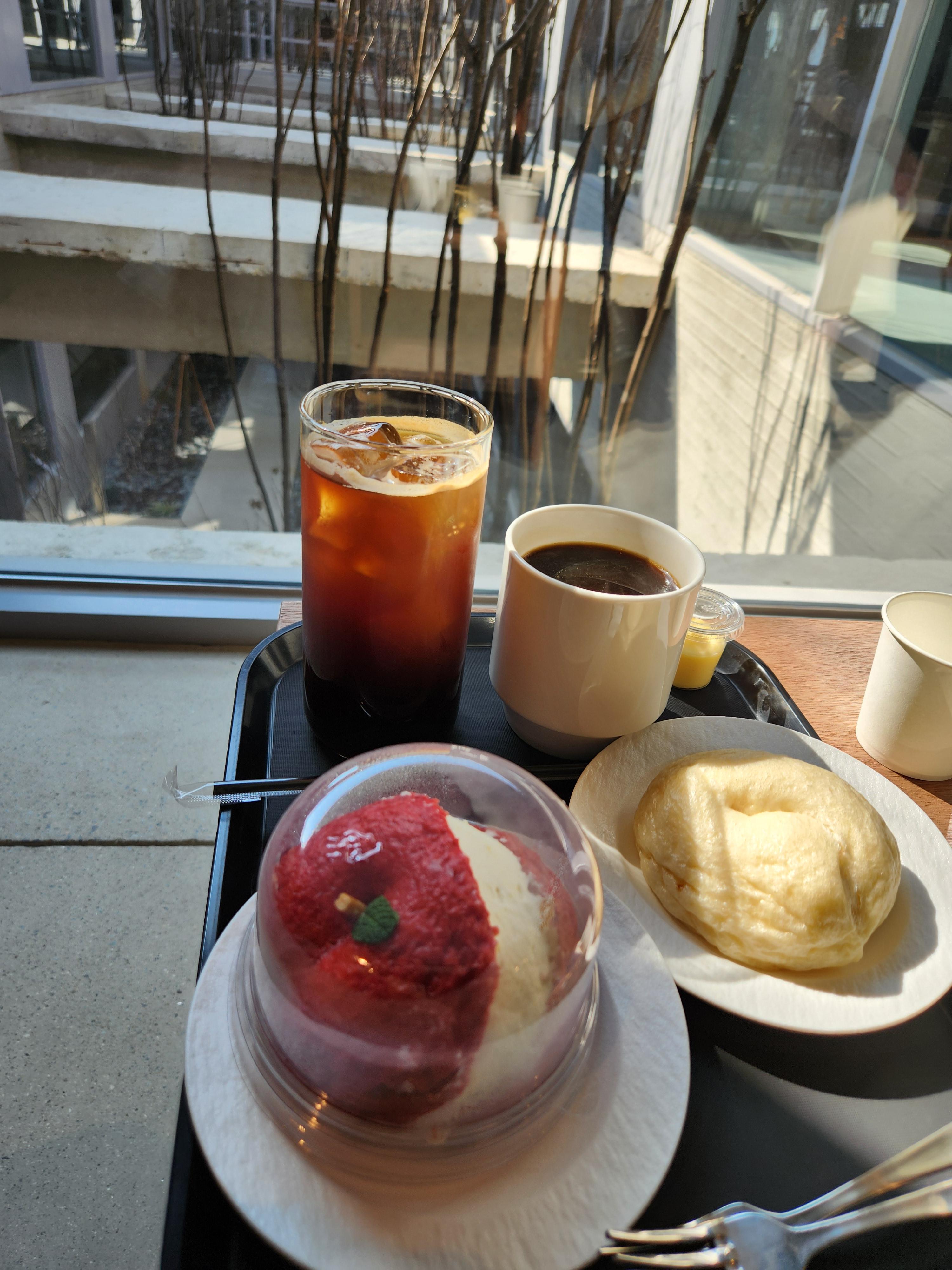 저희는 플레인 술빵, 애플커스터드술빵에 아메리카노를 주문했어요 딸이 먹고 싶은 걸로 시켰나 봐요 글쎄요 빵에 관심이 많지 않은 저에게는 그저 예쁜 게 맘이 드네요 1층에서 산책하 듯 걷던 그곳이 2층으로 올라와서 보니 멋진 배경이 되었네요.