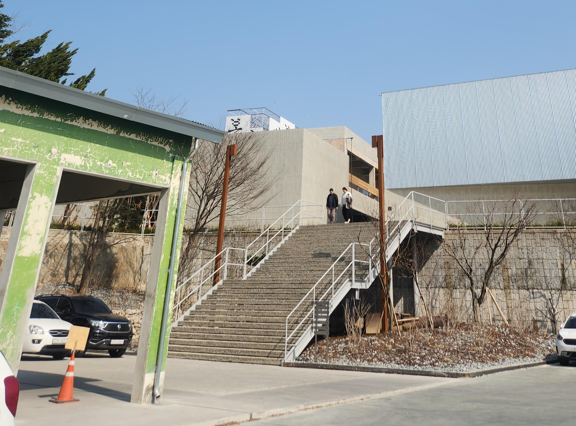 걷기 좋은 오늘은 계단도 나쁘지 않아요 지붕이 있는 주차공간도 있어서 더워지면 러키비키를 외칠 수도 있겠네요. 아직은 어디에 세워도 좋아요 건물 위로 보이는 하늘이 멋지네요 내부도 멋지기를 바라면서 올라갔지요.