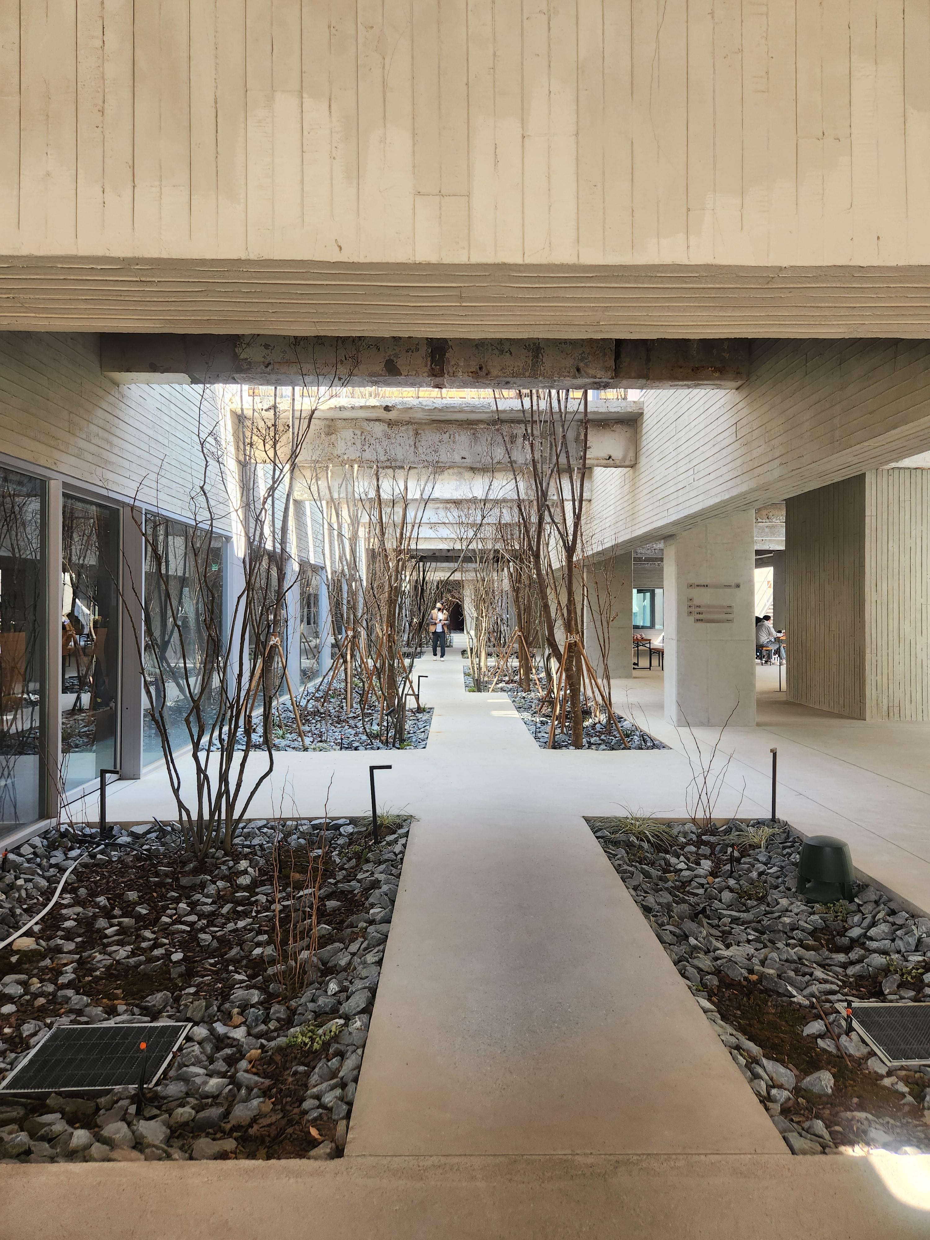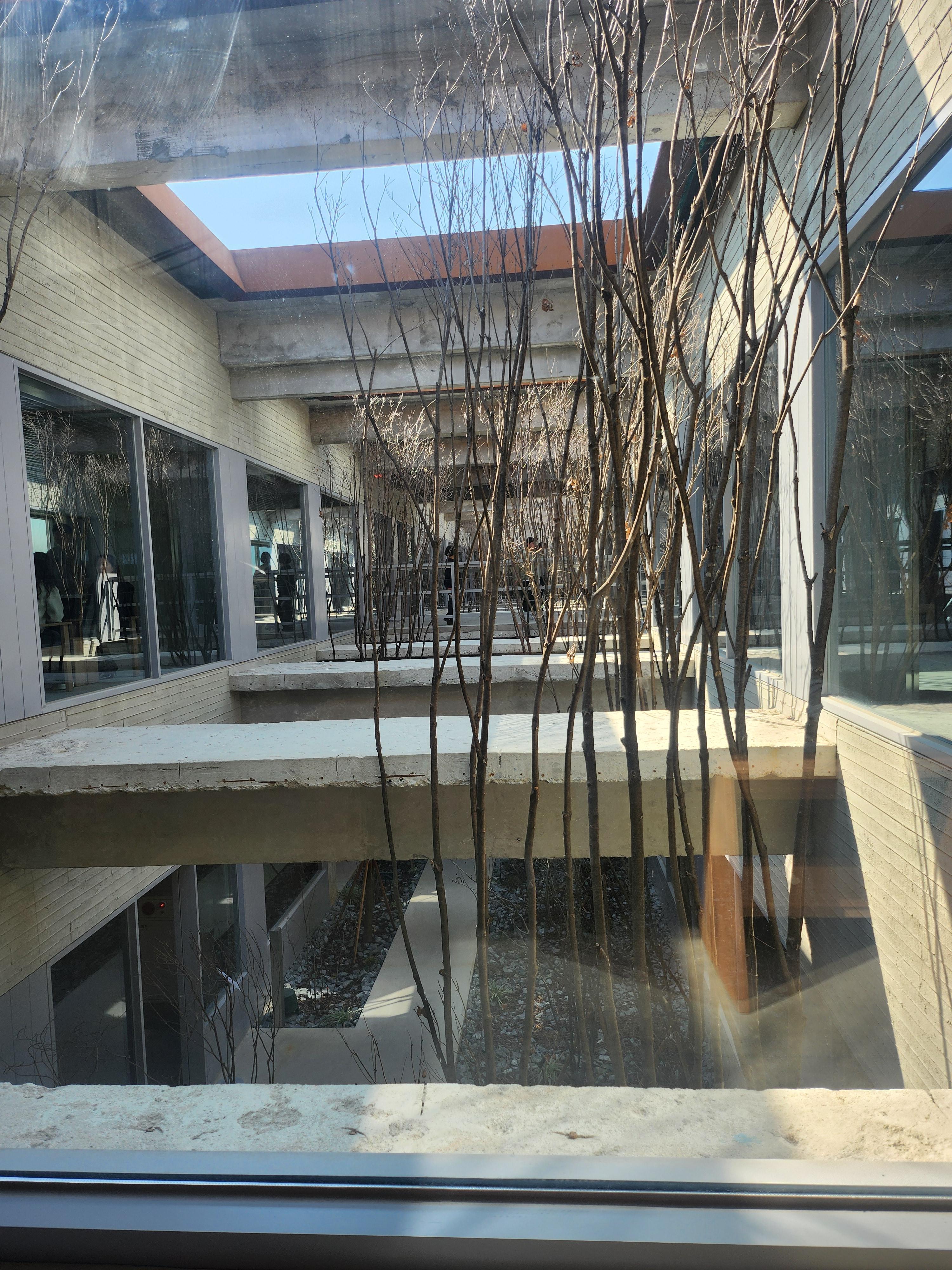 카페입구로 가보니 깊네요 건물 중간에 산책로처럼 키 큰 나무들이 심어져 있어요 화분이 아니고 그냥 땅에 심어져 있는데 천청에서 내려오는 자연채광으로 빛나고 있네요. 등도 많지만 자연채광을 받는 공간들도 많아서 좋네요