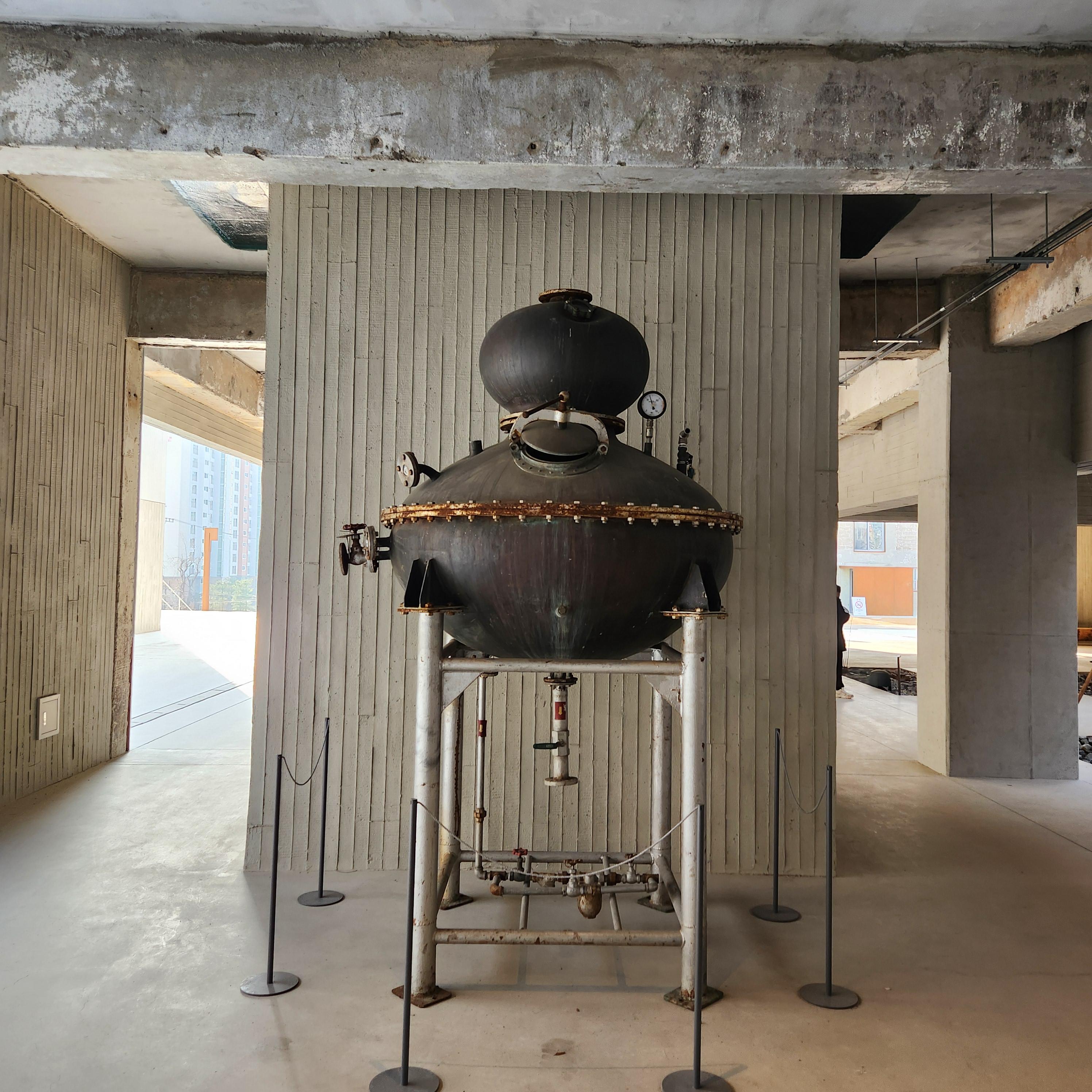 이곳이 양조장 있다는 게 여기저기 보이네요 잘 모르지만 술을 증류하던 기계인 듯하지요 아래 기계는 수제 맥주를 만드는 곳에 갔을 때 보았던 기구들이 있네요 지금도 전기를 올리면 열심히 돌아가기라 할 거처럼 반짝이는 게 웅장하네요 폐공장에 오픈하는 카페에서만 볼 수 있는 평진 풍경이지요