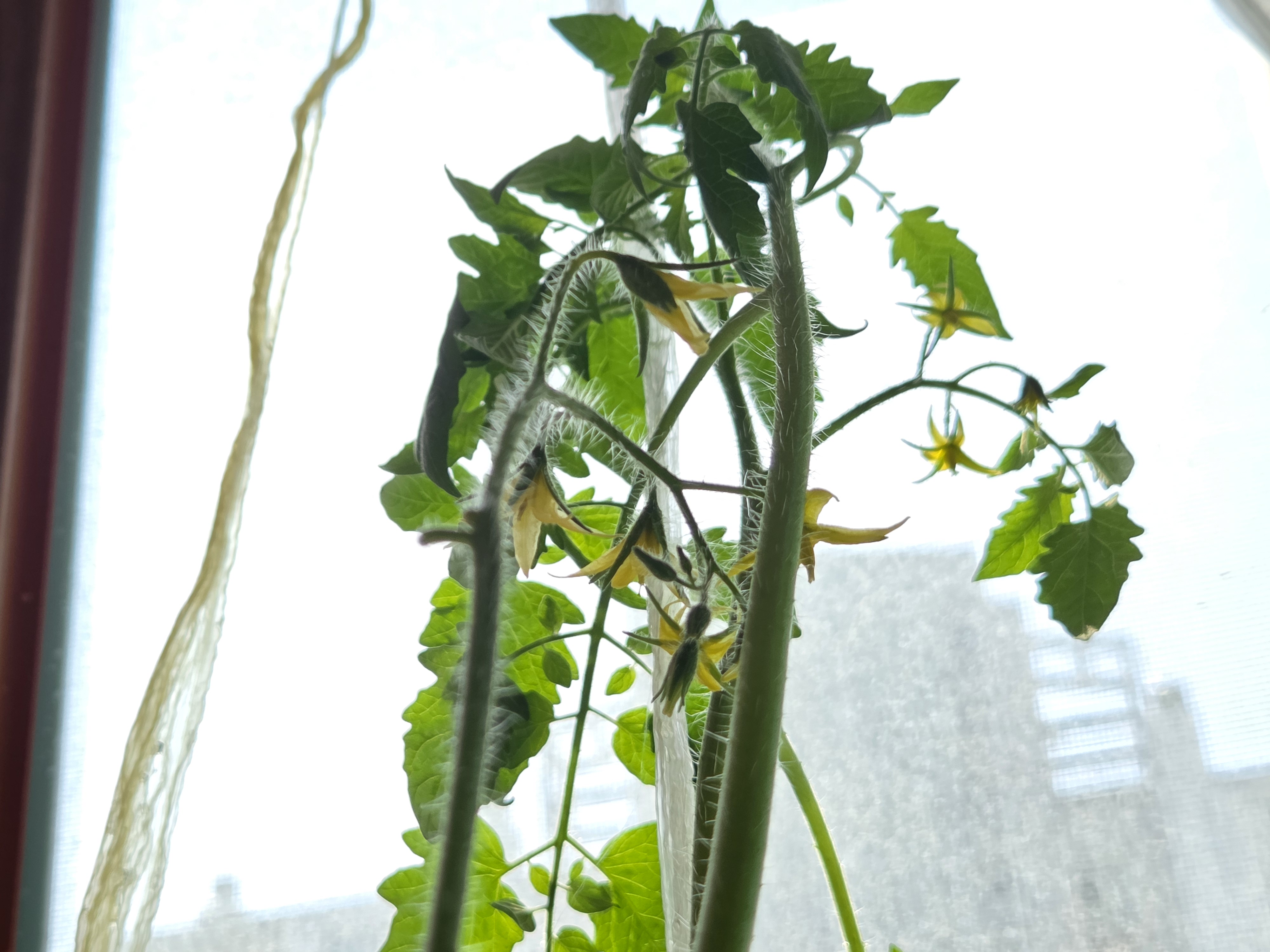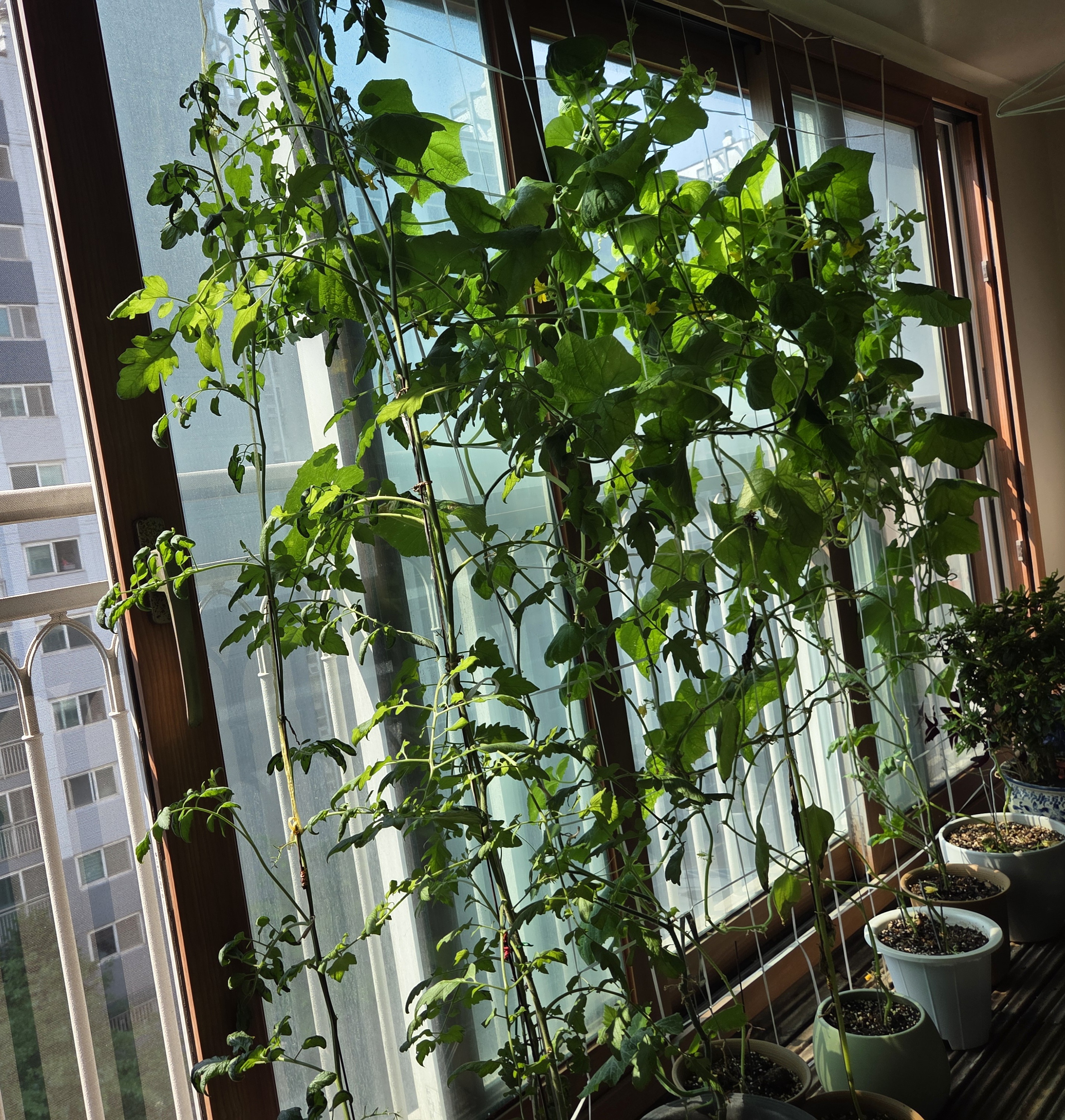 방울토마토가 얼마나 잘 자라는지 이제는 천정에 닿아있어요