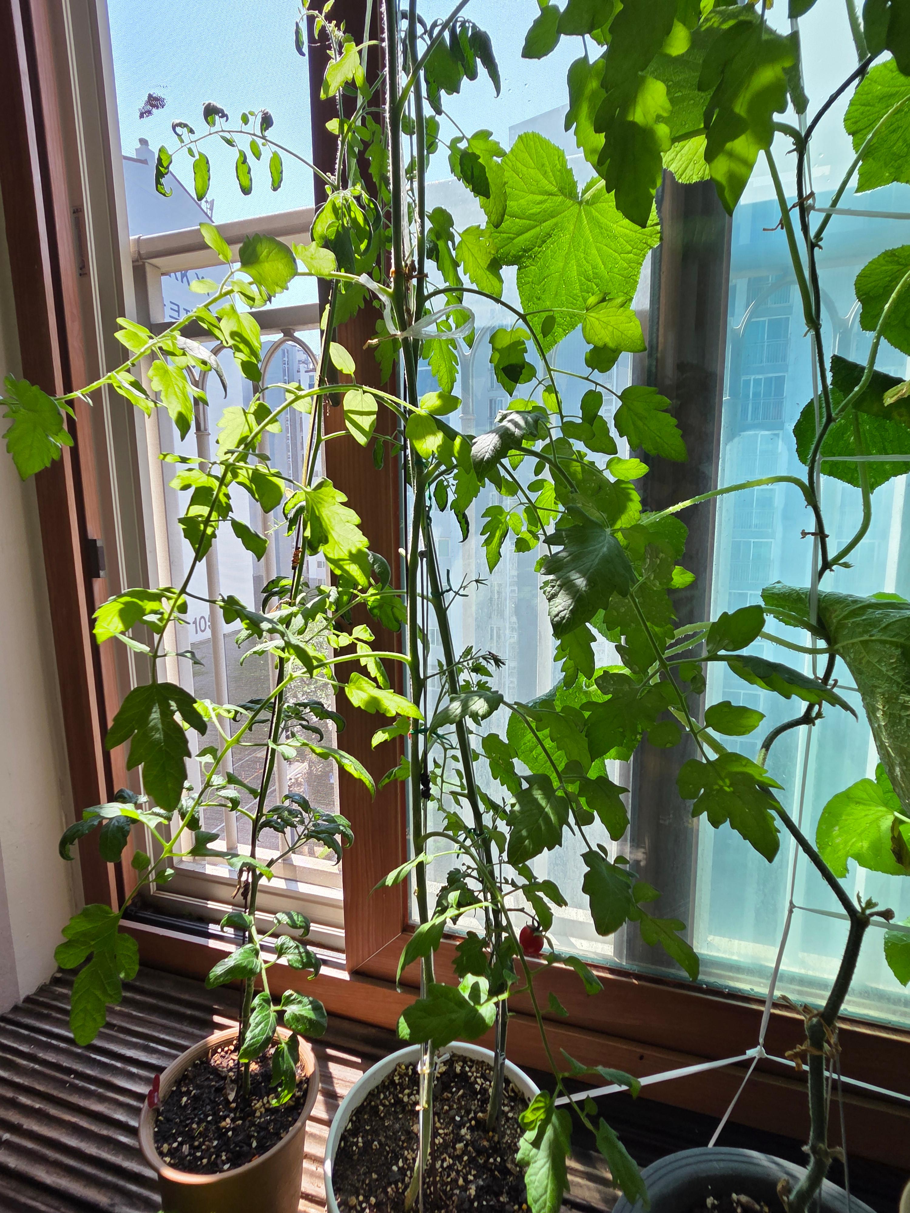 오이넝쿨, 참외넝쿨, 수박넝쿨, 호박넝쿨 그옆에 쭈~~ 욱 뻗은 방울토마토까지 초록 커튼이 되어 버렸네요
