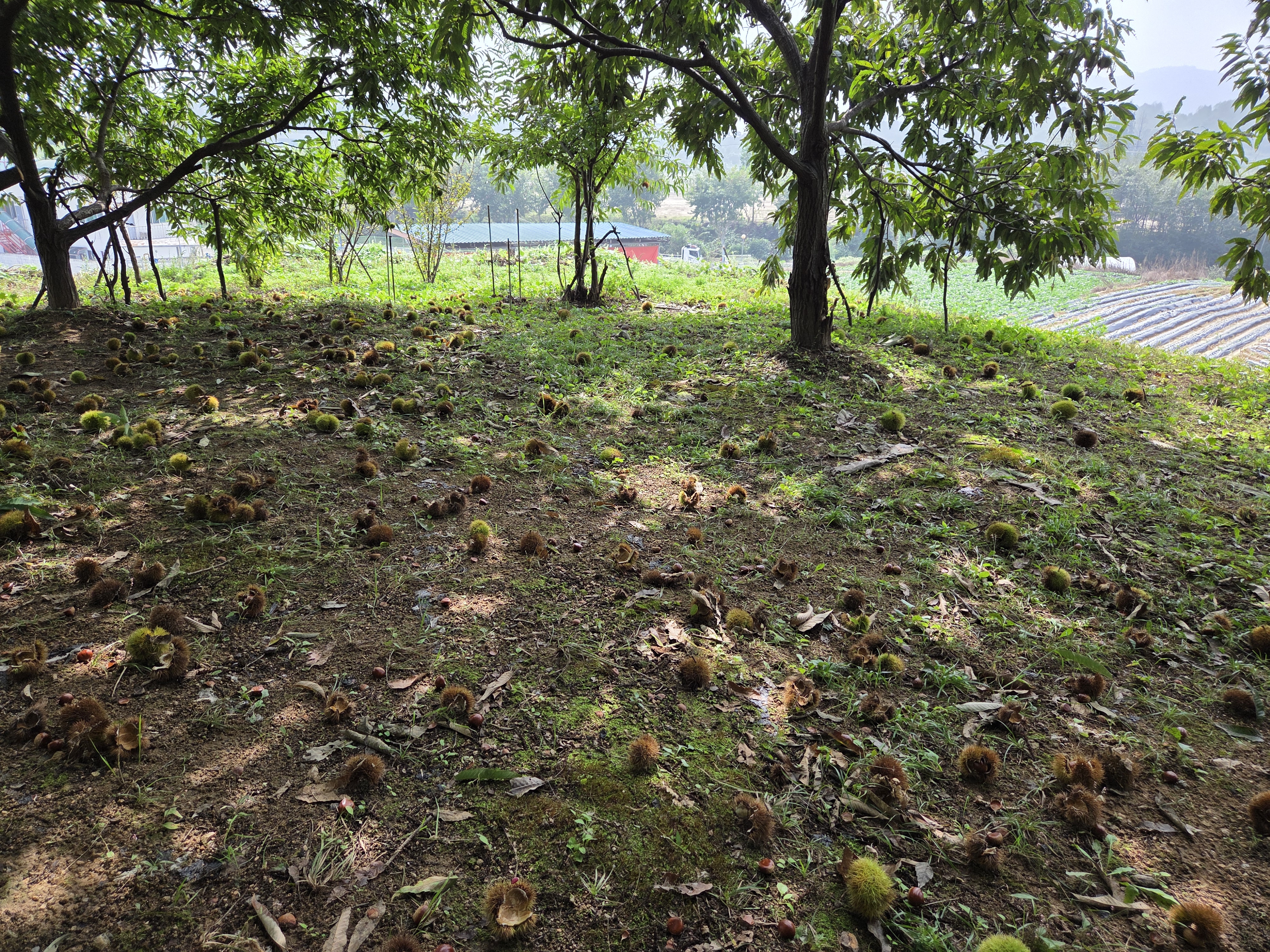 그래도 밤송이는 실한 놈들이 바닥에 많이 떨어져 있네요 처음에는 그저 밤나무가 생겨서 심었을 뿐인데 이제는 주위에 나눠 먹을 수 있을 만큼 나무가 많이 자랐어요